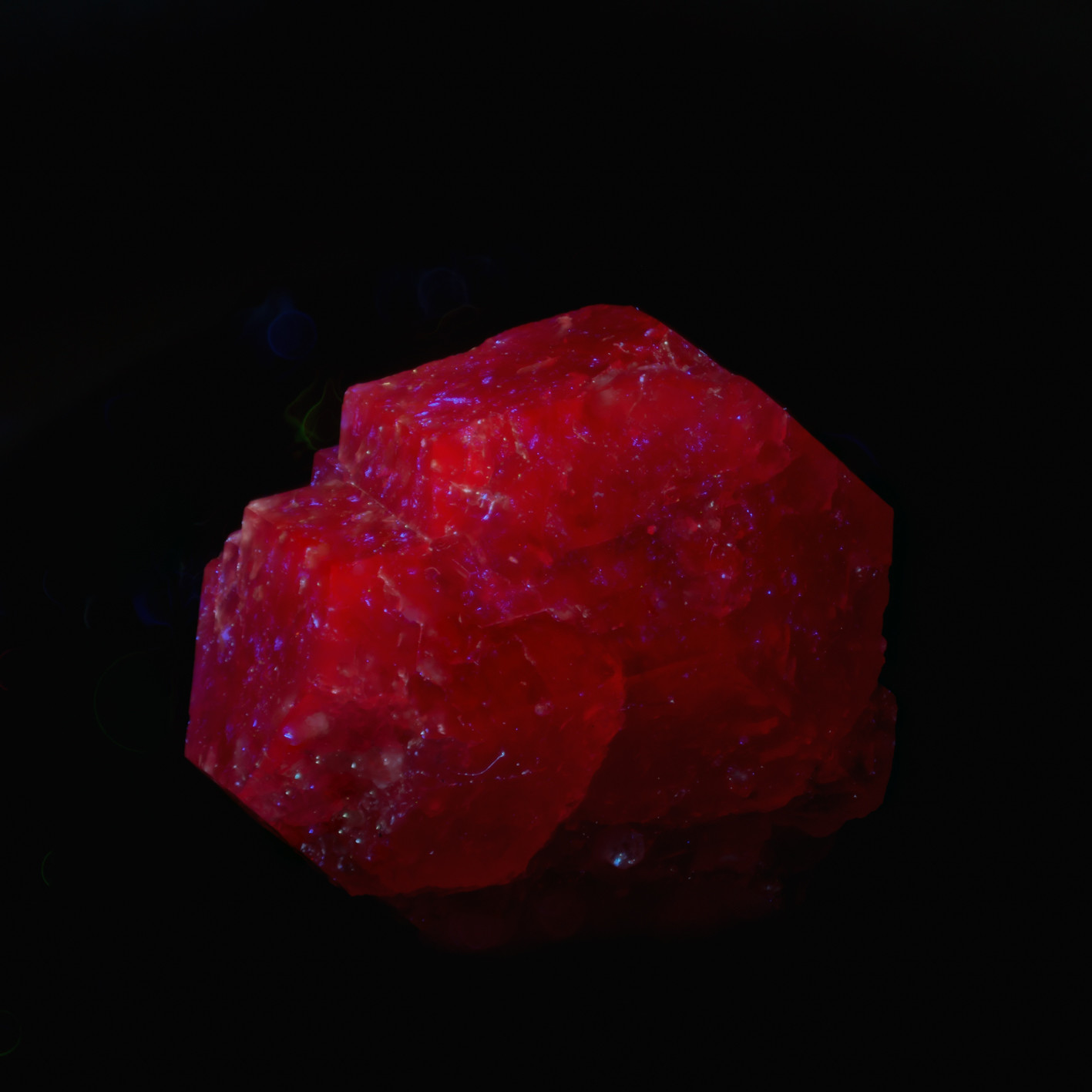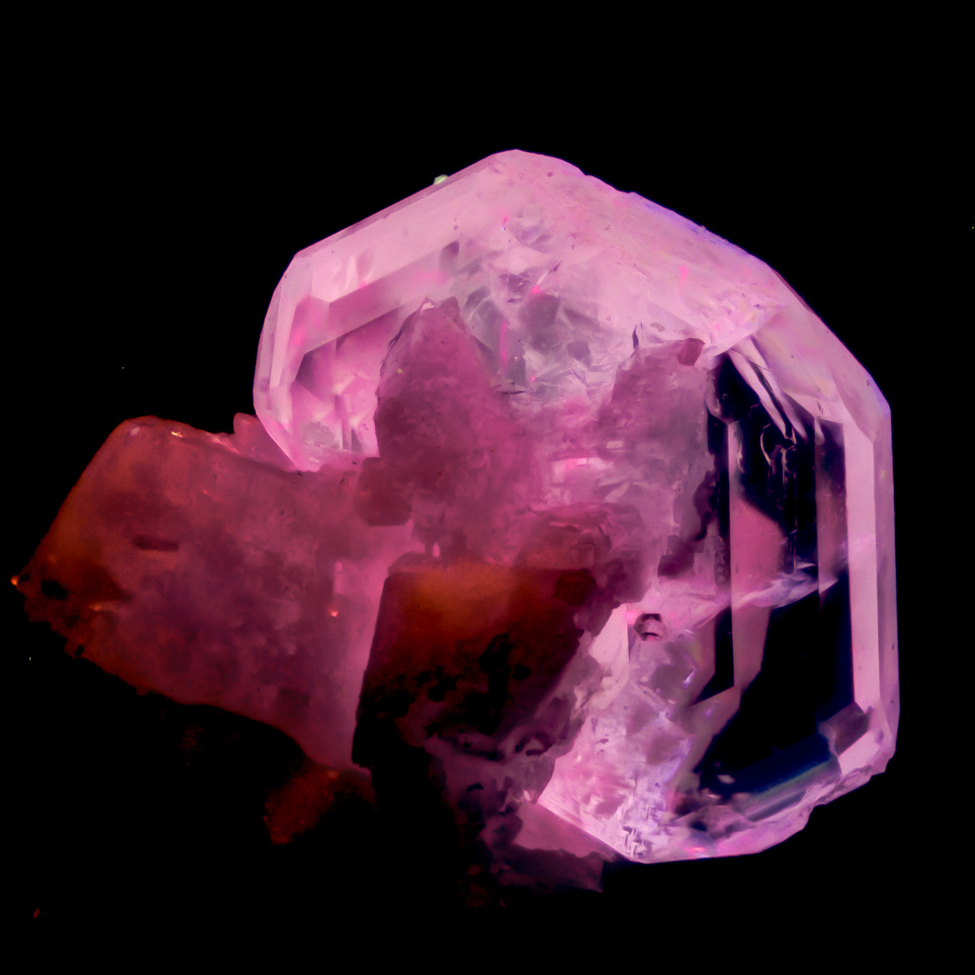 Speziell von der Sierra de Cruces in Mexiko ist manganhaltiger Grossular bekannt, der mehr oder minder intensiv himbeerfarben auftritt (7). Ähnliches Material gibt es wohl auch von anderen Fundstellen, z.B. der Jeffrey Mine/Asbestos/Québec. Wenn nun Mangan in der richtigen Konzentration eingebaut ist und kaum durch Eisen beeinflusst wird, dann ergibt sich die pinke Farbe des Grossulars (durch zusätzliches Eisen orange-braun). Und dann kann dieser Granat leuchten. Dabei liegt die Mn-Konzentration über der des Eisens, ist aber dennoch eher gering, z.B.(Ref. 7): Ca2.94Mn2+0.1Al1.9Mg0.09Fe3+0.05Mn3+0.01Si2.97O12