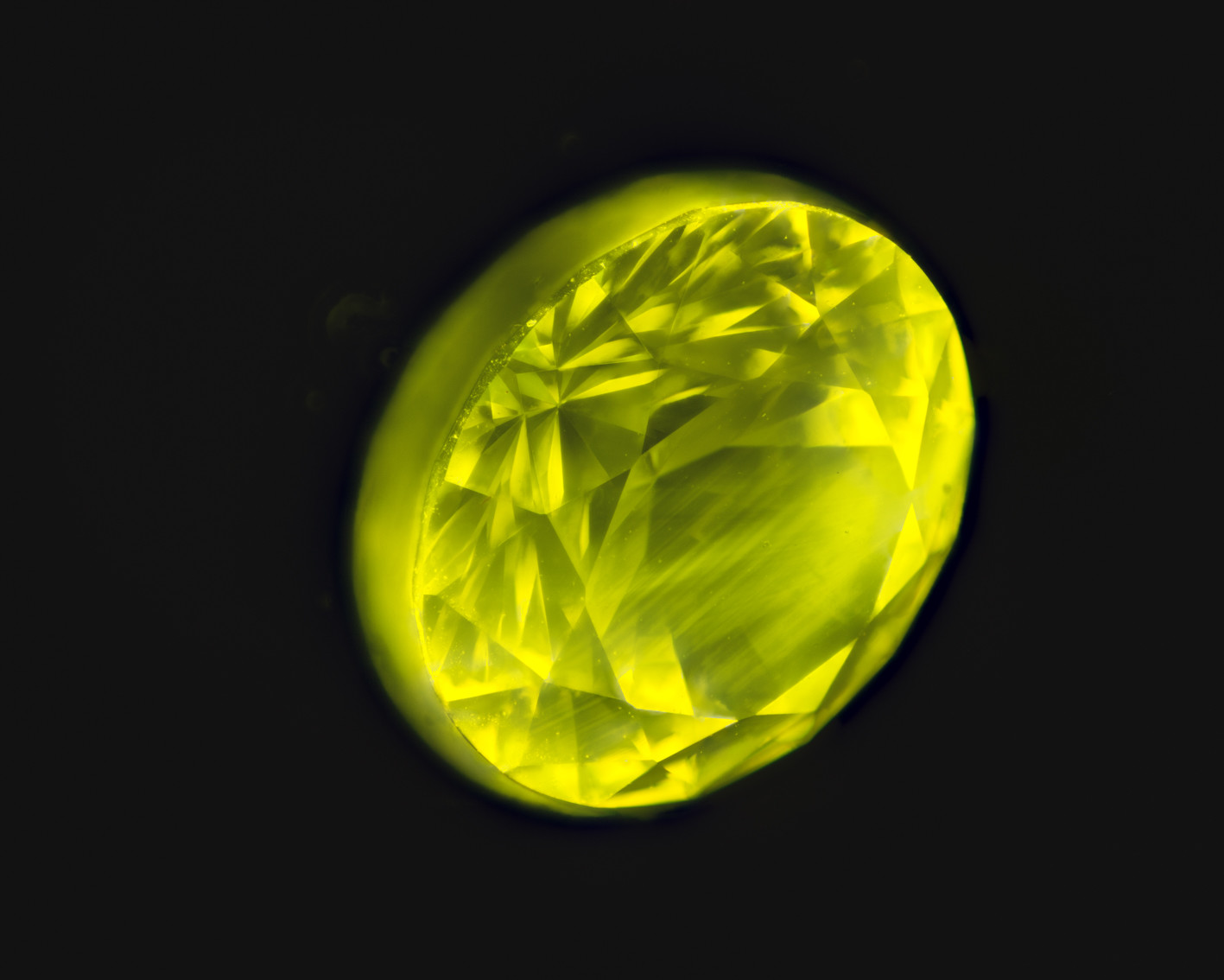 Um das greifbarer zu machen, zeigen die nachfolgenden Bilder einen geschliffenen Kristall - YAG:Ce (Y3Al5O12:Ce3+). Unter Beleuchtung mit UV (ca 340 nm) aber vor allem unter Beleuchtung mit blauem Licht (460 nm) leuchtet YAG:Ce intensiv gelb (peak 560 nm, centroid 588 nm), cgl Ref 6. Dies macht diesen Leuchtstoff perfekt geeignet, um zusammen mit einer blauen LED eingesetzt zu werden: das Ergebniss sind die Weisslicht-LED, wobei weiß aus blau+gelb entsteht.