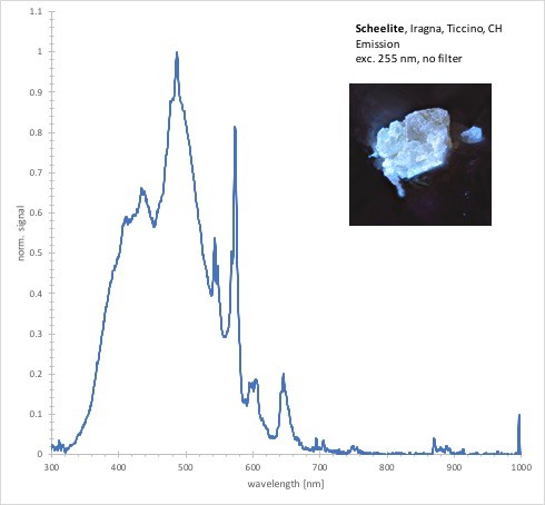 Vor kurzem bekam ich netterweise ein Spektrometer geliehen (vielen Dank!) - und habe auch ein bisschen herumprobiert. Dabei kommt man immer wieder auf interessante Sachen. Scheelit zum Beispiel. Einige Scheelite in meiner Sammlung leuchten je nach Anregungswellenlänge unterschiedlich: blauweiss, gelb und rot. Das hängt nicht so sehr am Fundort, meine Scheelite sind von  der Grube Clara, Zinnwald und von Iragna/Tessin. Hier zeige ich Bilder des Stücks von Iragna als Beispiel.