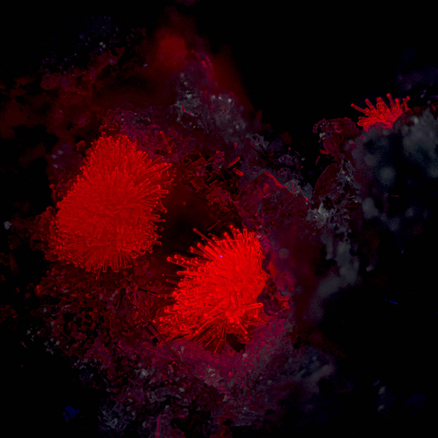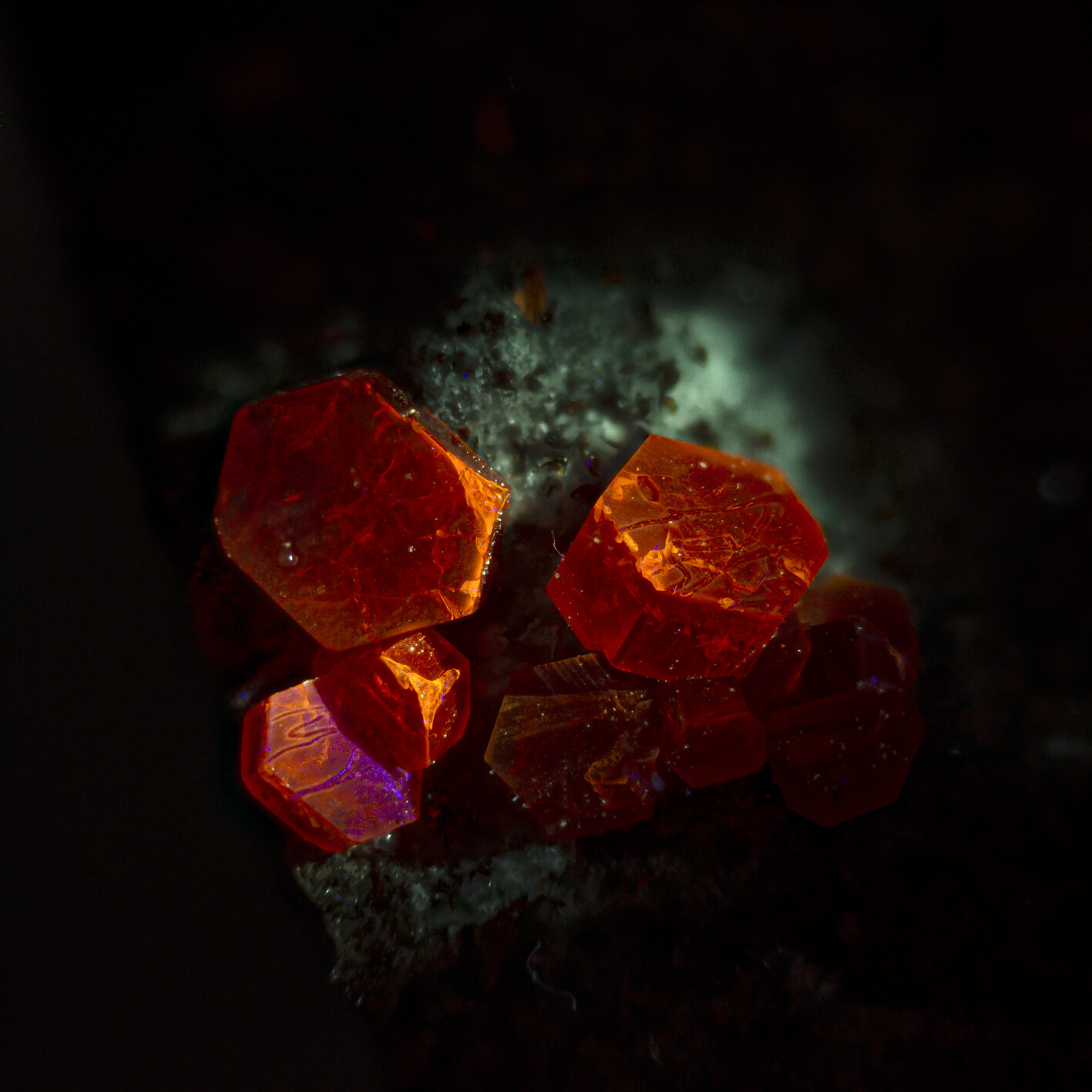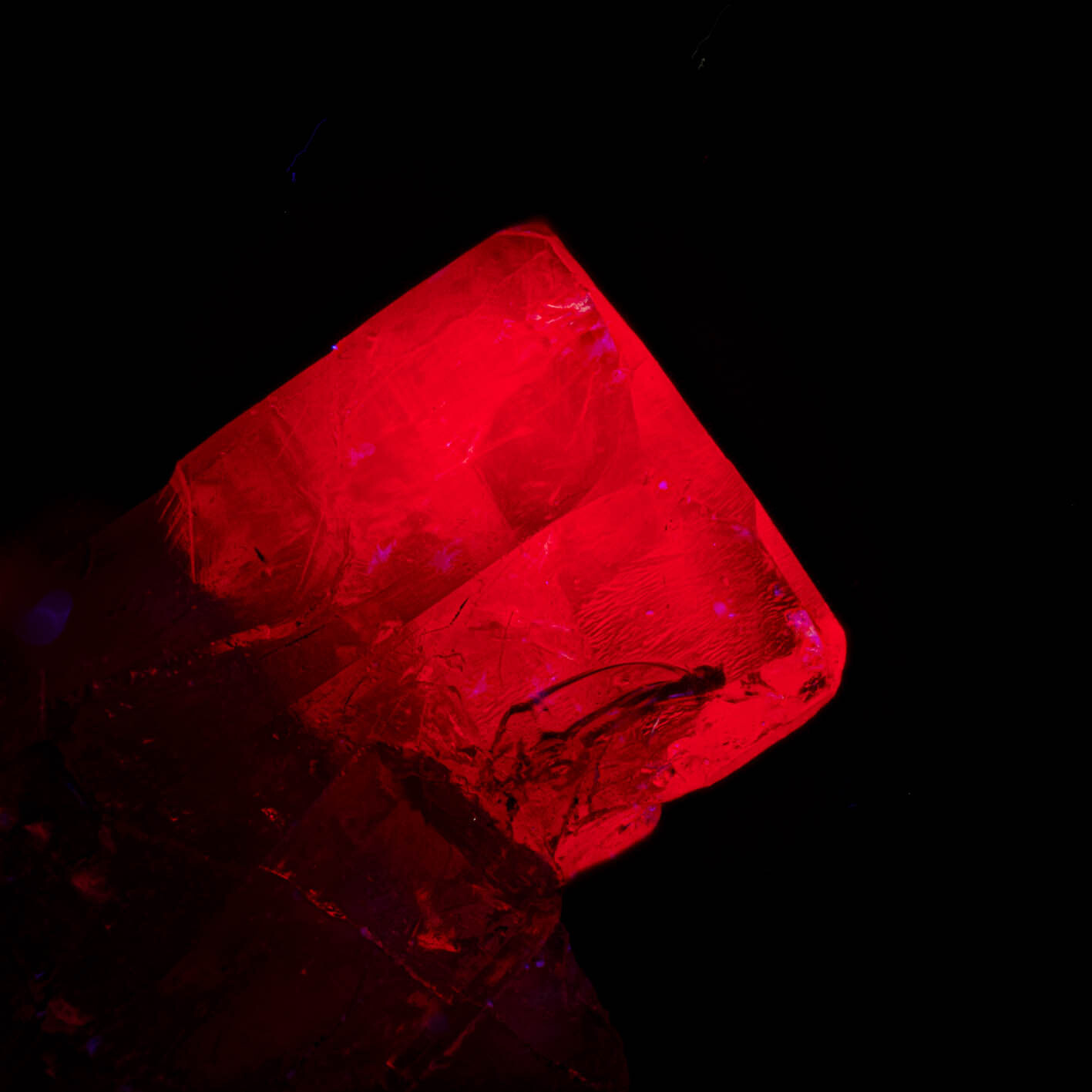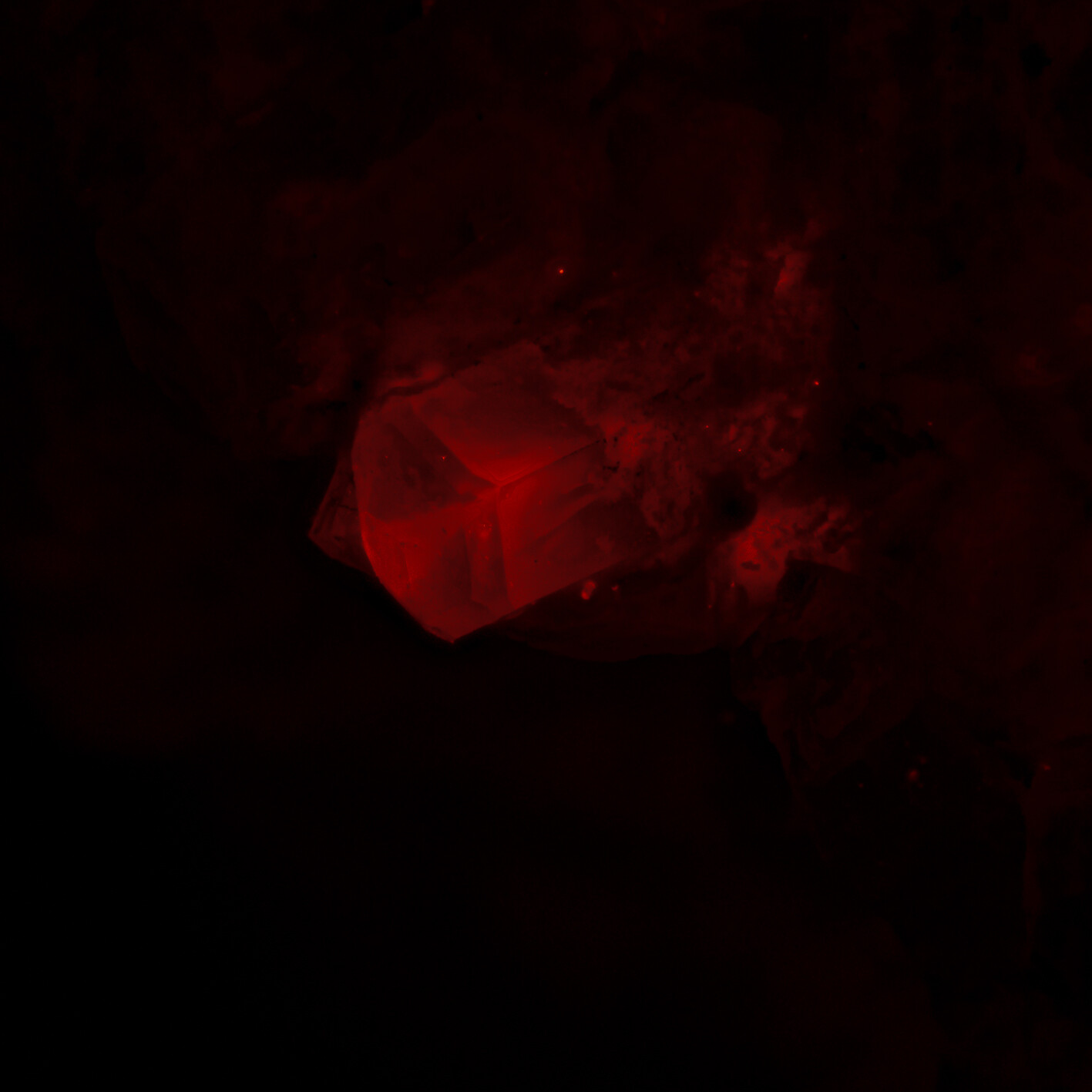 Für mich war das eine sehr erstaunliche Entdeckung! Alle meine Topase von den Eifel-Fundstellen leuchten intensiv rot - bei Beleuchtung mit 405 nm bzw 450nm. Bei 365 nm Anregung hingegen leuchten sie kaum, unter 255 nm dann - weiss!