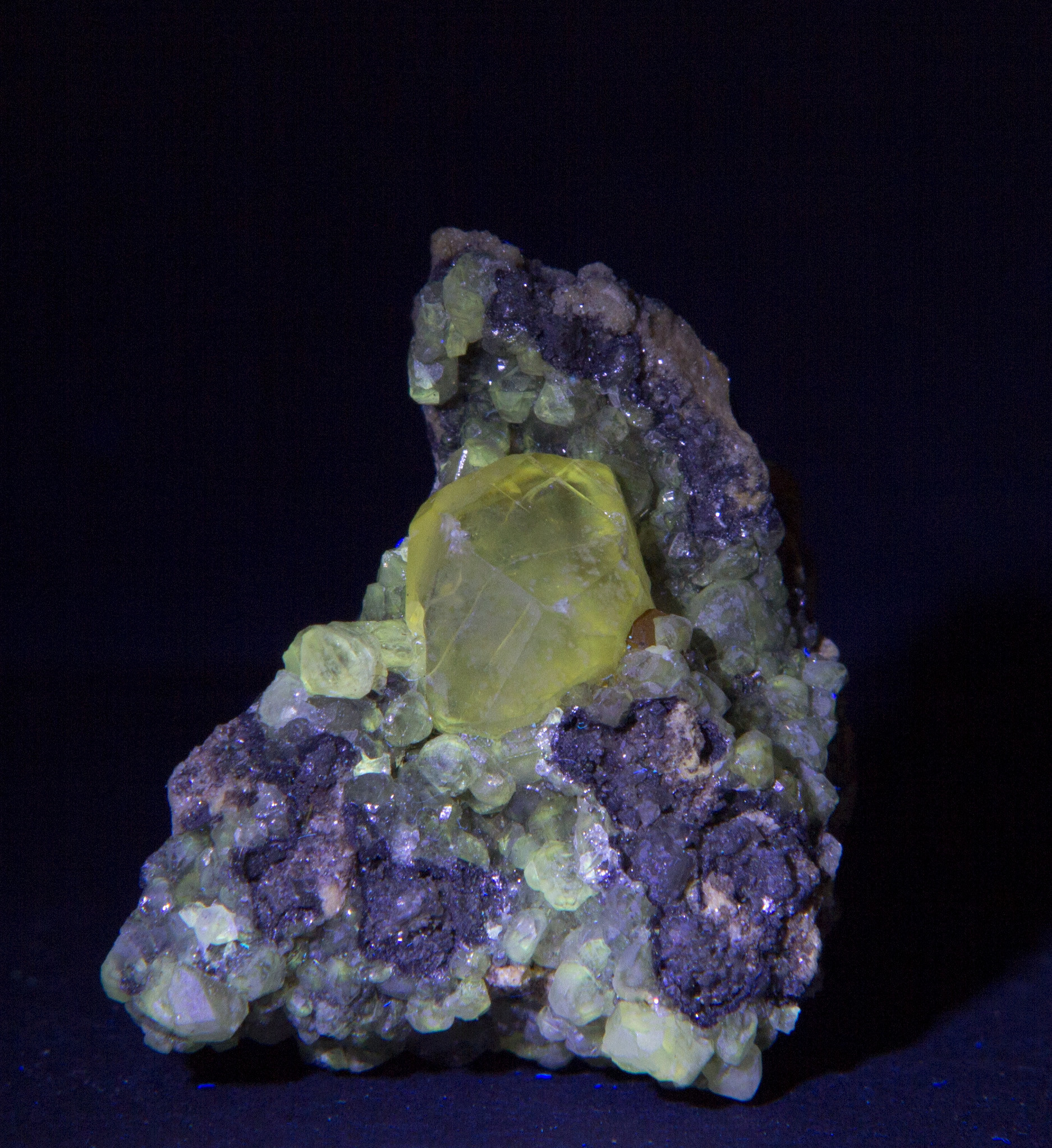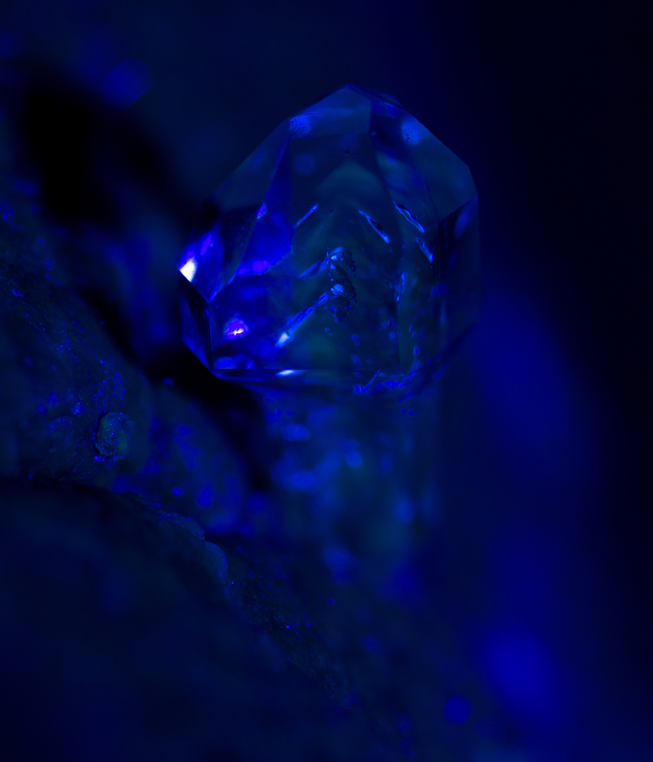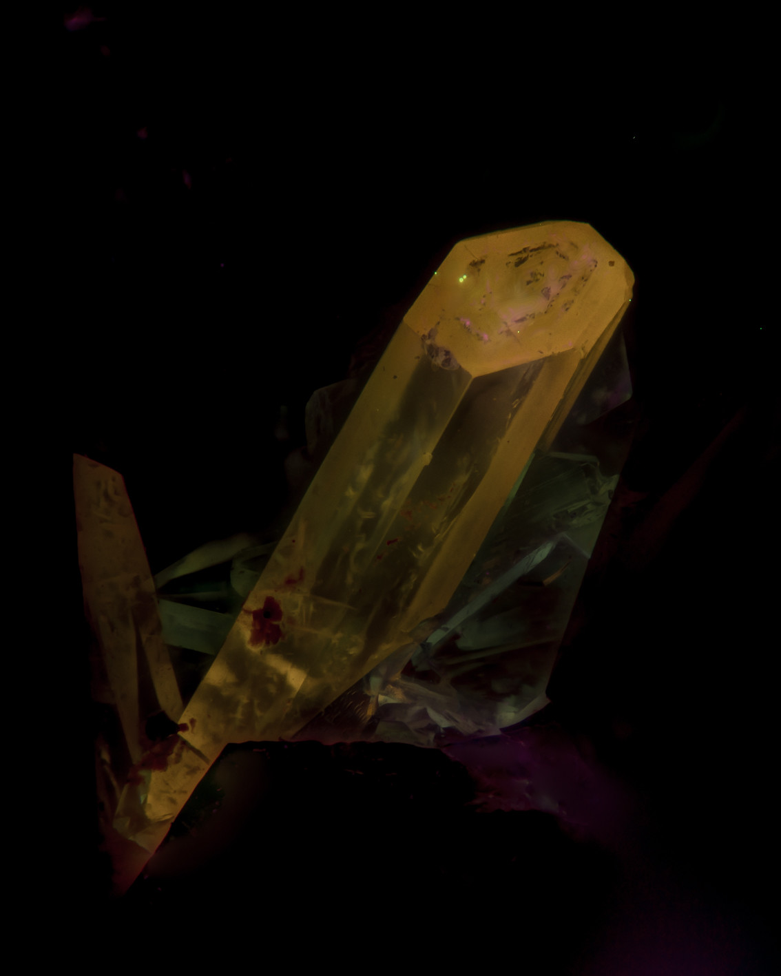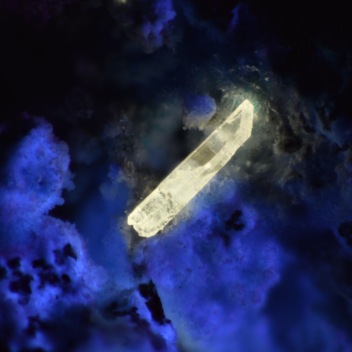 intrisische Lumineszenz von Cerussit: Anregung UV KW - Emission grünlich-gelbweiss betrachtet werden (1a). Sie tritt auch in synthtischen Cerussit ("Bleiweiss") auf (1a).