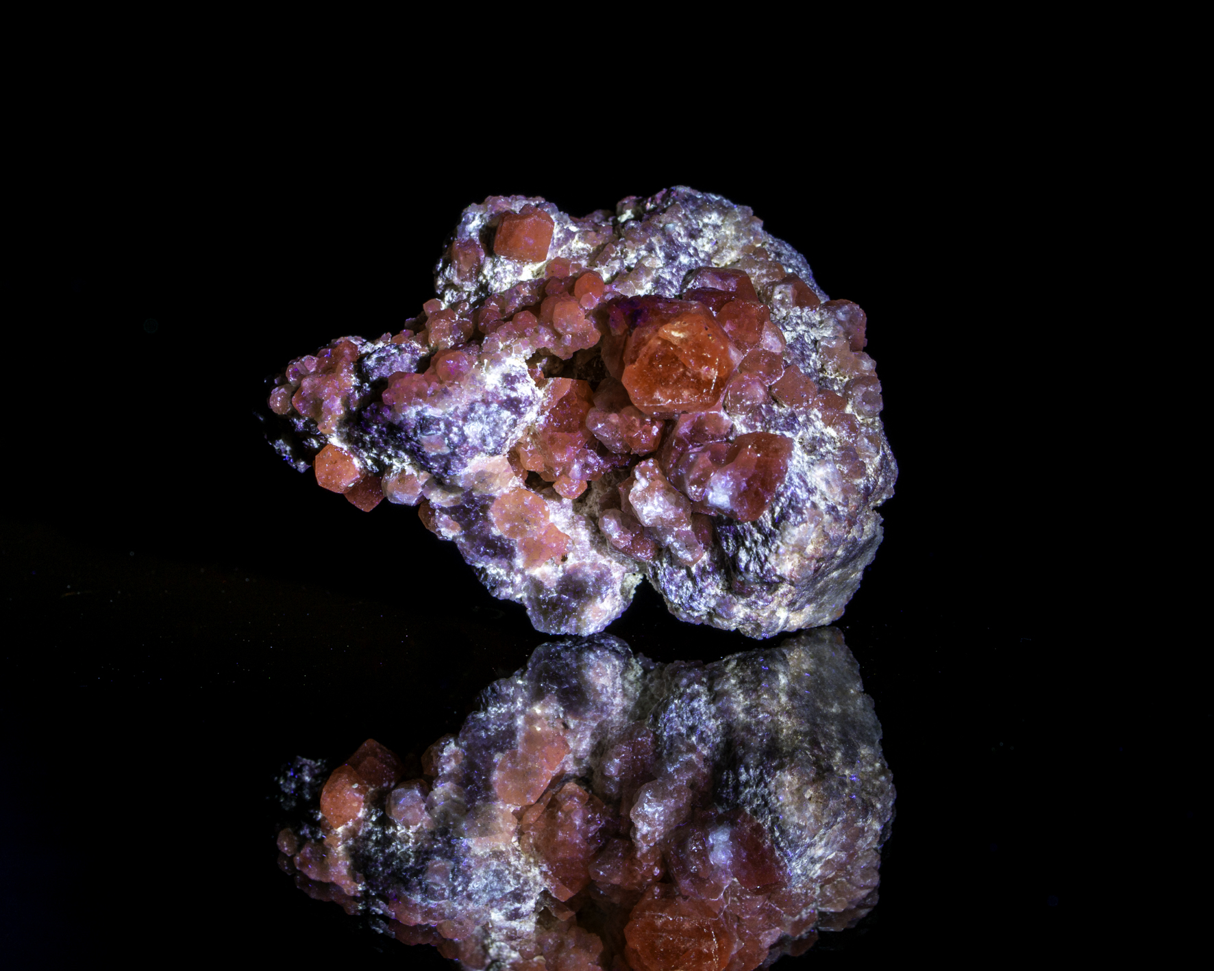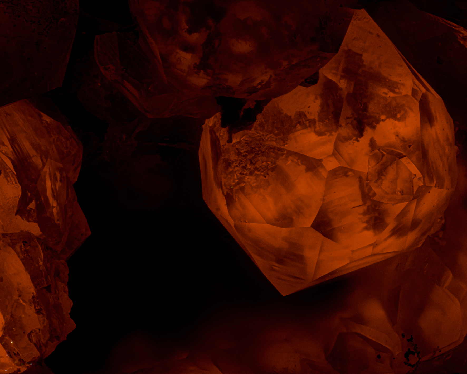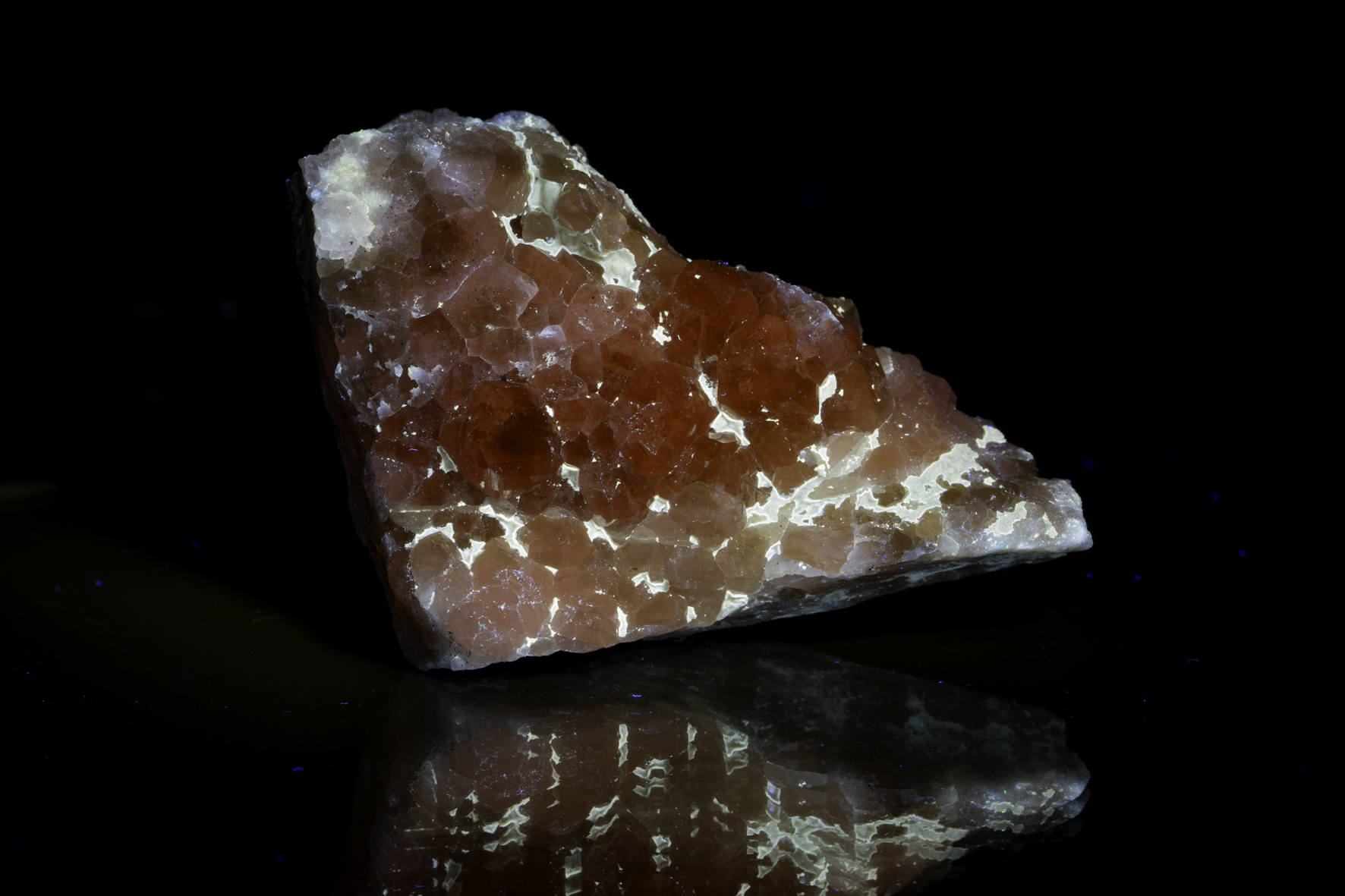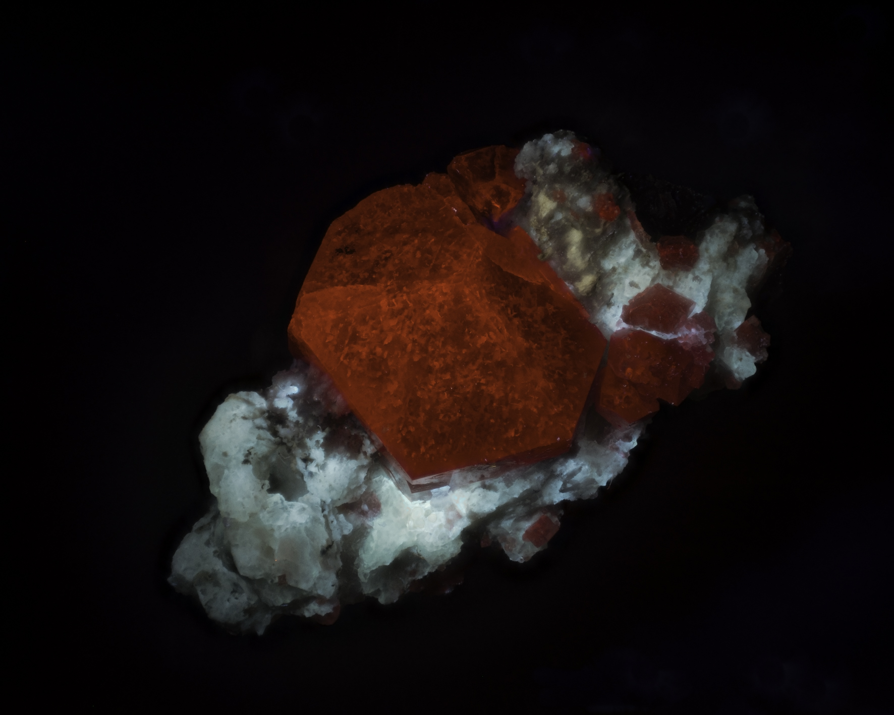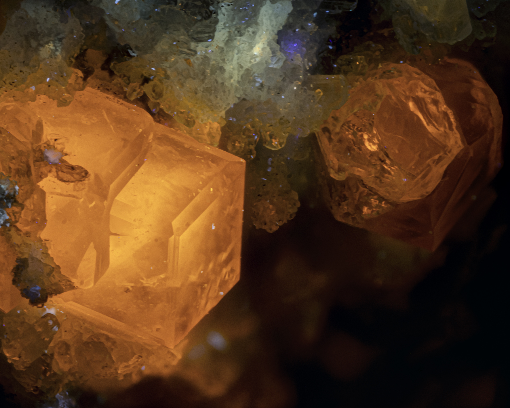 Grossular vom Stifle Claim. Dunkelrote Bereiche (Anregung 365nm) zeigen die oben genannte Emission der zero phonon line von Mn