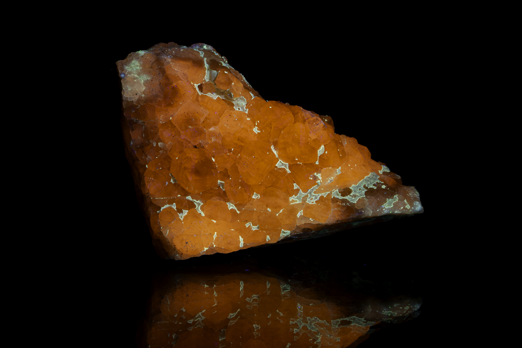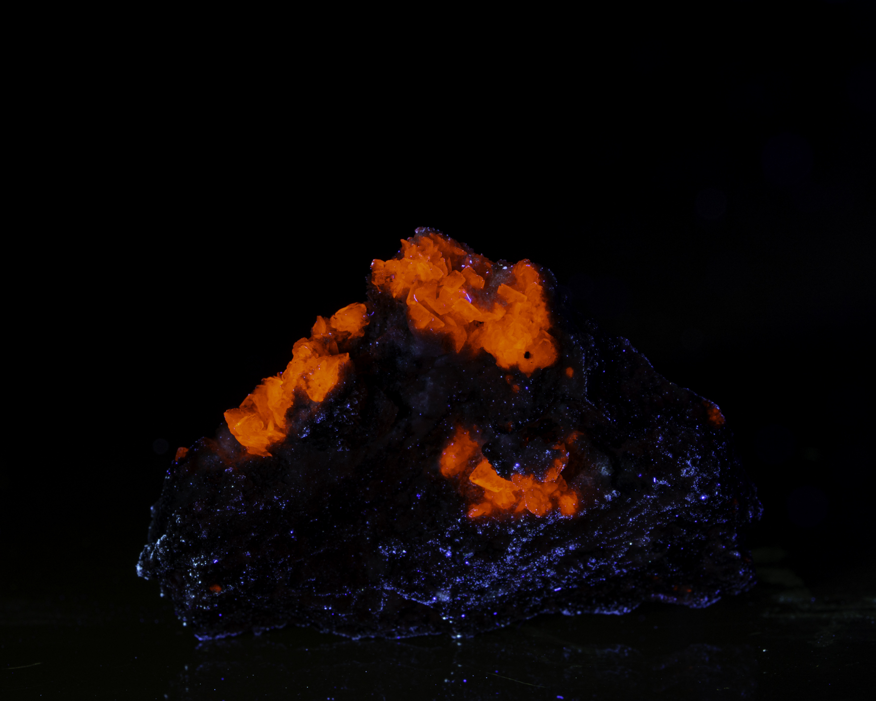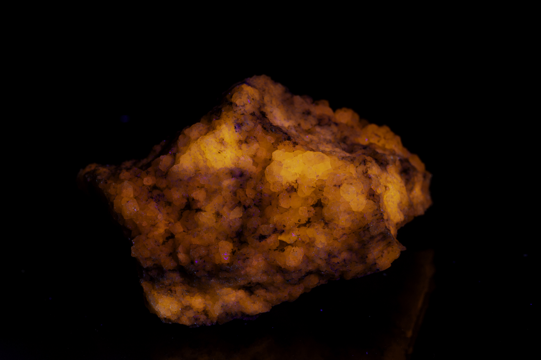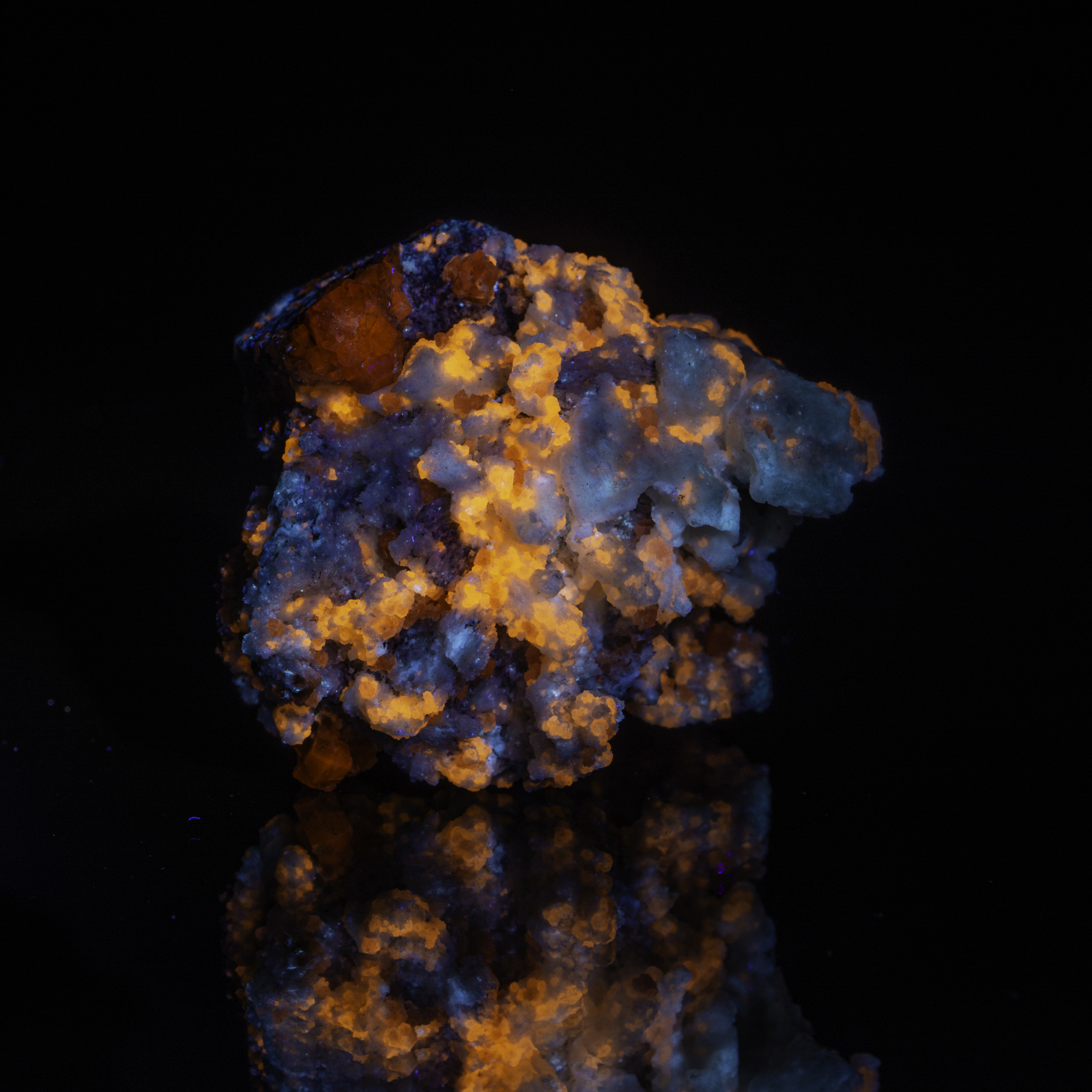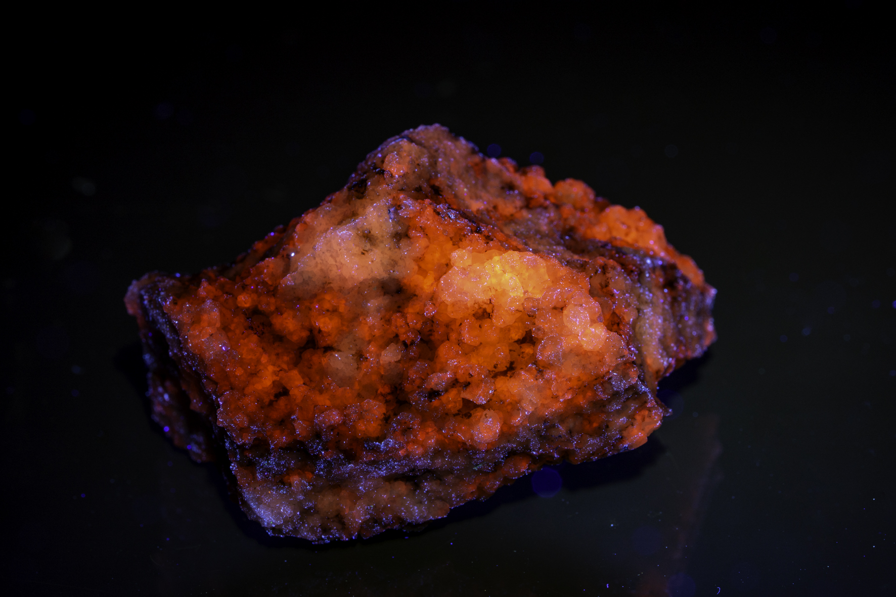 Sierra de Cruces zwei Stücke zum Vergleichen. Insbesondere bei 405nm Anregung sieht man auf dem einen Stück deutlich, dass auch reine gelborange Mn