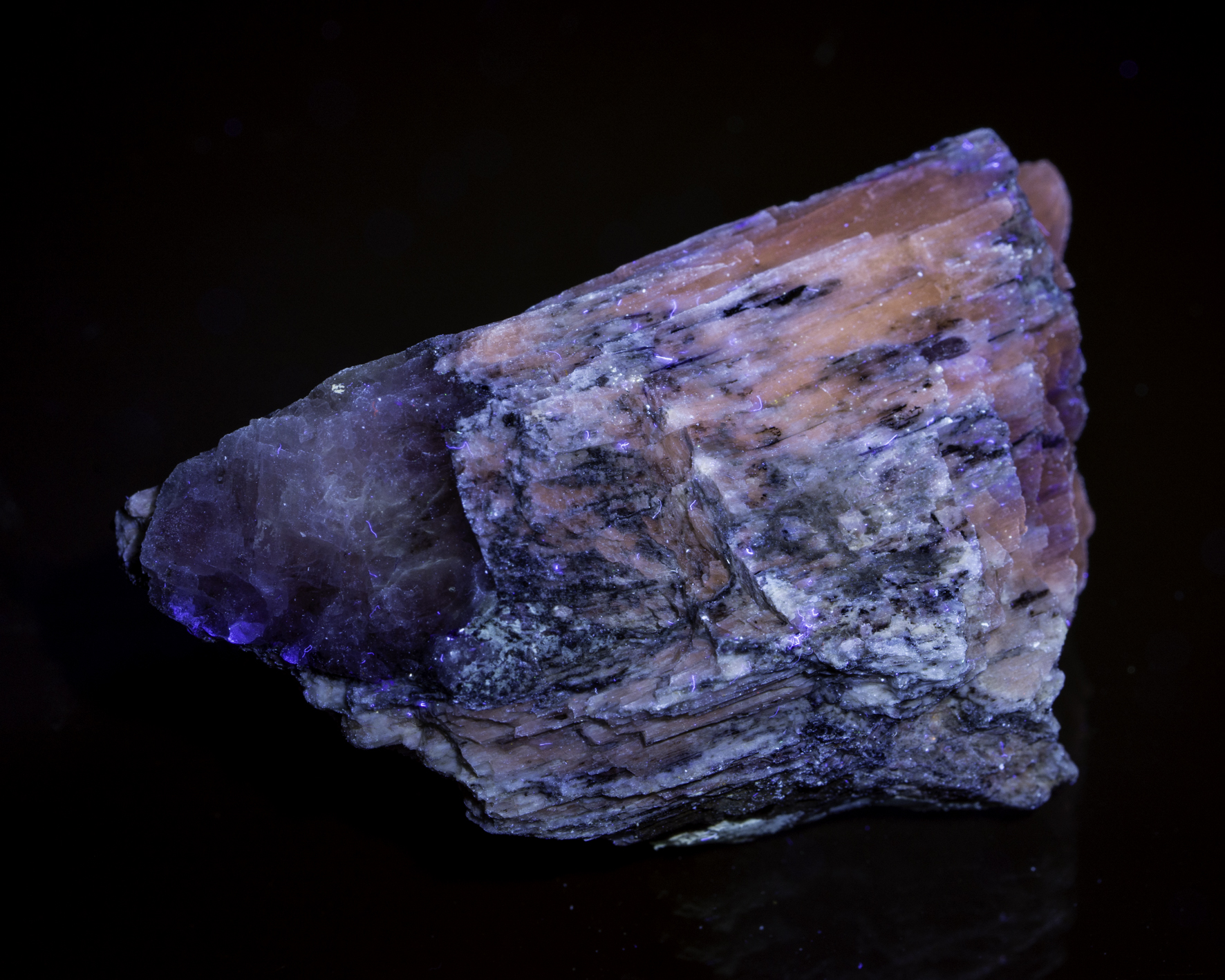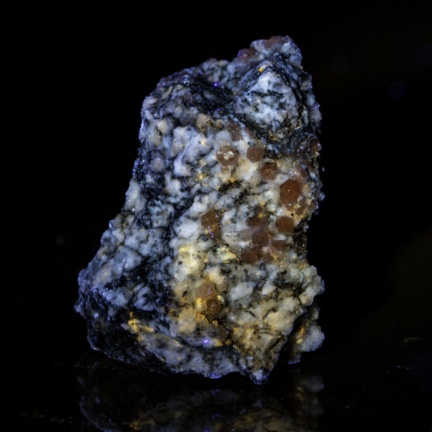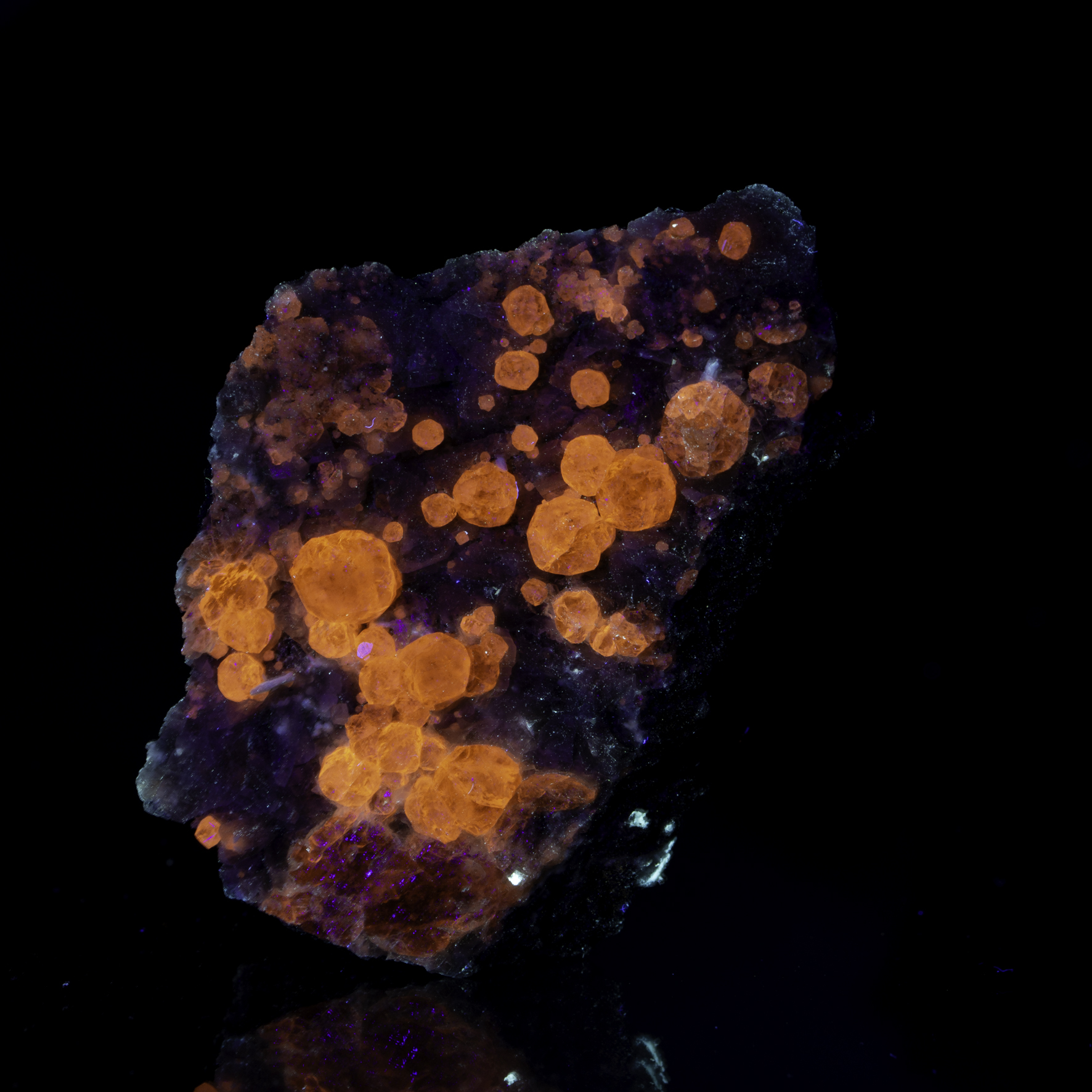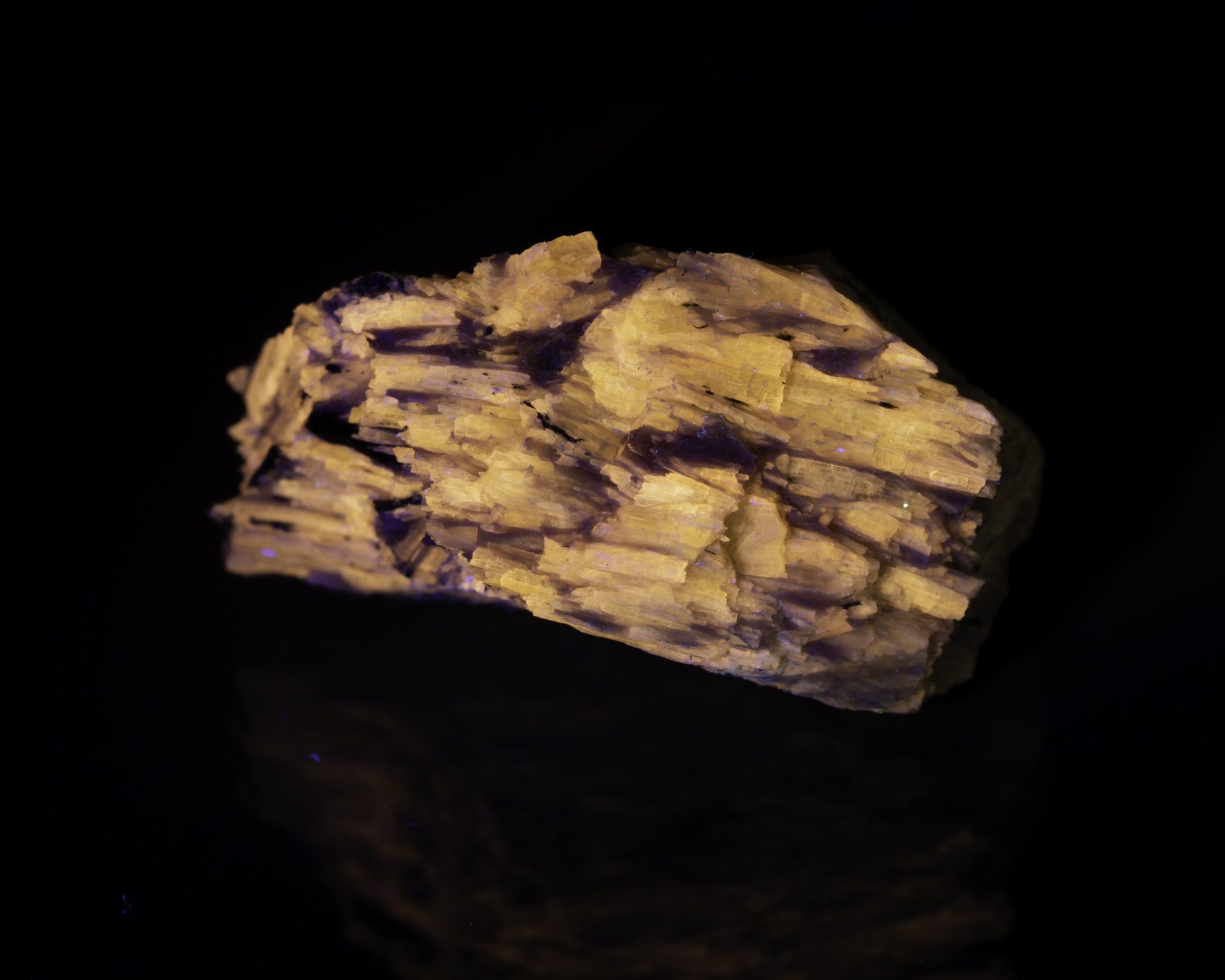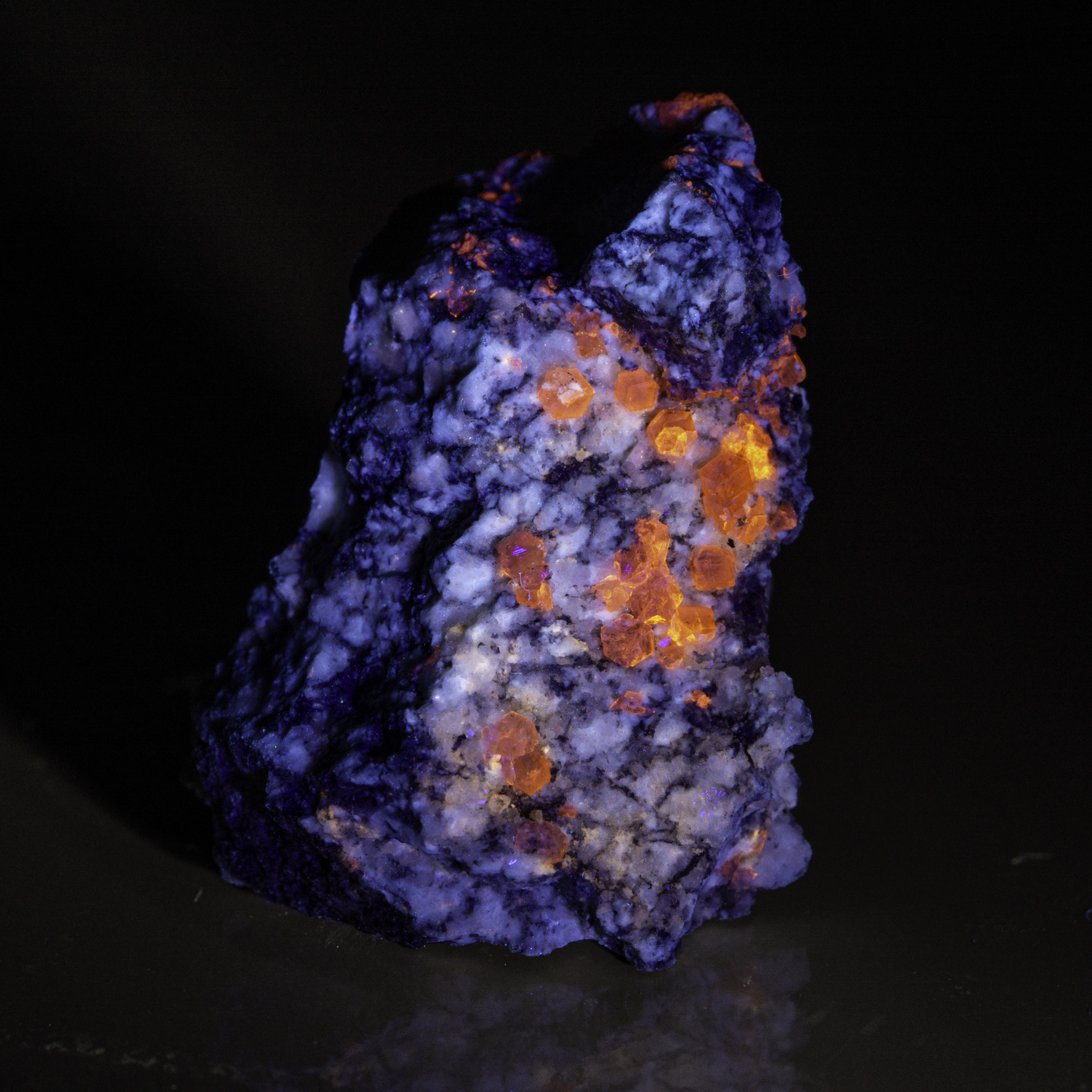 Sierra de Cruces zwei Stücke zum Vergleichen. Insbesondere bei 405nm Anregung sieht man auf dem einen Stück deutlich, dass auch reine gelborange Mn