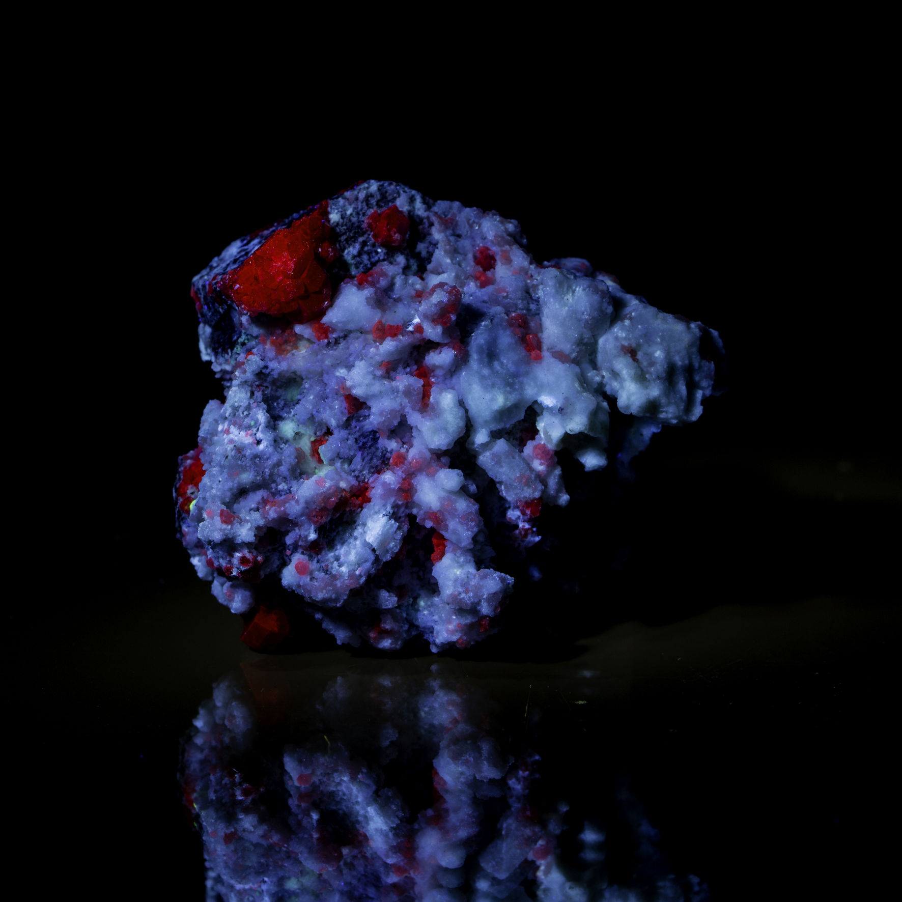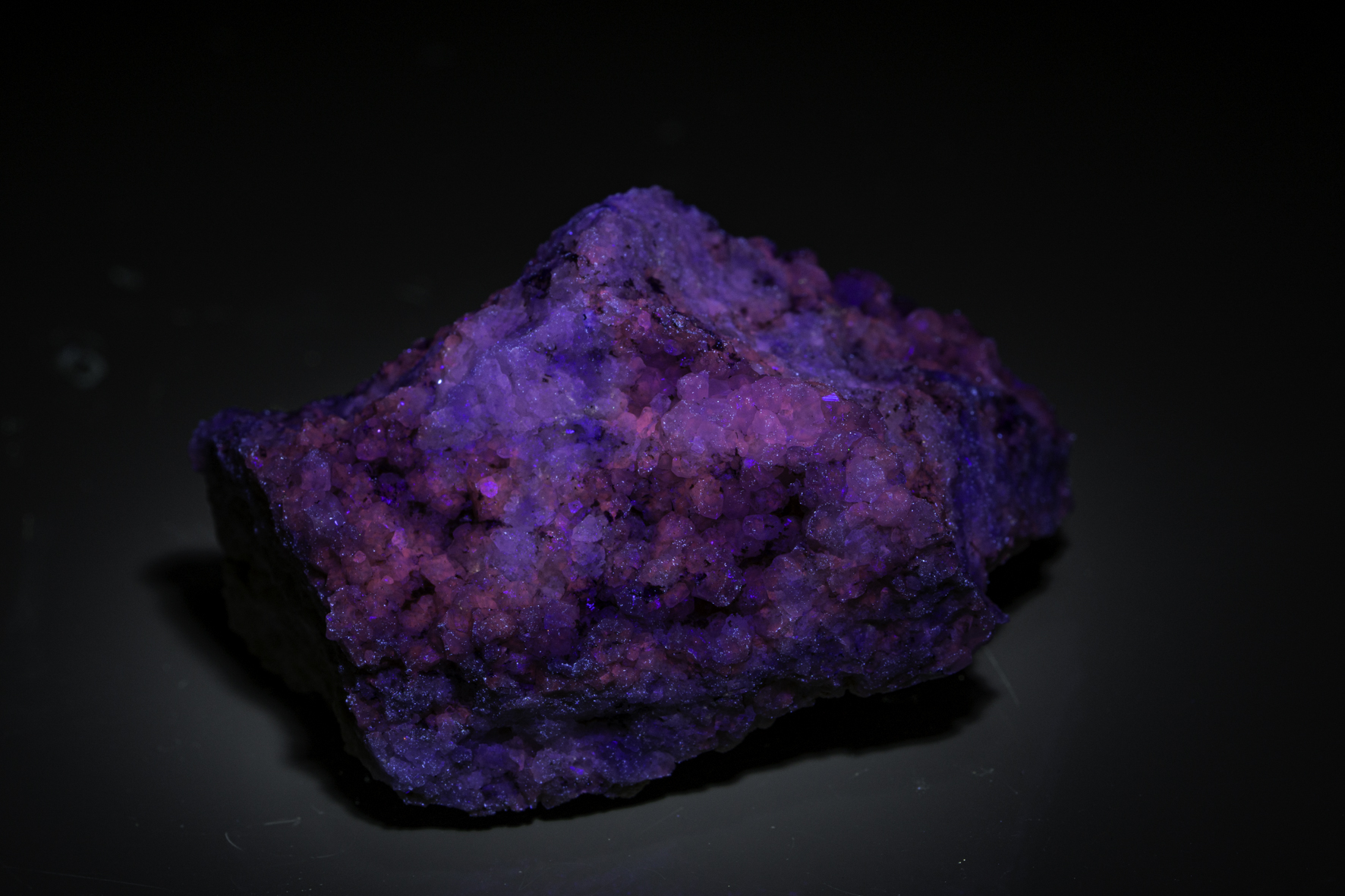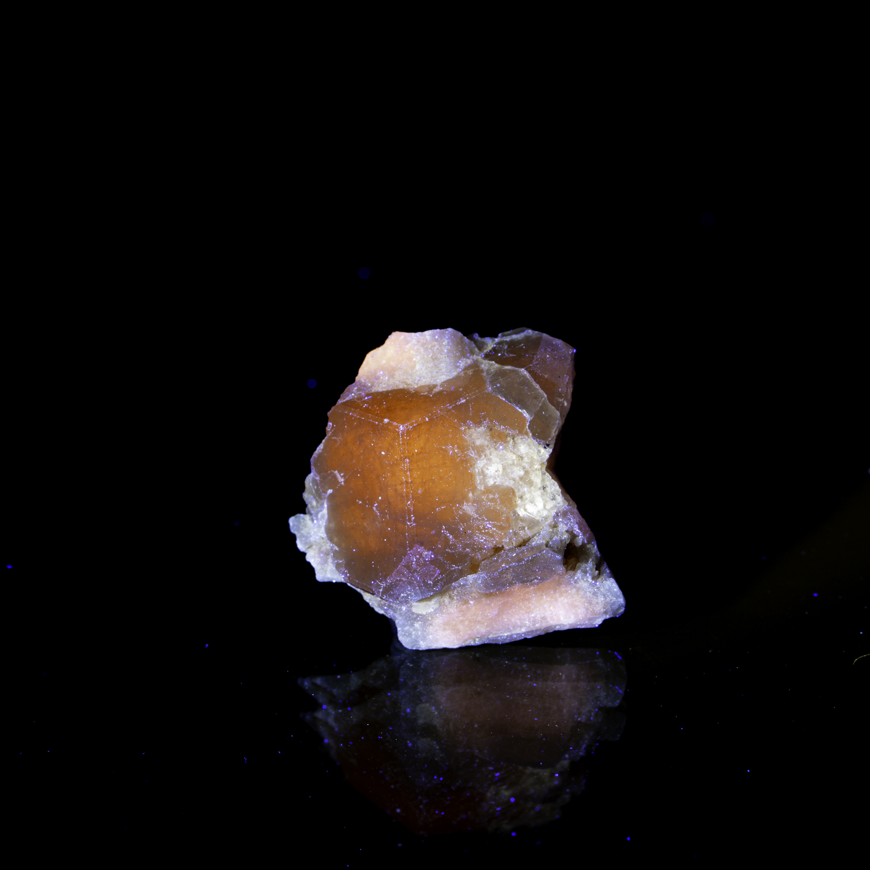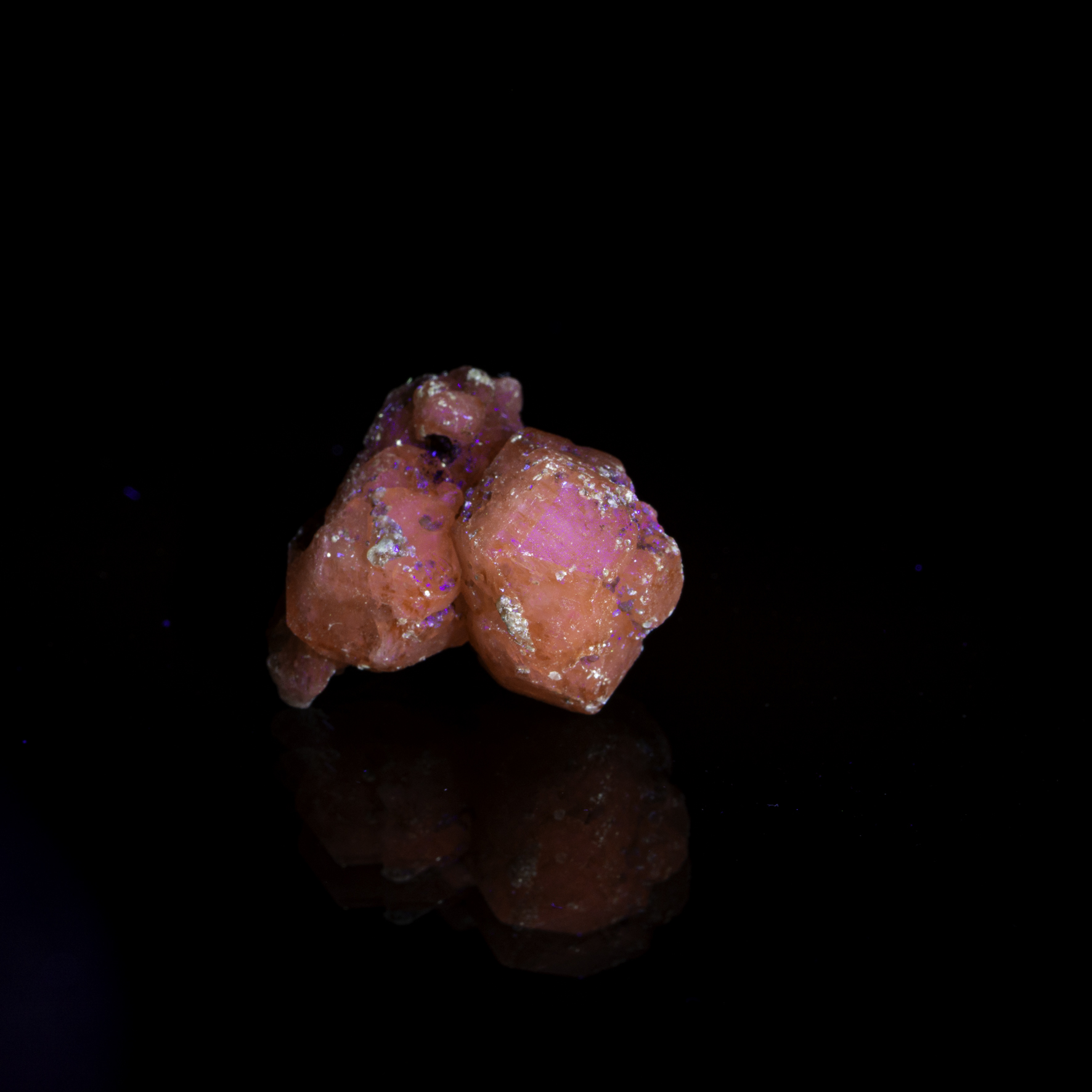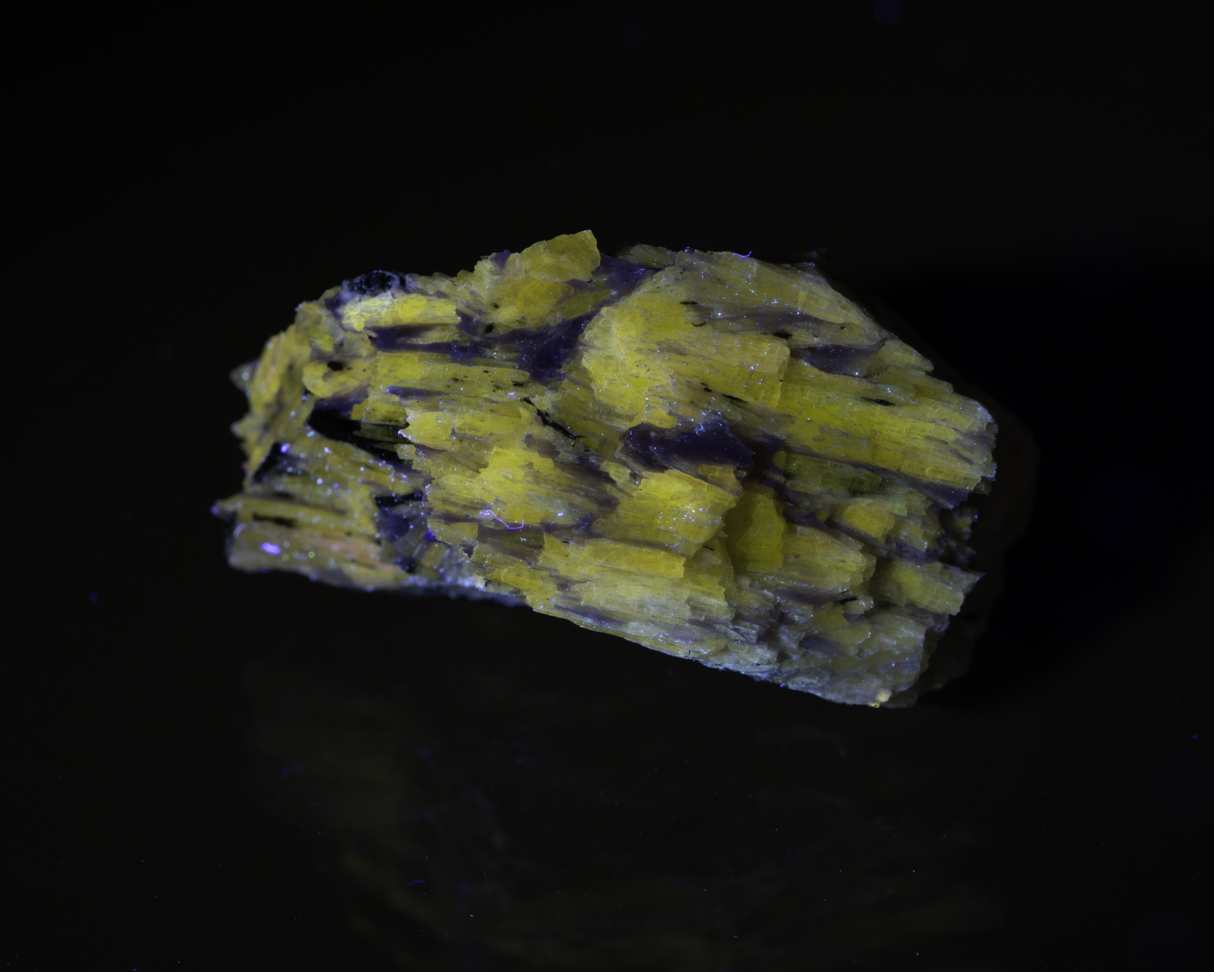 Sierra de Cruces zwei Stücke zum Vergleichen. Insbesondere bei 405nm Anregung sieht man auf dem einen Stück deutlich, dass auch reine gelborange Mn