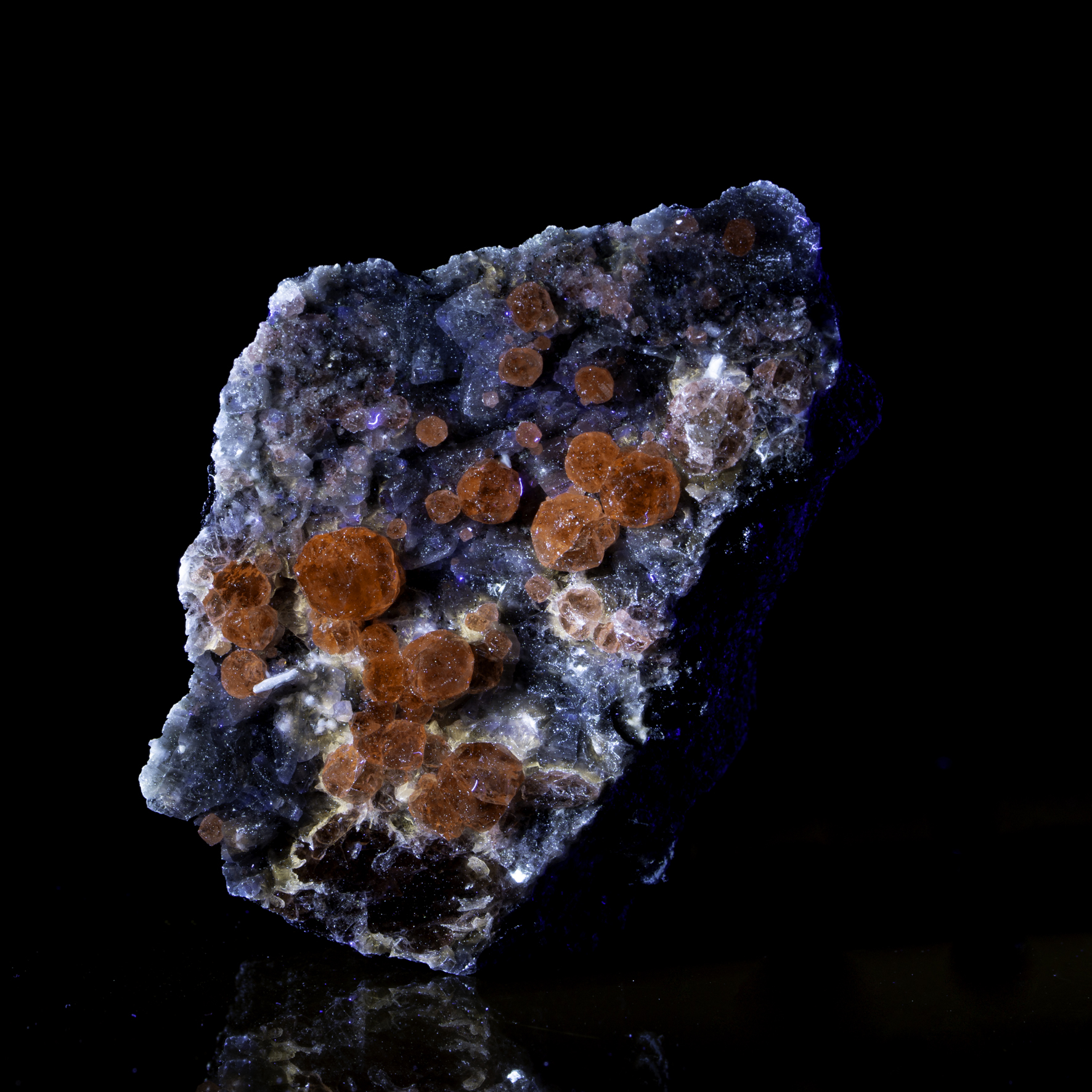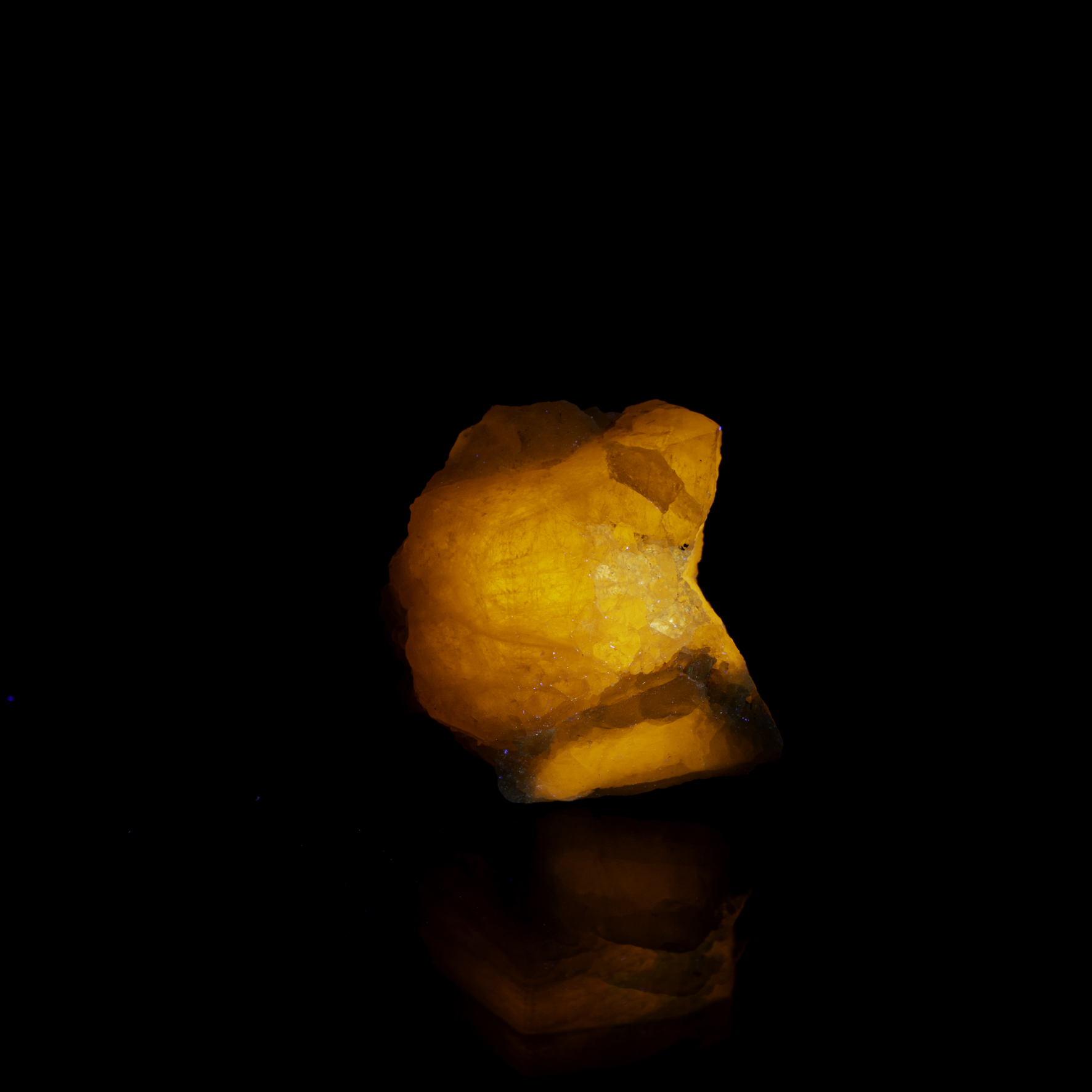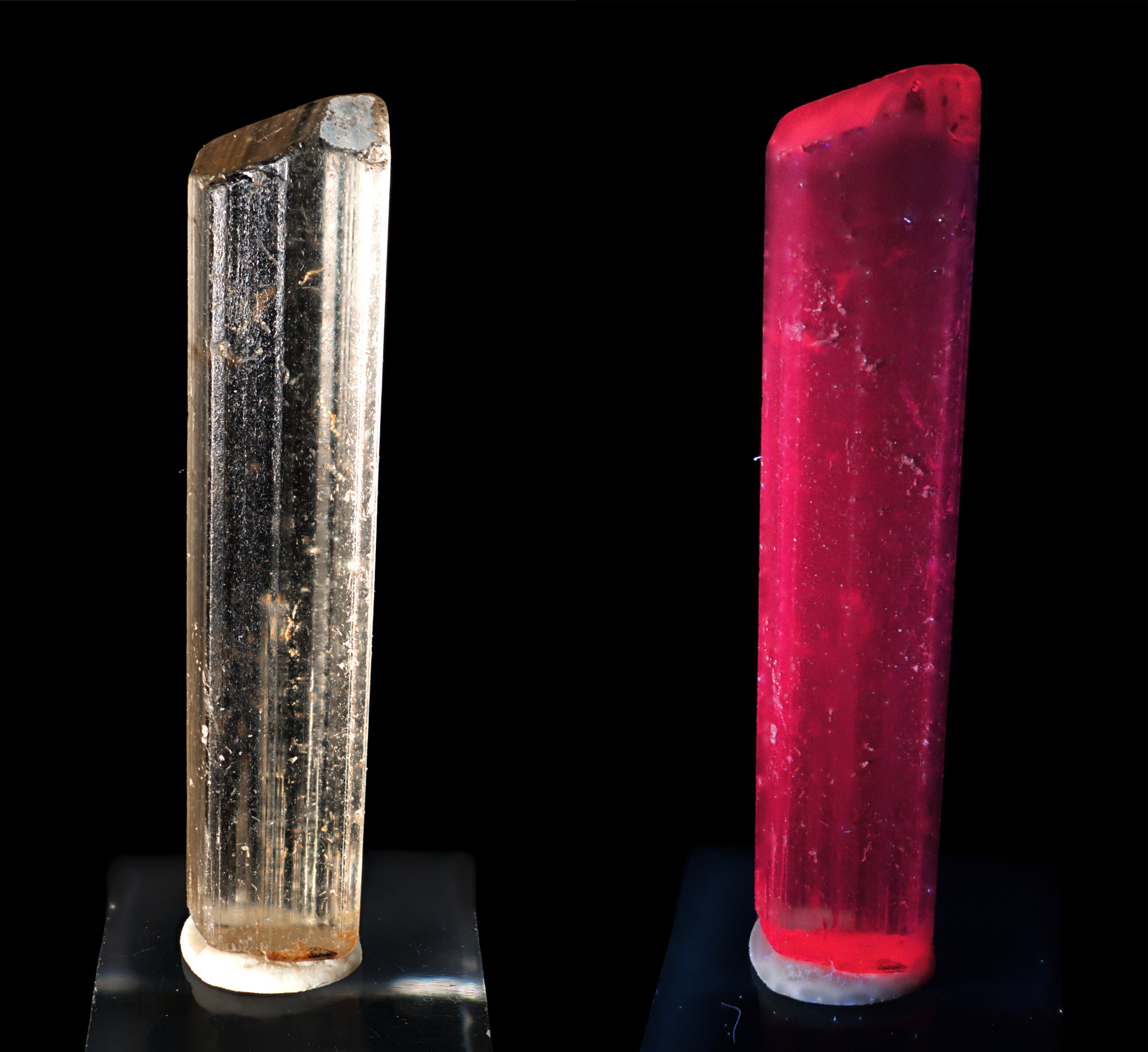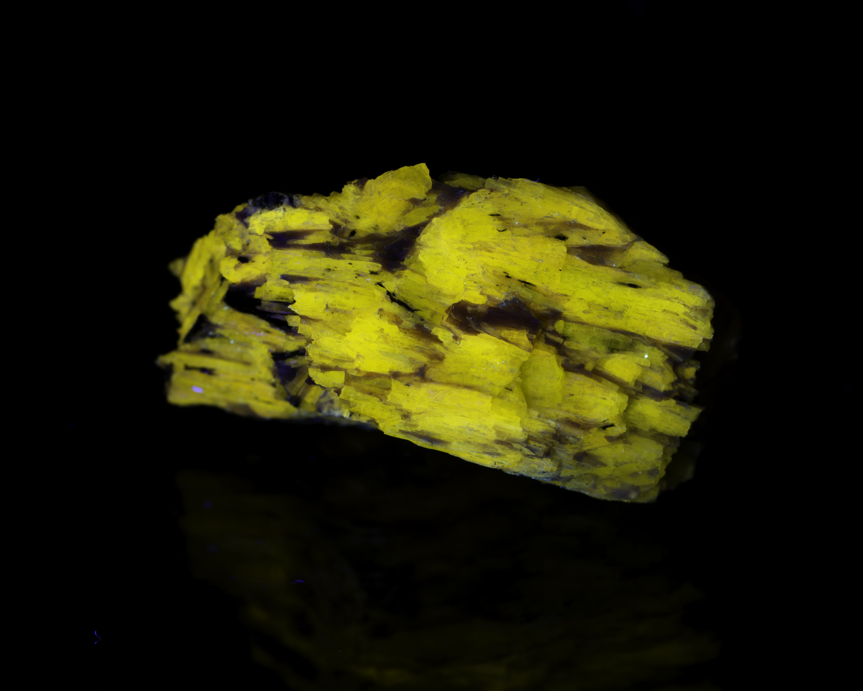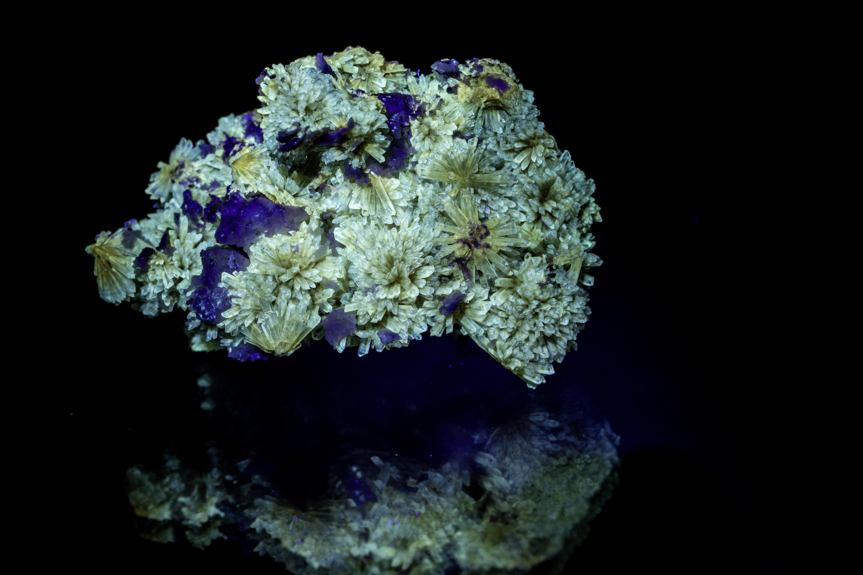 Sierra de Cruces zwei Stücke zum Vergleichen. Insbesondere bei 405nm Anregung sieht man auf dem einen Stück deutlich, dass auch reine gelborange Mn
