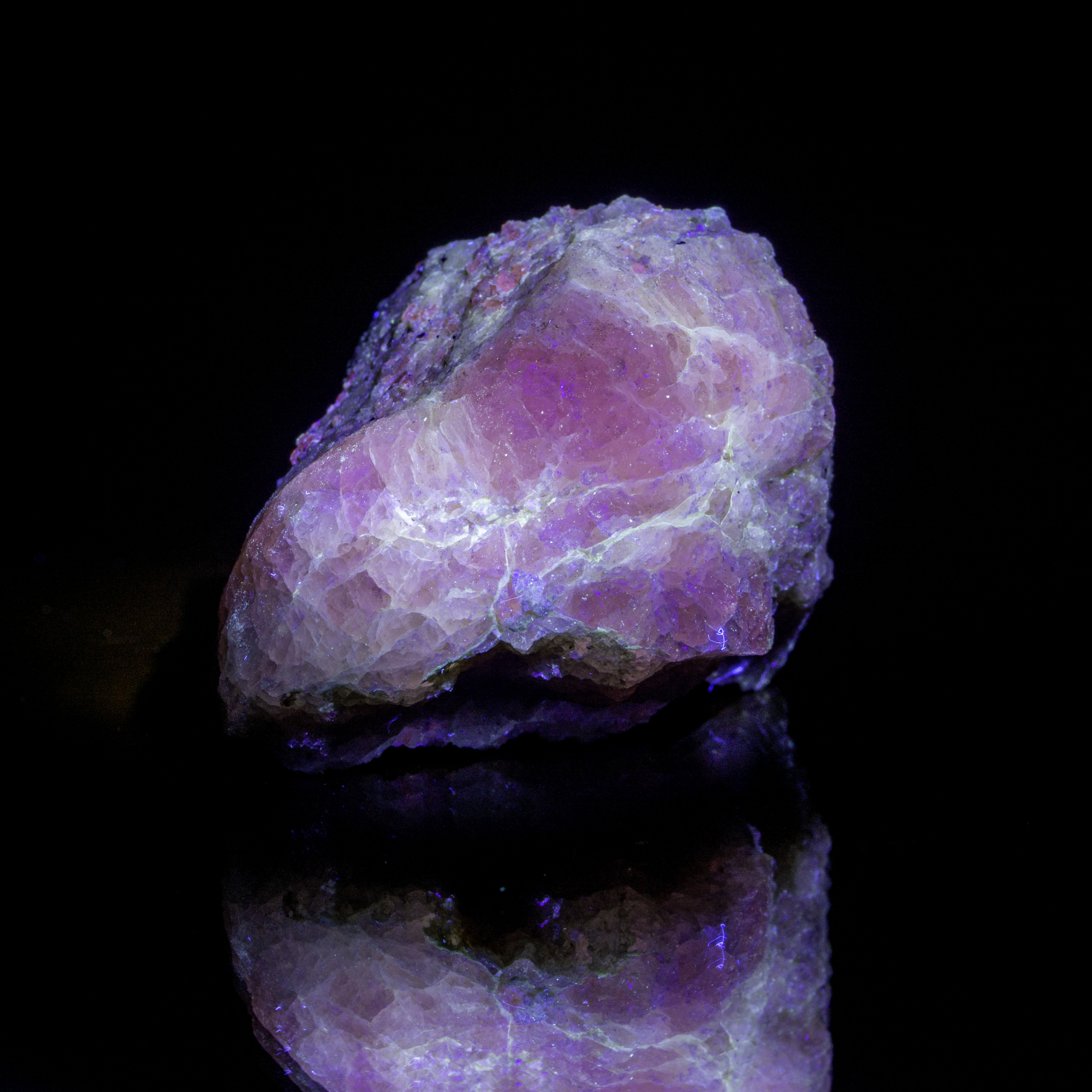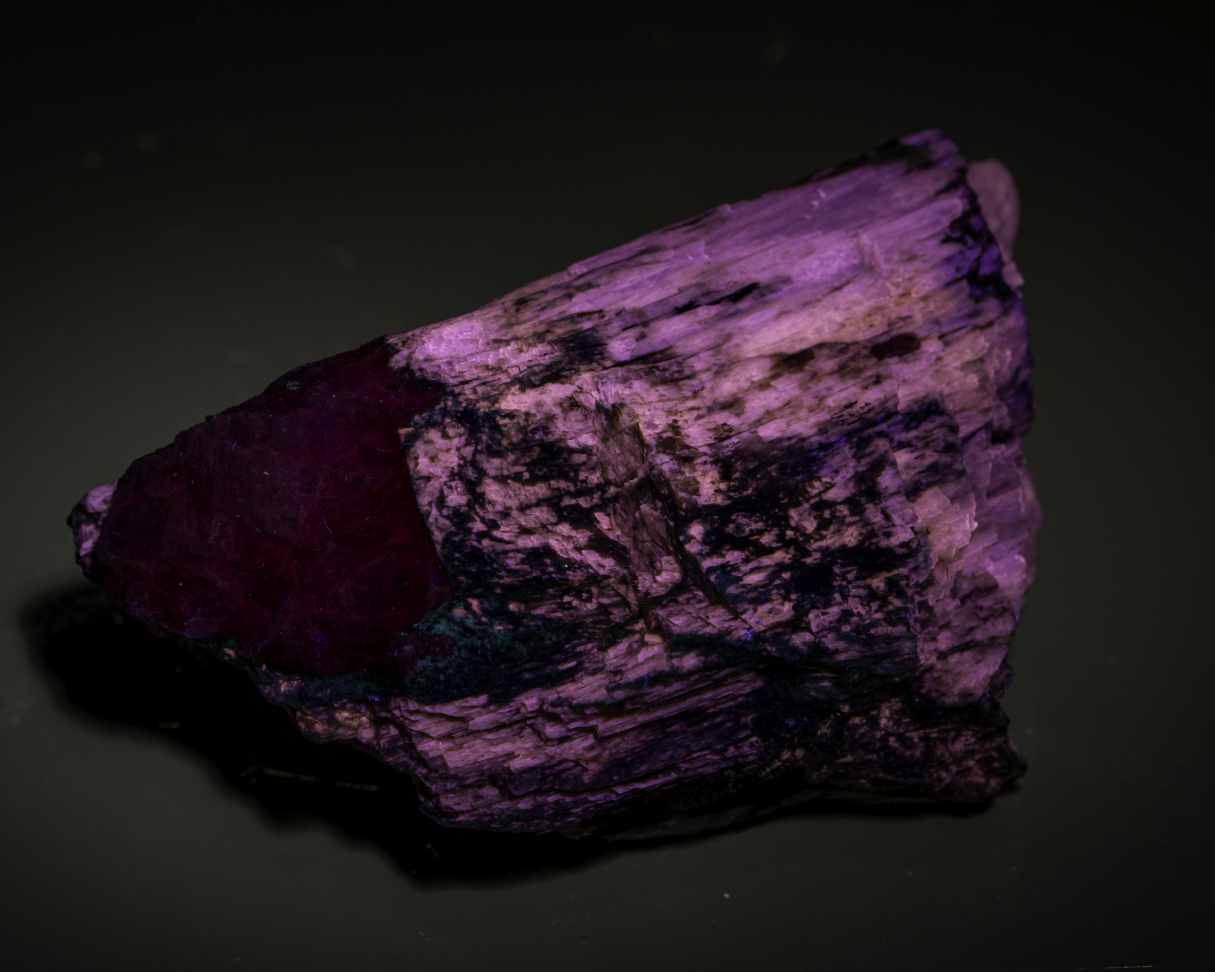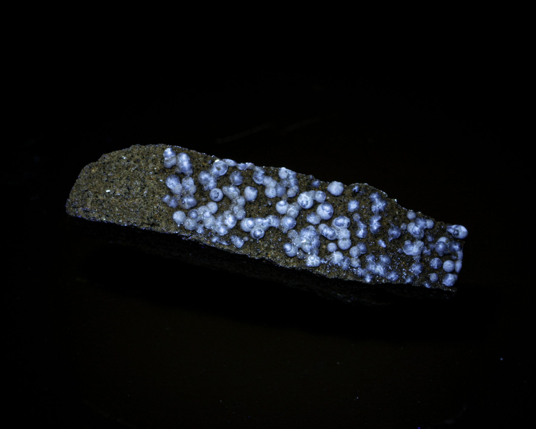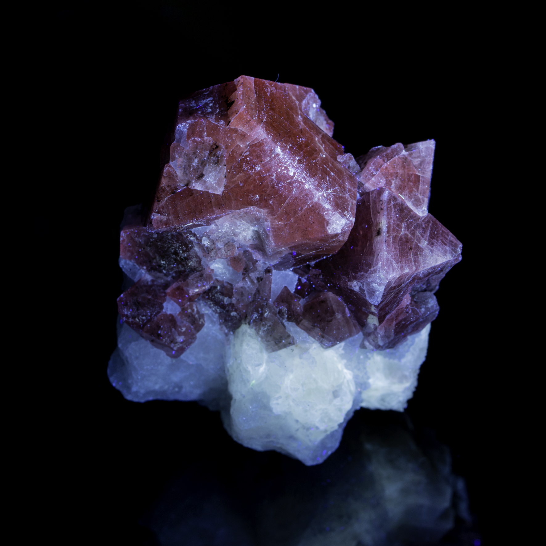 Sierra de Cruces zwei Stücke zum Vergleichen. Insbesondere bei 405nm Anregung sieht man auf dem einen Stück deutlich, dass auch reine gelborange Mn