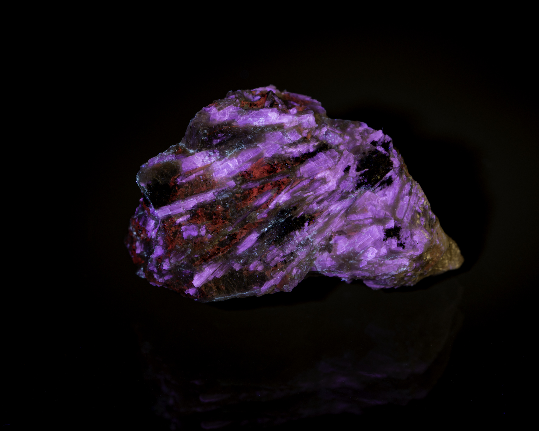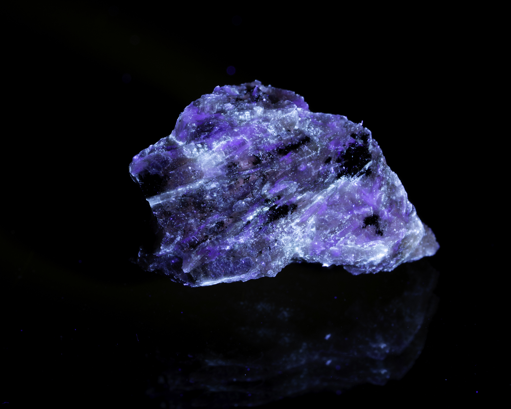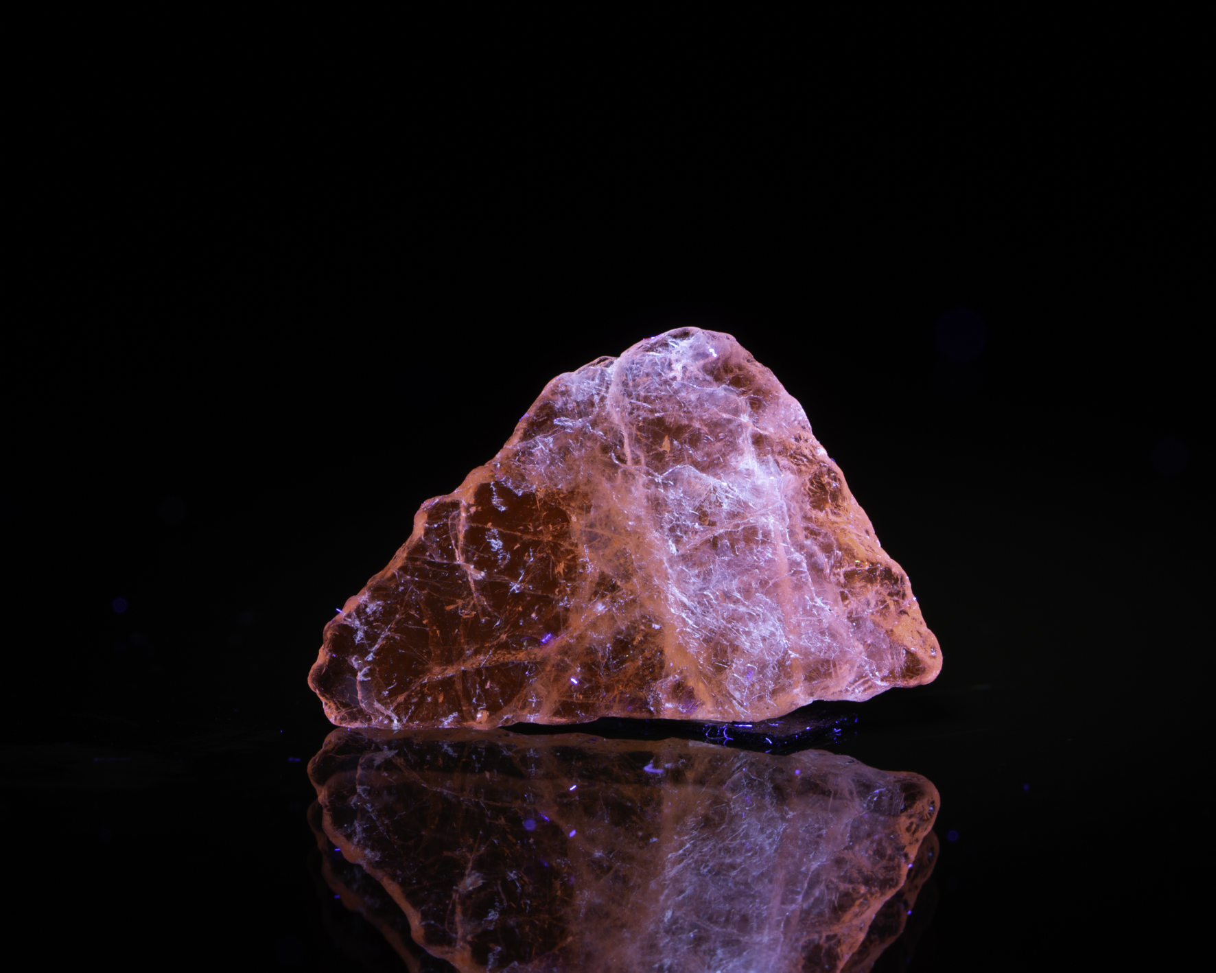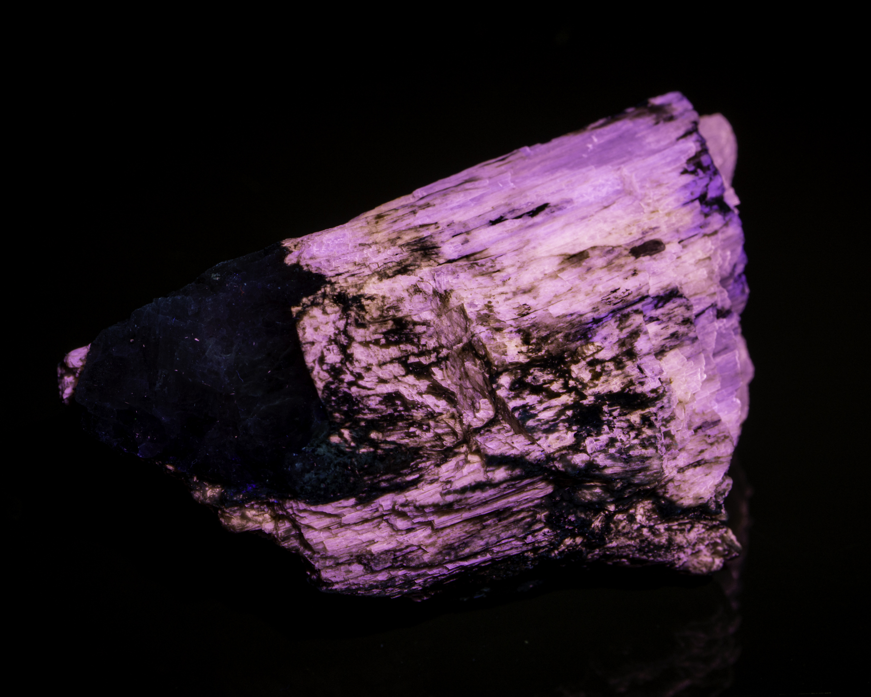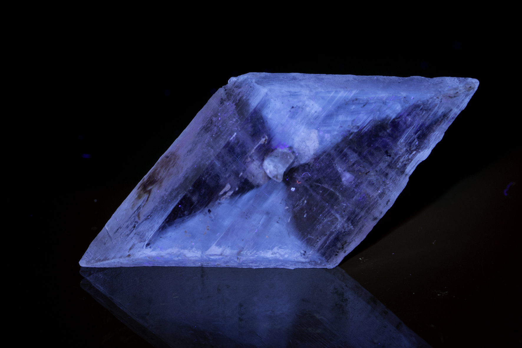 Sierra de Cruces zwei Stücke zum Vergleichen. Insbesondere bei 405nm Anregung sieht man auf dem einen Stück deutlich, dass auch reine gelborange Mn
