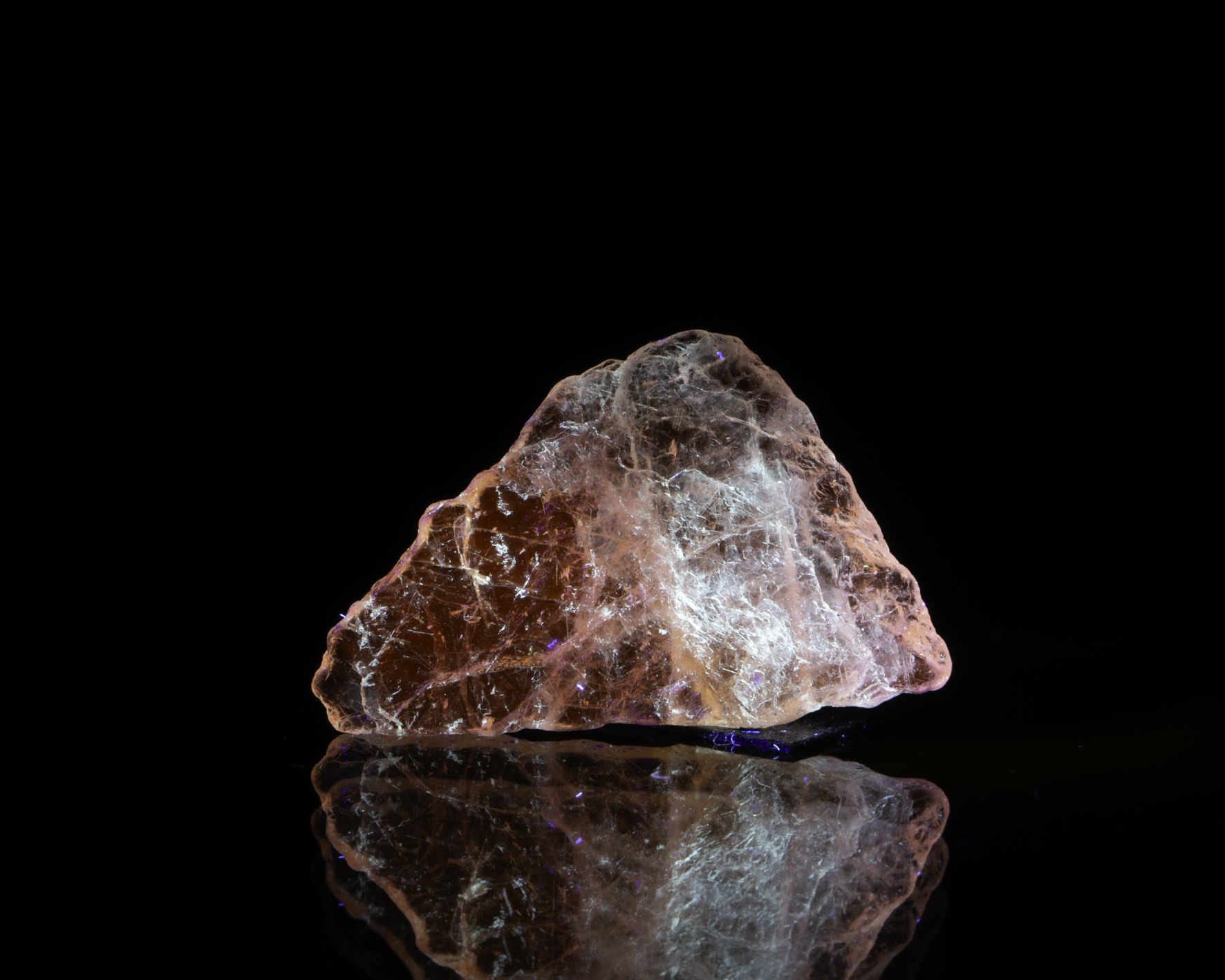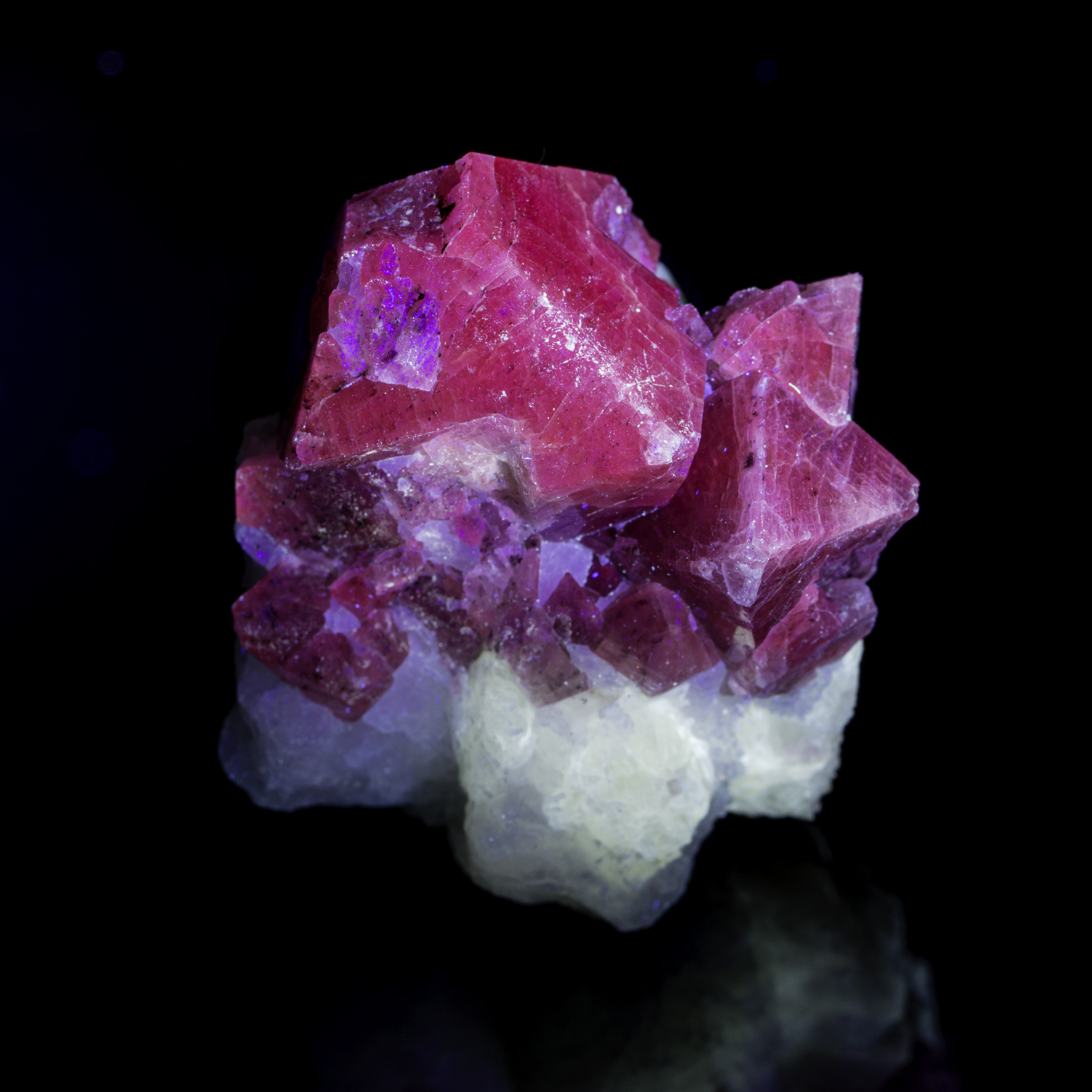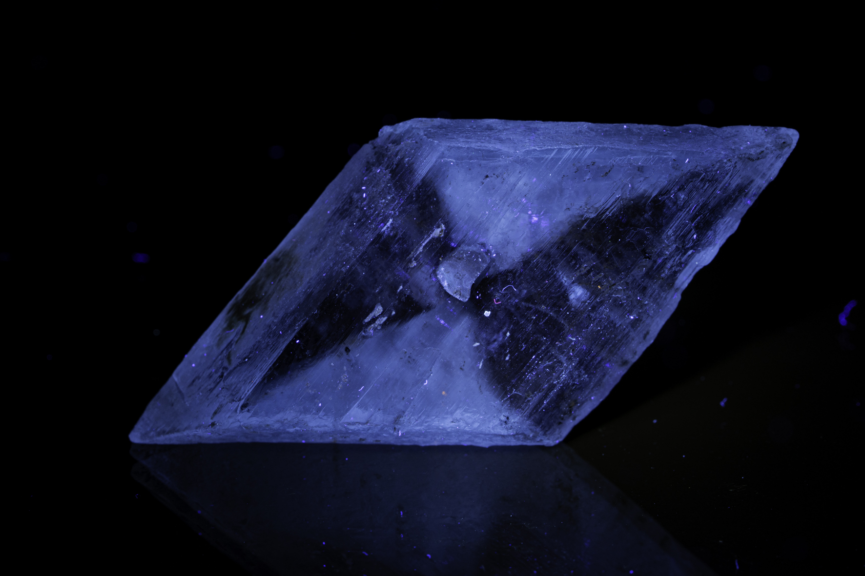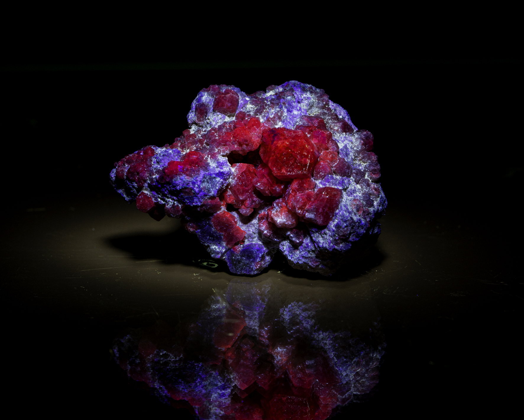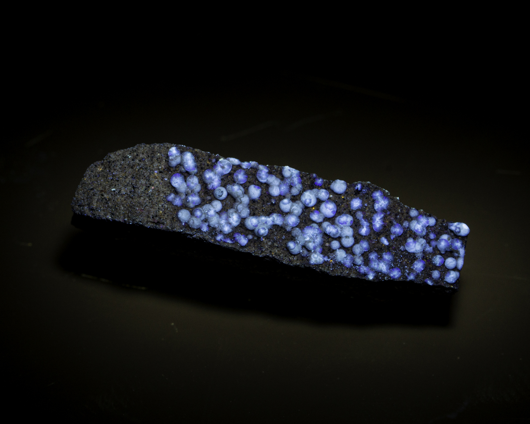 Sierra de Cruces zwei Stücke zum Vergleichen. Insbesondere bei 405nm Anregung sieht man auf dem einen Stück deutlich, dass auch reine gelborange Mn
