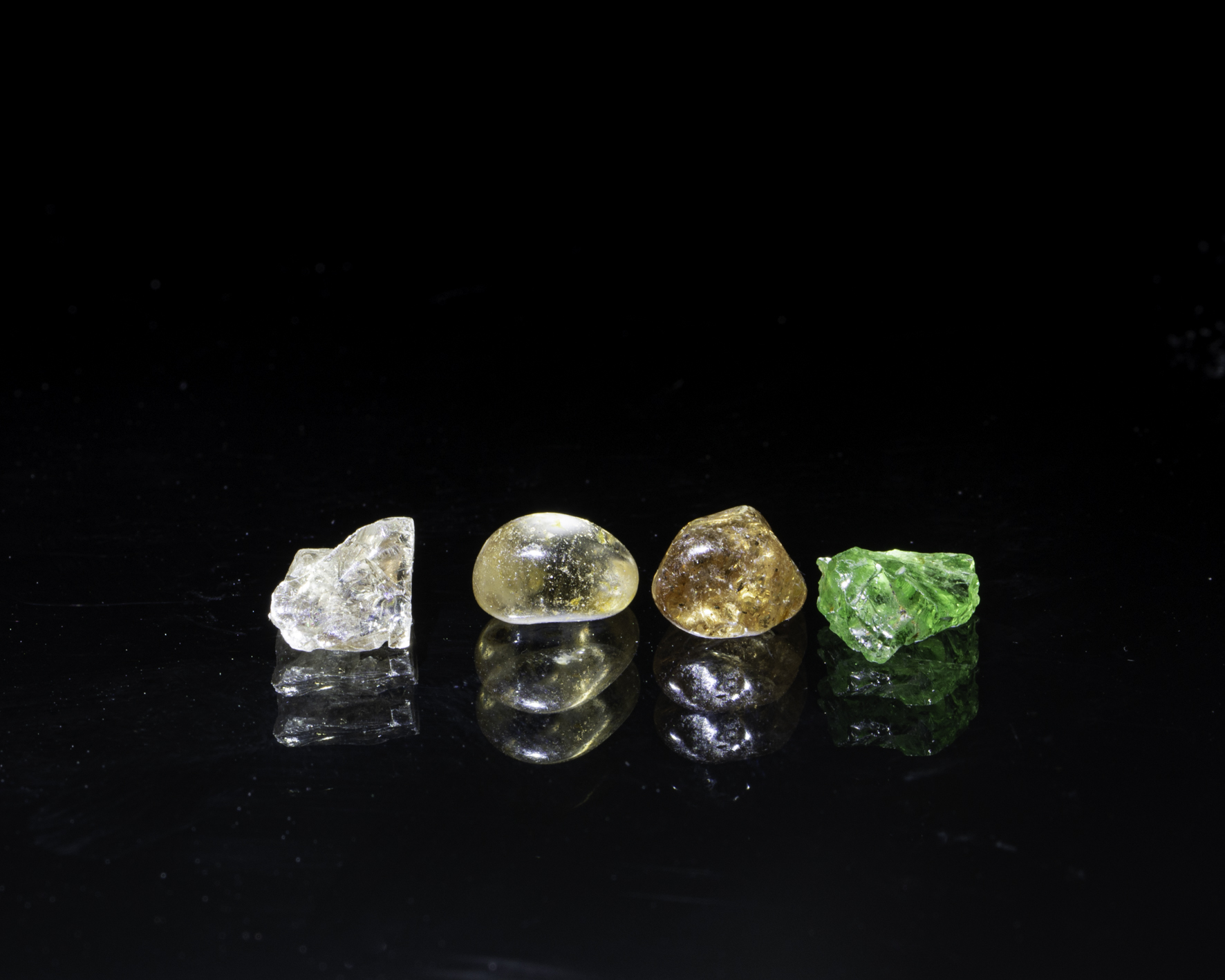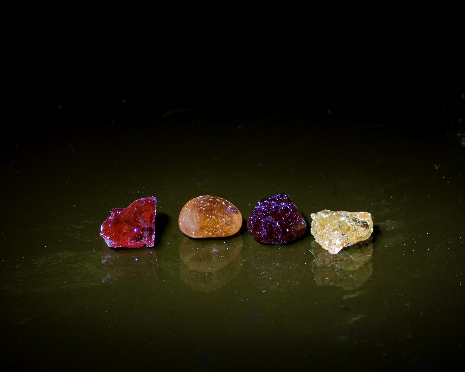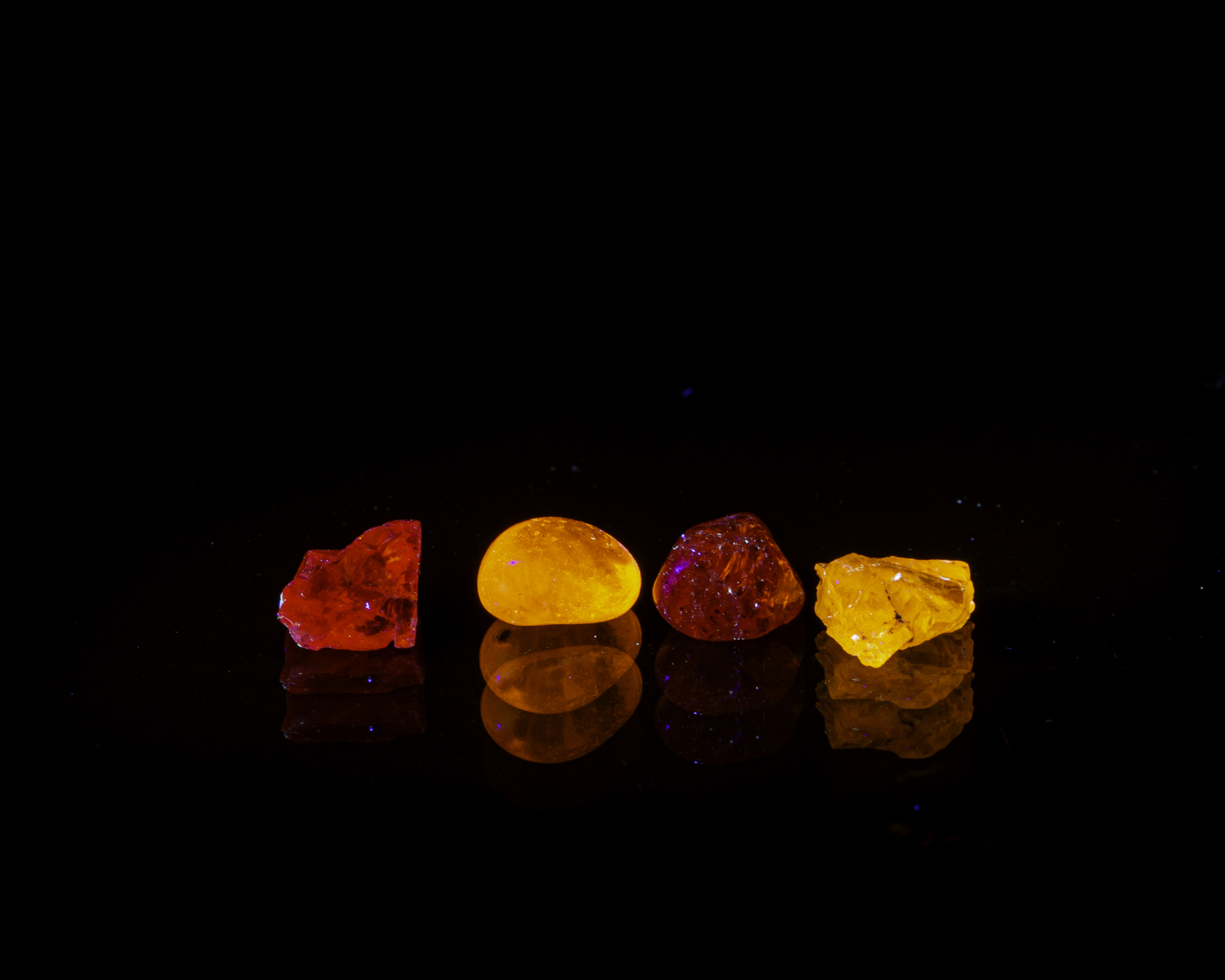 Im Uhrzeigersinn von links oben: Tageslicht, 405nm, 365nm und 310nm Anregung.