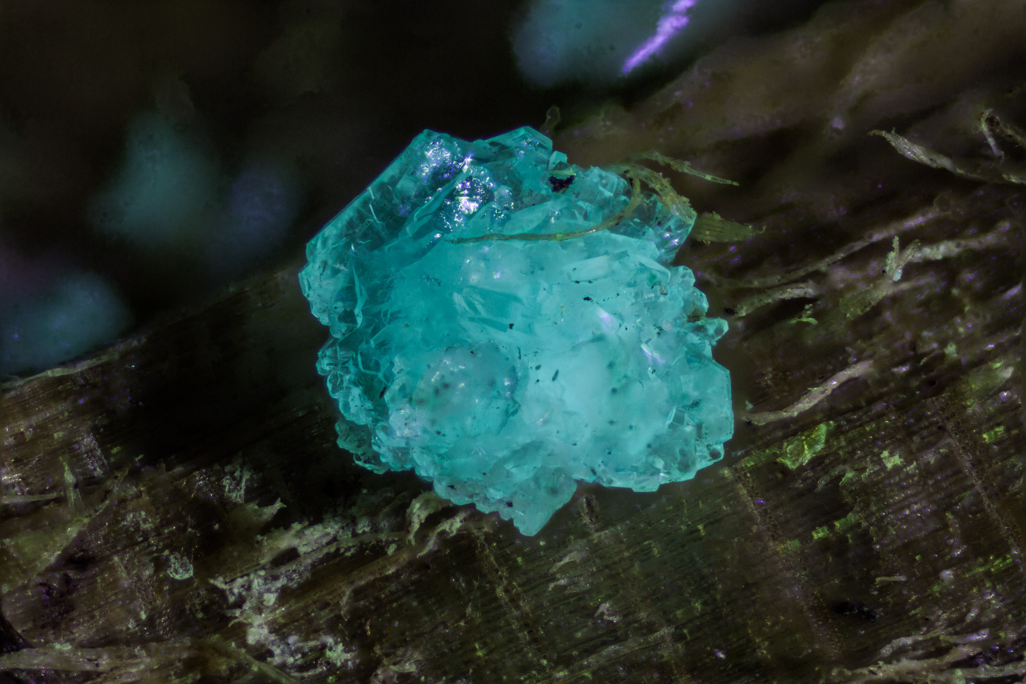 Klare Krsitalle von Thornasit, Na12Th3(Si8O19)4 ·18H2O, leuchten unter UV (LW,365 nm). Typischerweise sind Uranyl-Gruppen UO22+ mit eingebaut, die das grüne Leuchten verursachen.