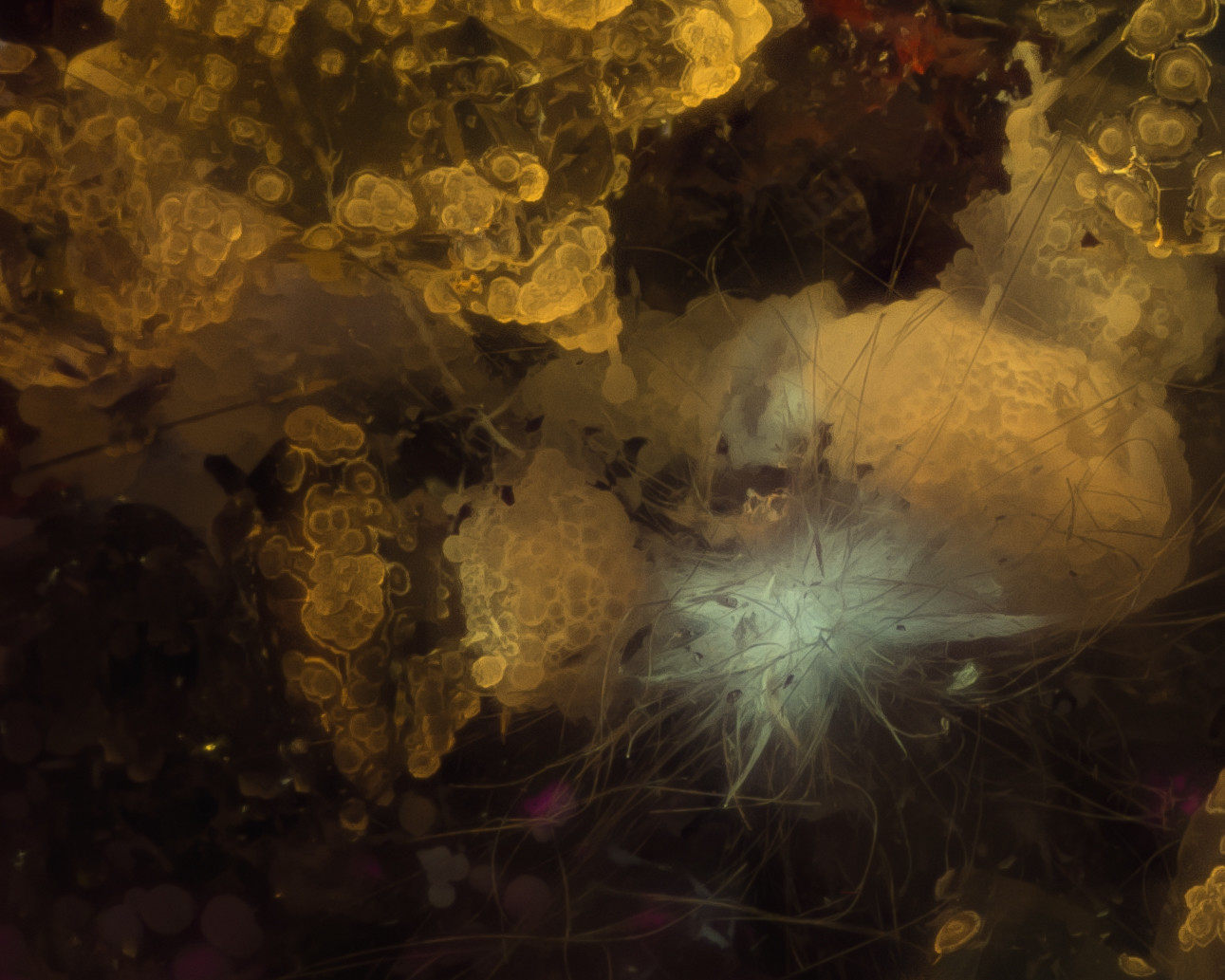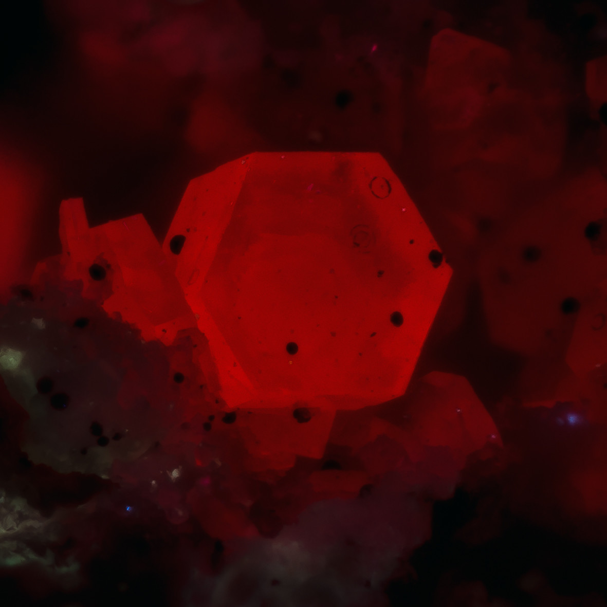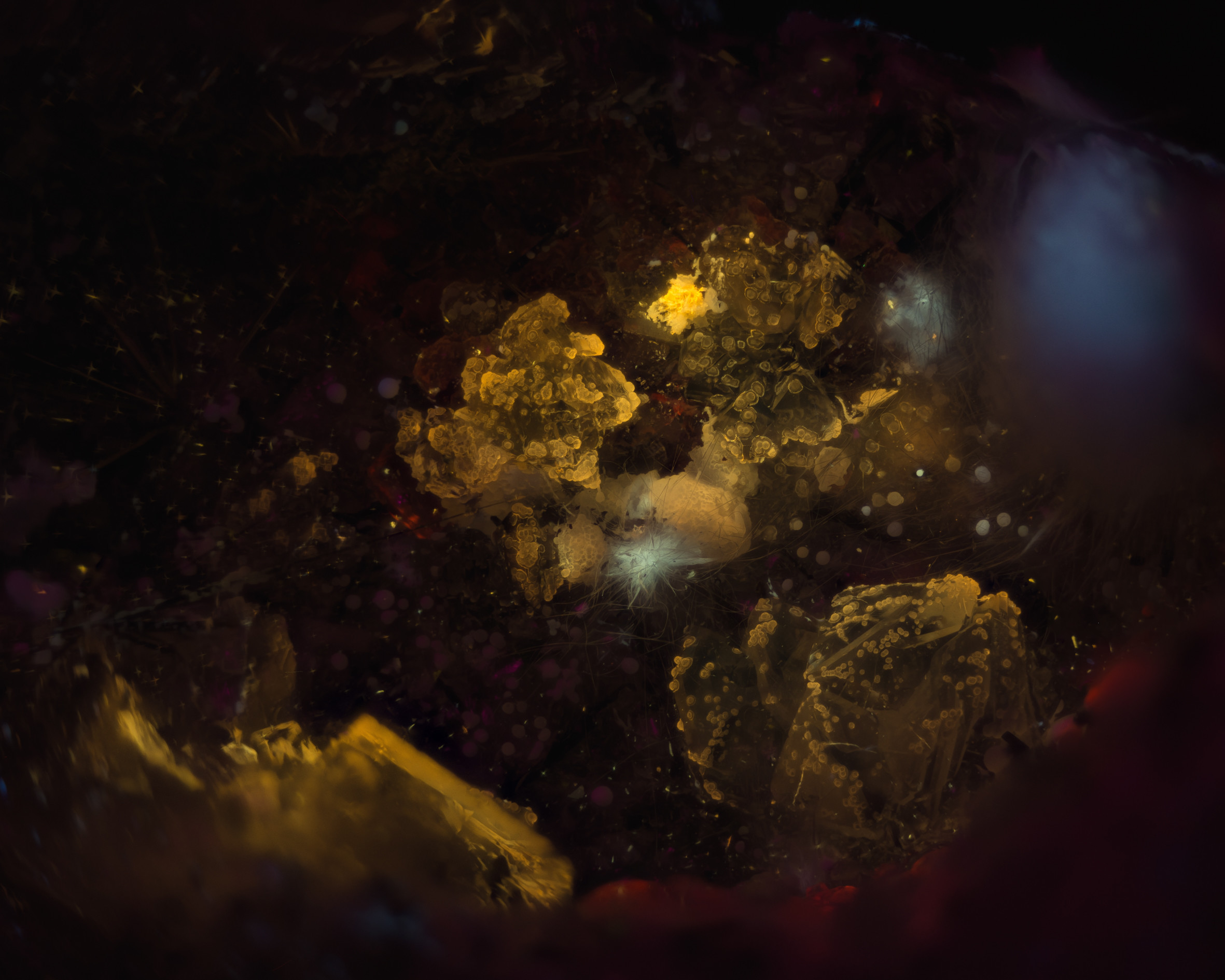 Die letzte Serie Bilder zeigt eine Druse im Phonolith, in der Villiaumit mit Makatit und Fluorit sowie klaren Kristallen (Natrolith?) gemeinsam vorhanden sind. Vom roten Leuchten des Villiaumits ist nicht veil zu sehen, da Makatit (blauweisse haarige Aggregate, siehe vergrößertes Detailbild) und Fluorit (? gelbe Lumineszenz) deutlich heller sind.  P.S: Das Übersichtsbild hat eine ziemlich hohe Auflösung, es lohnt sich, dieses Bild in Originalgröße anzuschauen.