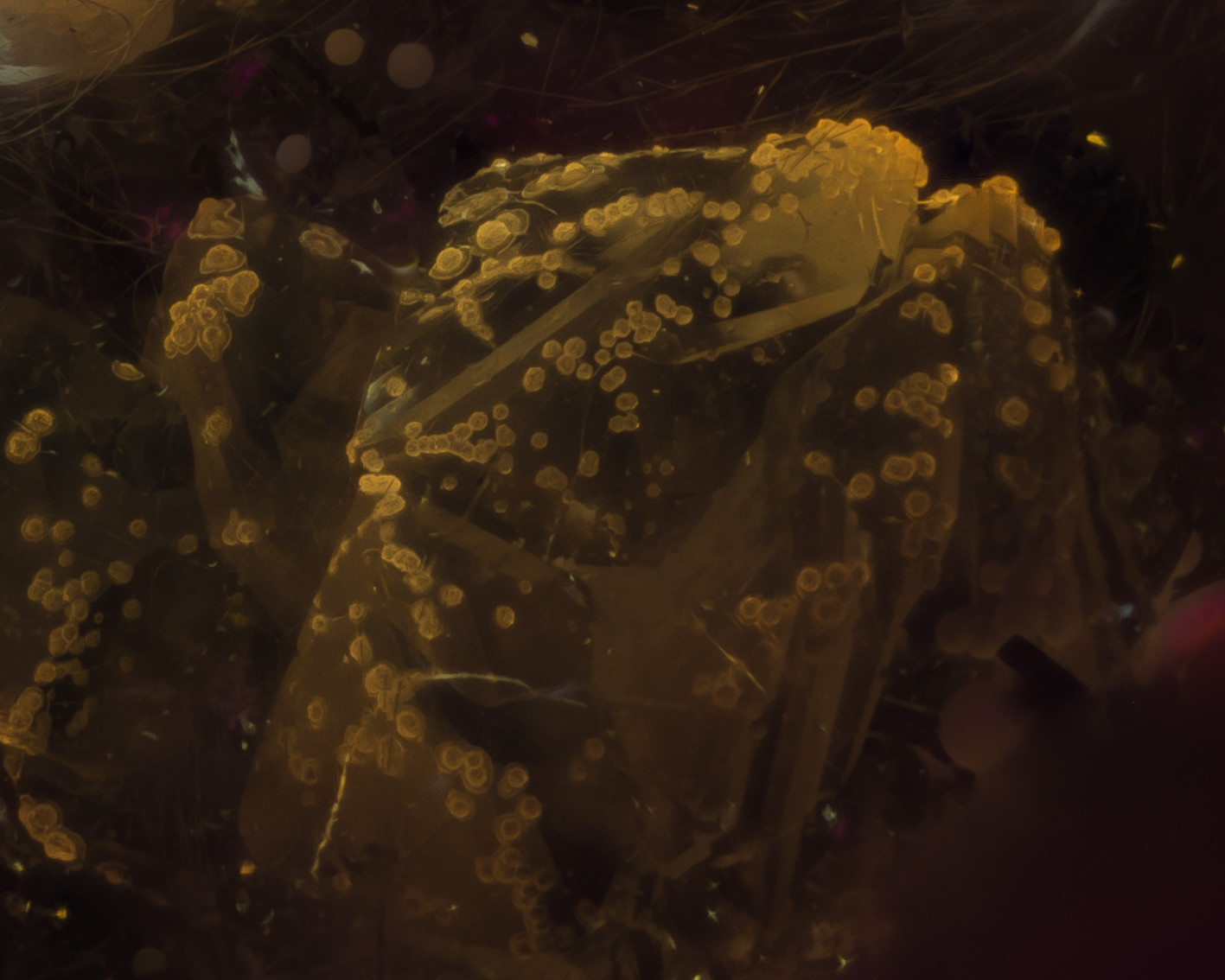 Wulfenit von Los Lamentos, Mexico - genauer habe ich es leider nicht. Unter UV-Licht luminesziert der Wulfenit leicht orange - ja, es ist tatsächlich Lumineszenz, auch wenn die Farbe fast dem Eindruck unter Weißlicht entspricht -, man sieht die pink wiedergegebenen Reflexe des UV-Lichts und einzelne, weißlich oder bläulich lumineszierende Partikel. Da wünsche ich mir noch einen Emissionsfilter... Bildbreite ist ca. 22mm.