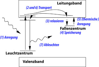 Der Mechanismus dahinter beruht auf der Defektstruktur eines Festkörpers - Nachleuchten ist eine Eigenschaft des Kristalls mit seiner chemischen Zusammensetzung, Struktur und eben den Defekten (4,5,6,7). Zugrunde liegt dem Mechanismus, dass Ladungsträger - Elektronen oder Löcher, für beides gibt es Beschreibungen - aus dem Leuchtzentrum in einen Fallenzustand gelangen können, in dem sie gespeichert werden. Aus dem Fallenzustand können sie durch Energieeintrag wieder ausgelöst werden und zurück zum Leuchtzentrum gelangen (4). Das nachfolgende Bild illustriert dies schematisch für den Fall von Elektronen als Ladungsträger.