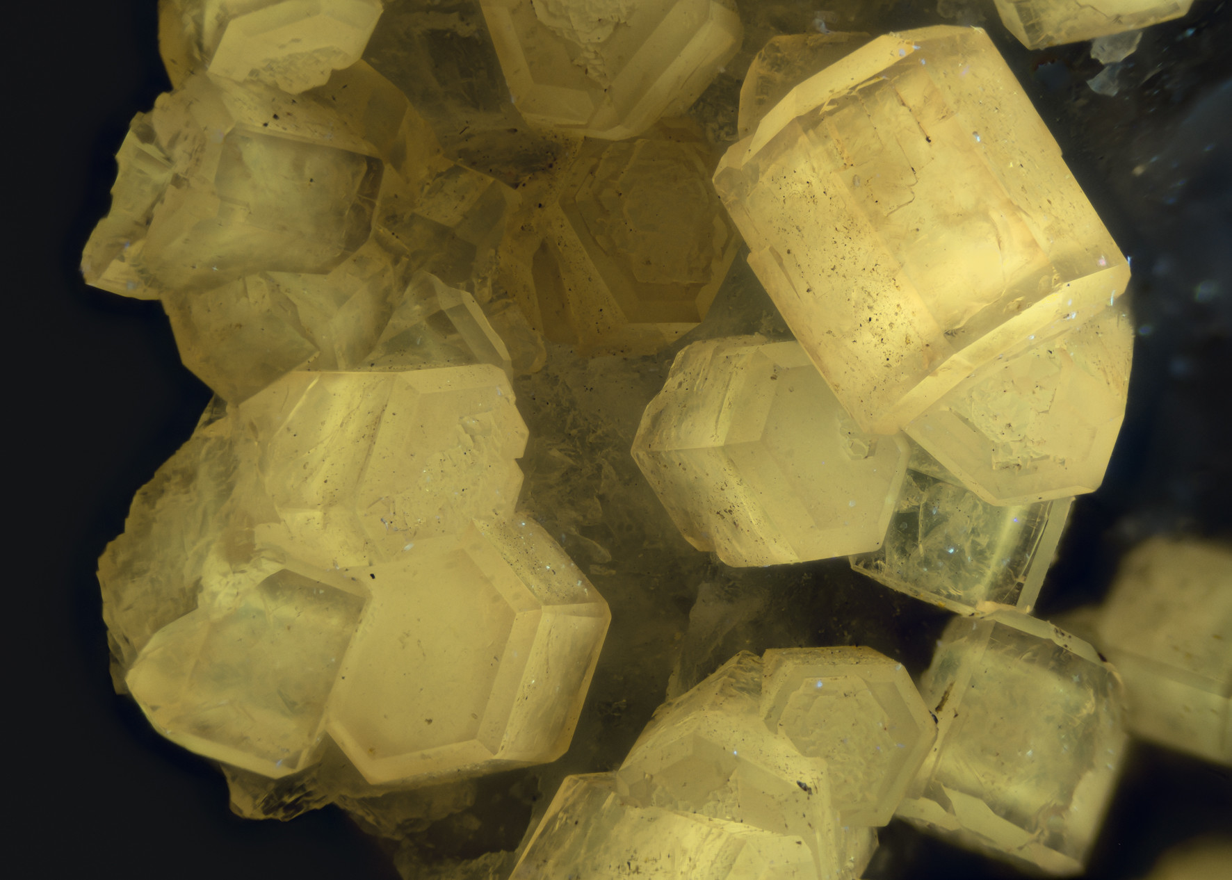 Ein leuchtendes Raumschiff ist gelandet. Hellgelb leuchtender Anglesit von der Grube Glücksrad, BB 2.3 mm, Detail 0.8 mm.