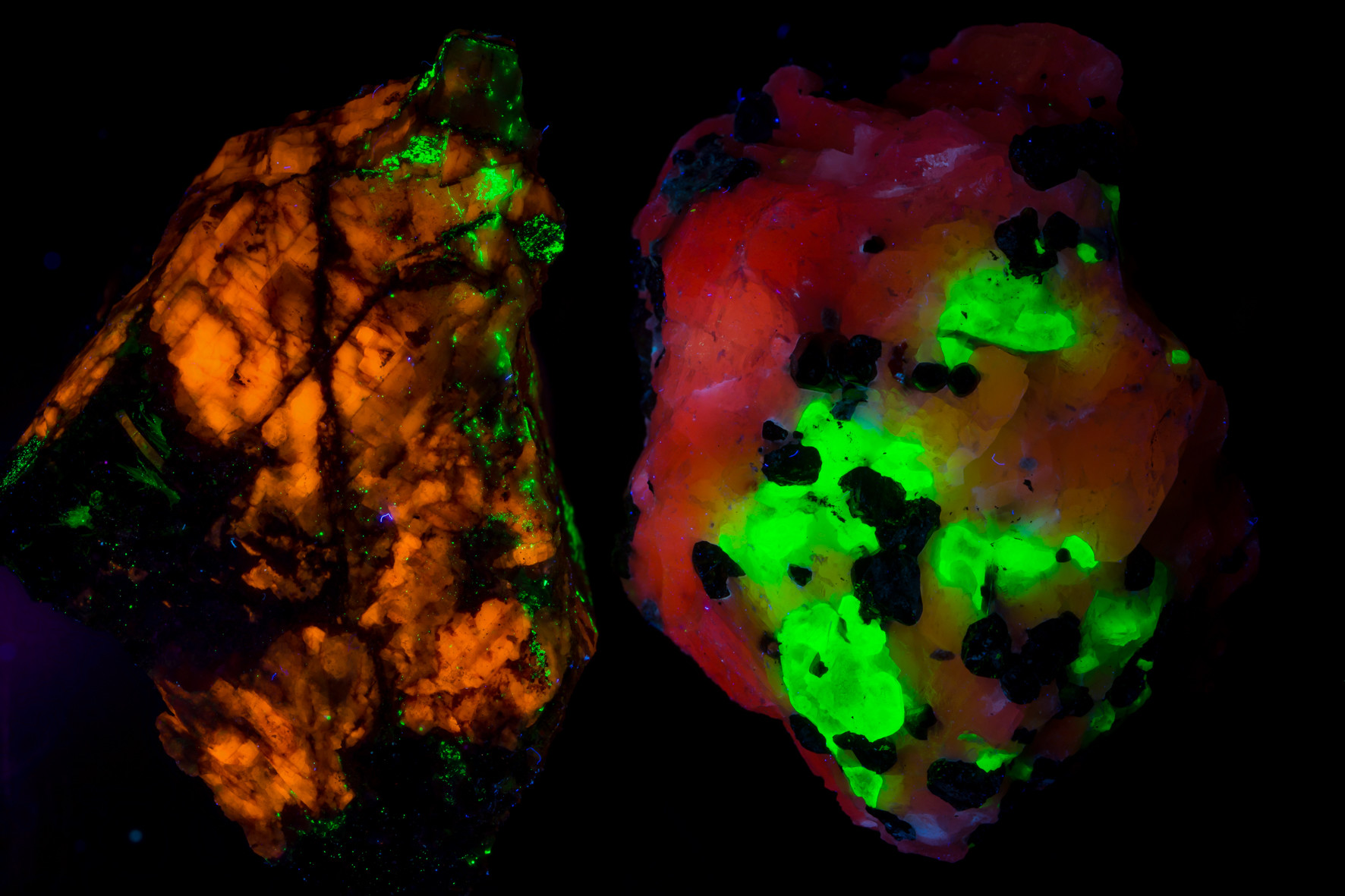 Grün leuchtend von Franklin (rechter Stein im linken Bild), gelb von Mindouli (Kongo), beide Male mit einer LED Taschenlampe UV 365 nm beleuchtet.