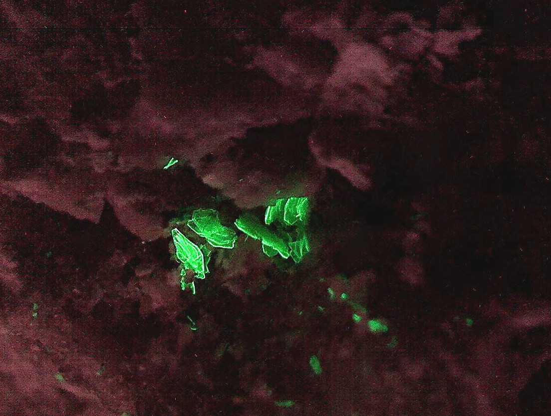 Gemacht habe ich die Bilder am Mac (altes Macbook pro), wo der Hintergrund des Lumineszenzbildes des Wulfenits von der Jianshan Mine