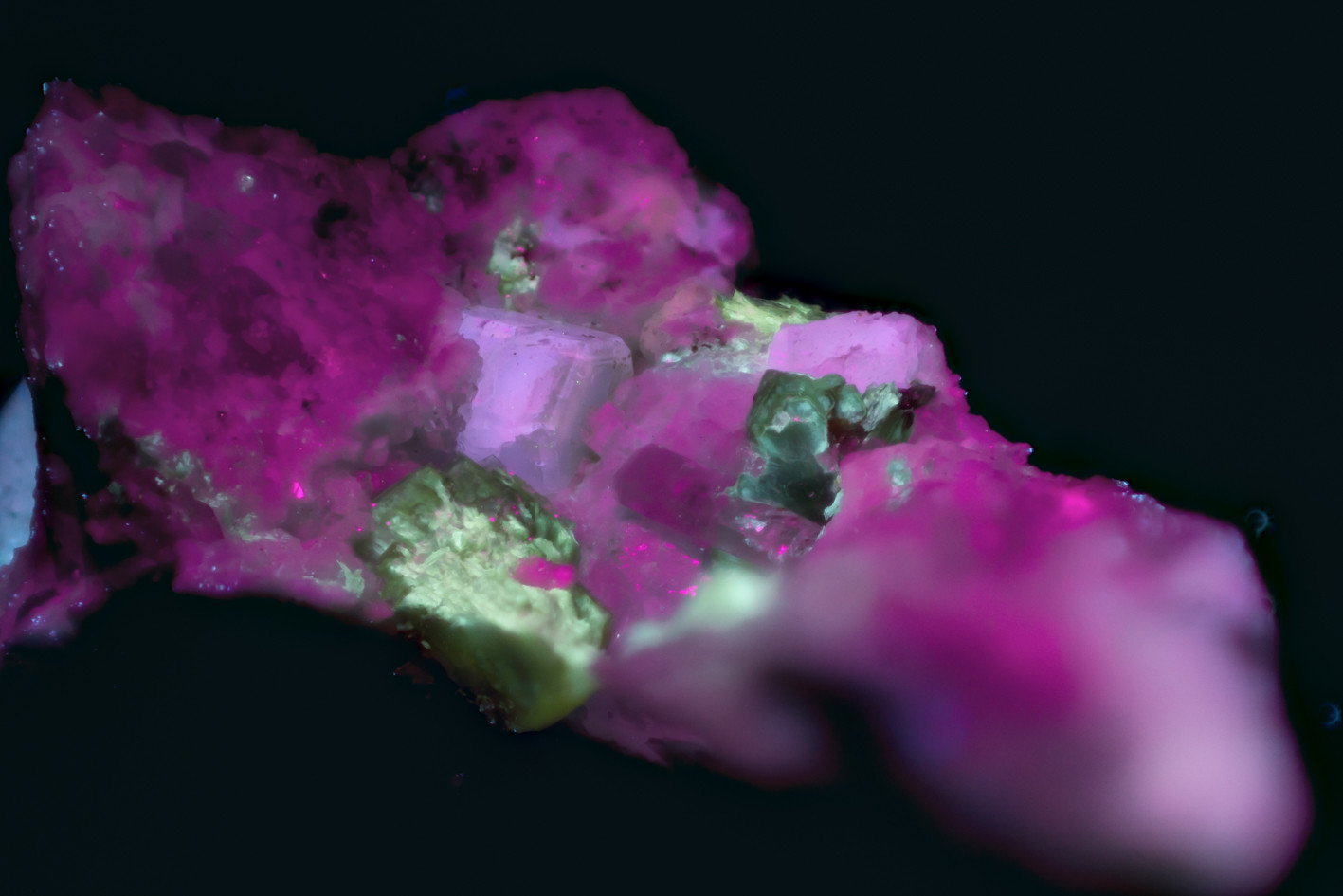 Unter UV 365 nm  leuchtet der bei Tageslicht violette Zirkon deutlich gelb (Bildbreite ist 0.7 mm).
