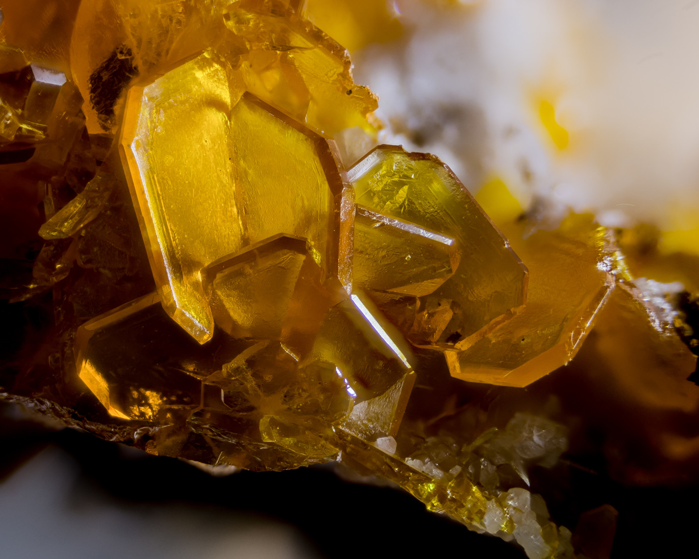 gleichmässig samtschwarz erscheint, und die Farbnuancen des Wulfenits brillant sind.