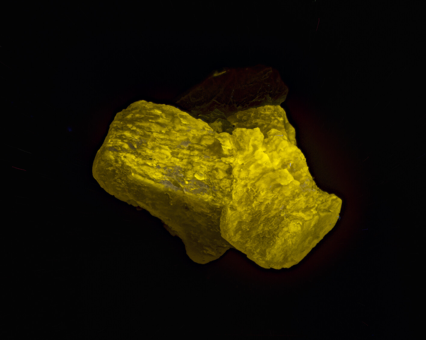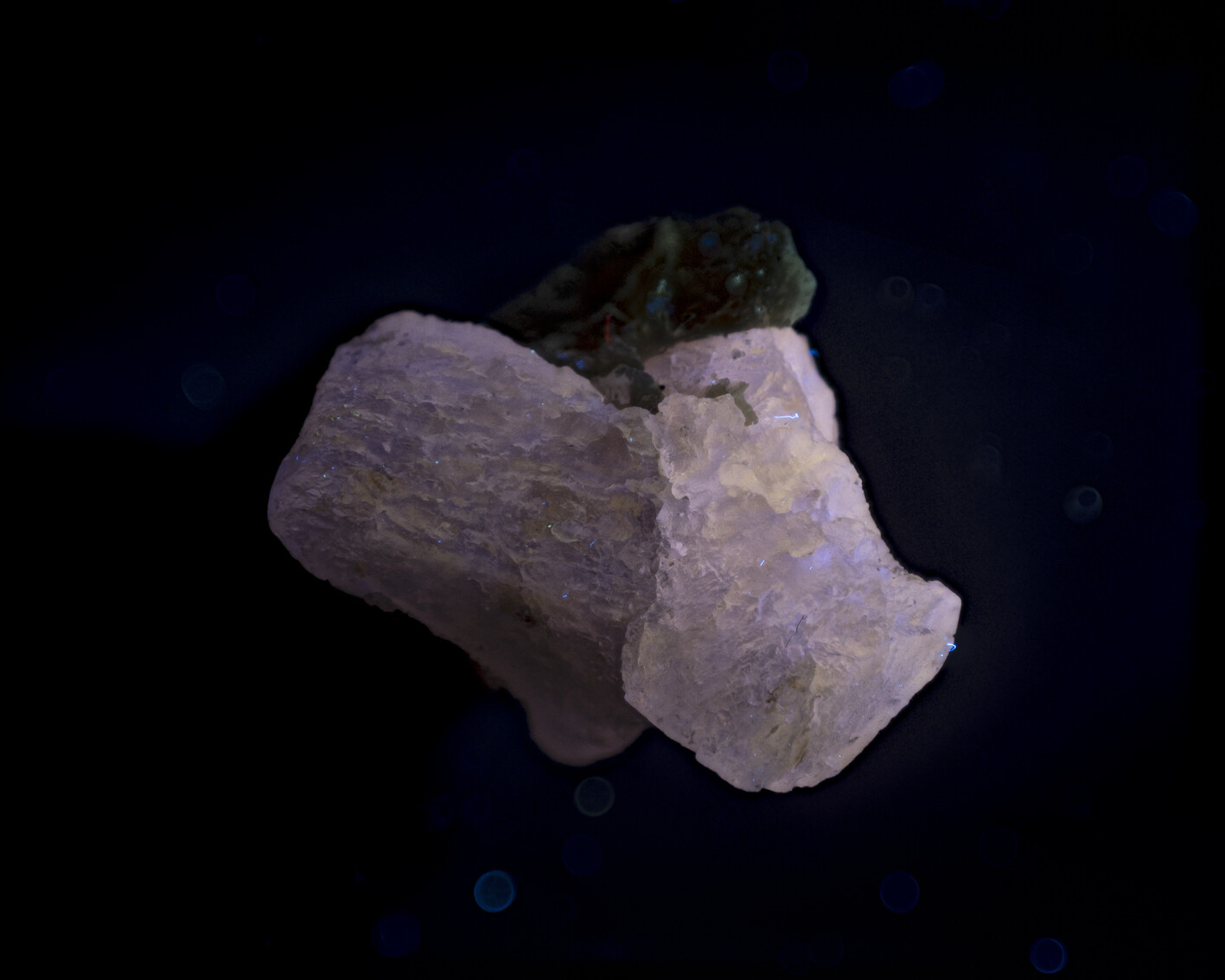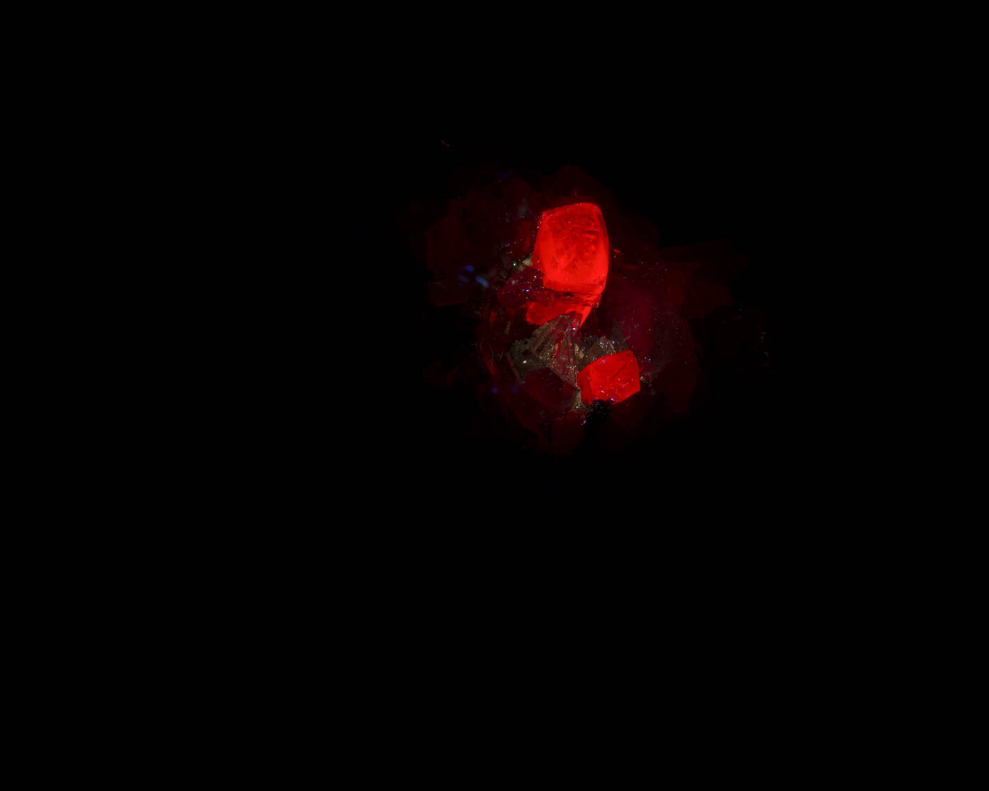 Für mich war das eine sehr erstaunliche Entdeckung! Alle meine Topase von den Eifel-Fundstellen leuchten intensiv rot - bei Beleuchtung mit 405 nm bzw 450nm. Bei 365 nm Anregung hingegen leuchten sie kaum, unter 255 nm dann - weiss!