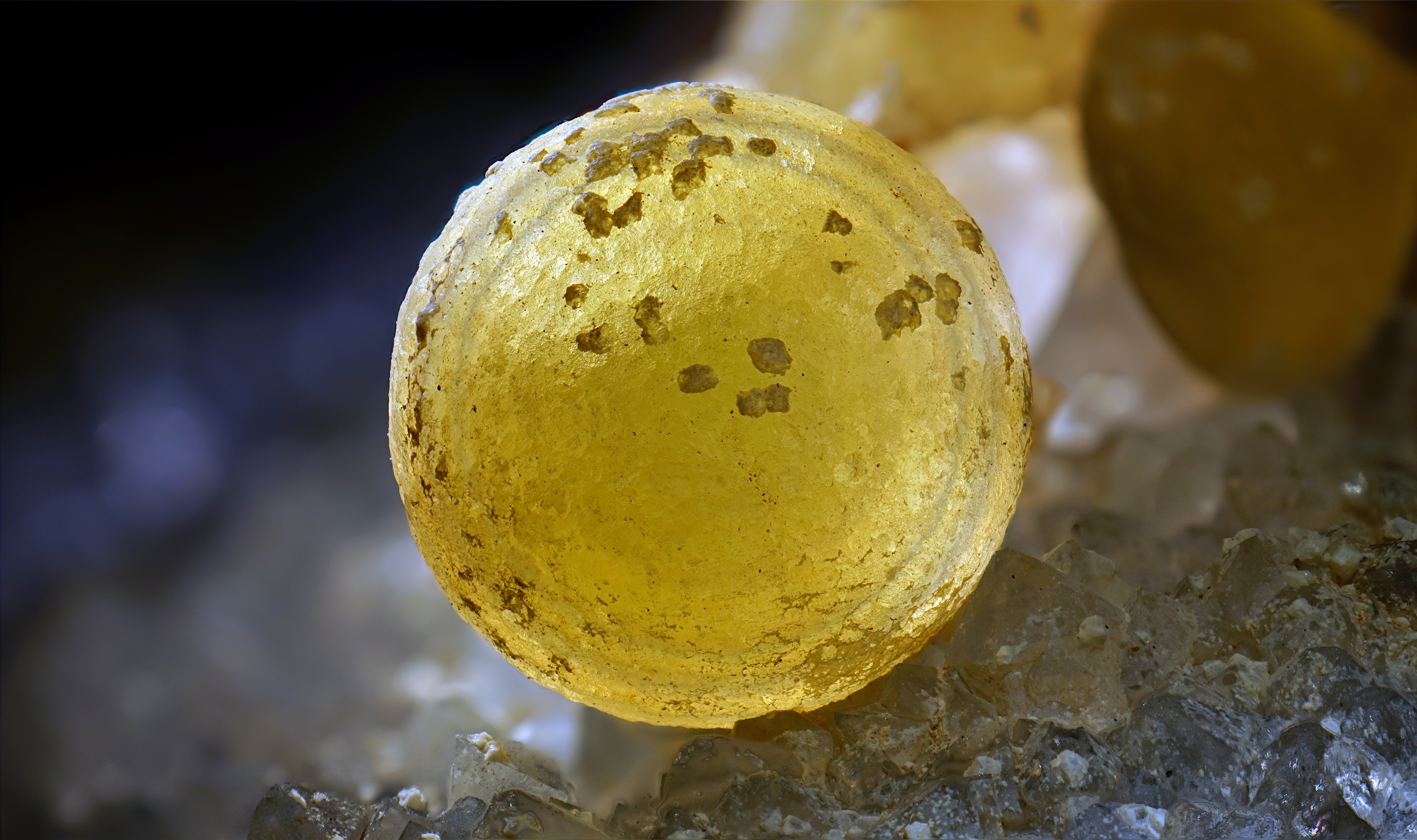 IntronX 1: Lichtdurchflutete Fluoritkugel, in zitronengelb. Durchmesser 1,5 cm. FO: Maharashtra, Indien.