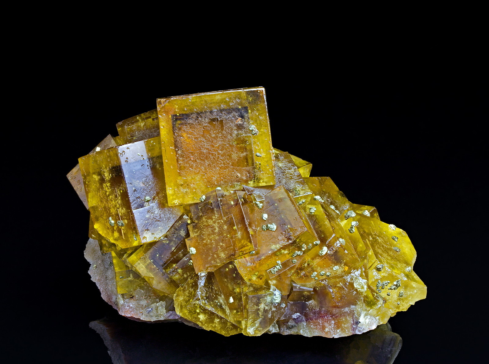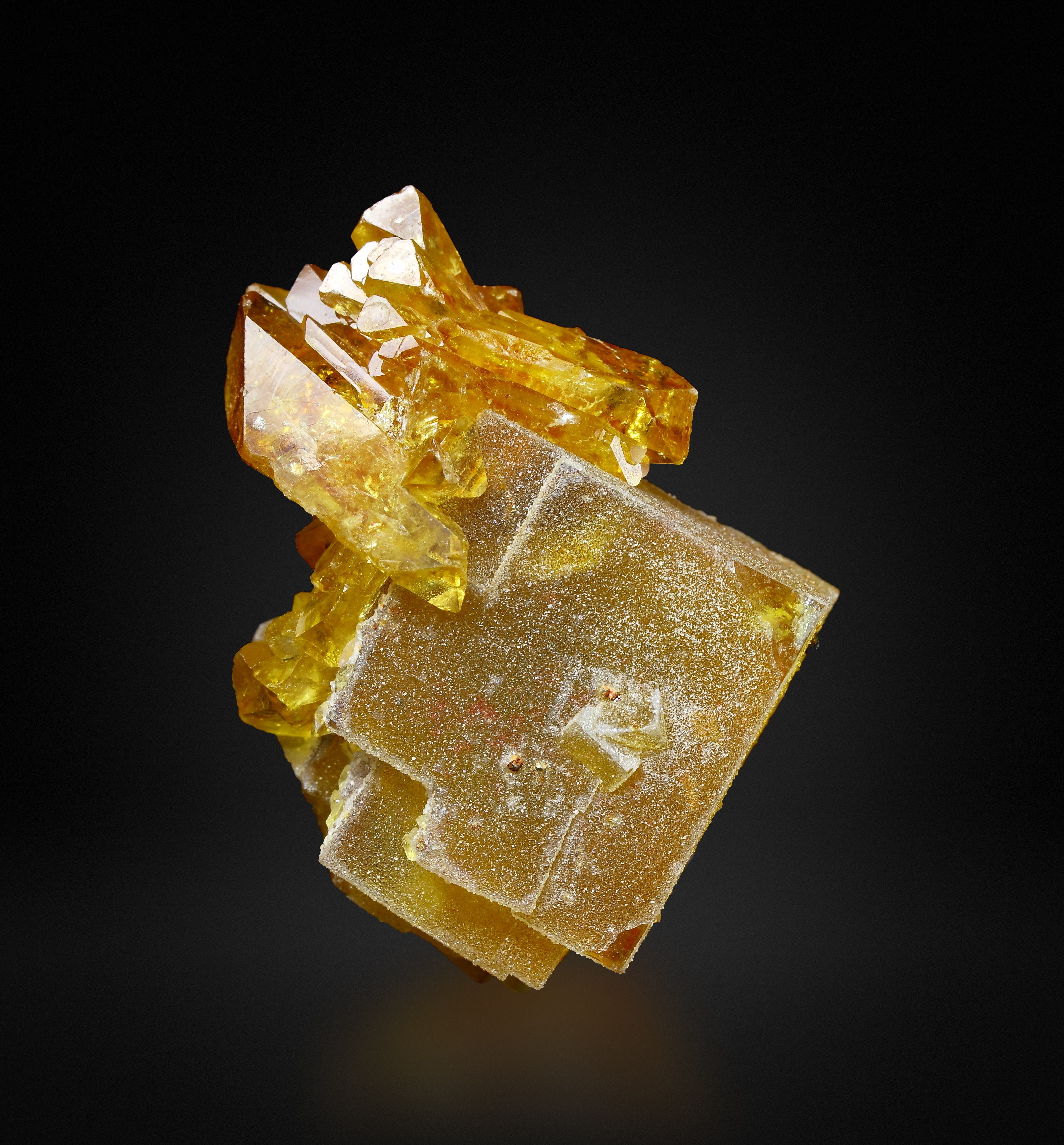 honiggelbe Baryt xx auf gelben Fluorit xx, die mit einer dünnen Schicht Quarzkristallen überzogen sind