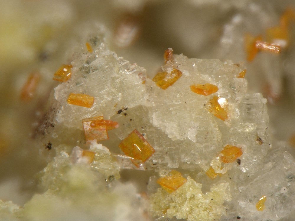 bei den Fotos dieser Stufe in Mindat von 2015 ist vermerkt, dass die EDX TiO2 ergab. Sie sind dort als Anatas zugeordnet.