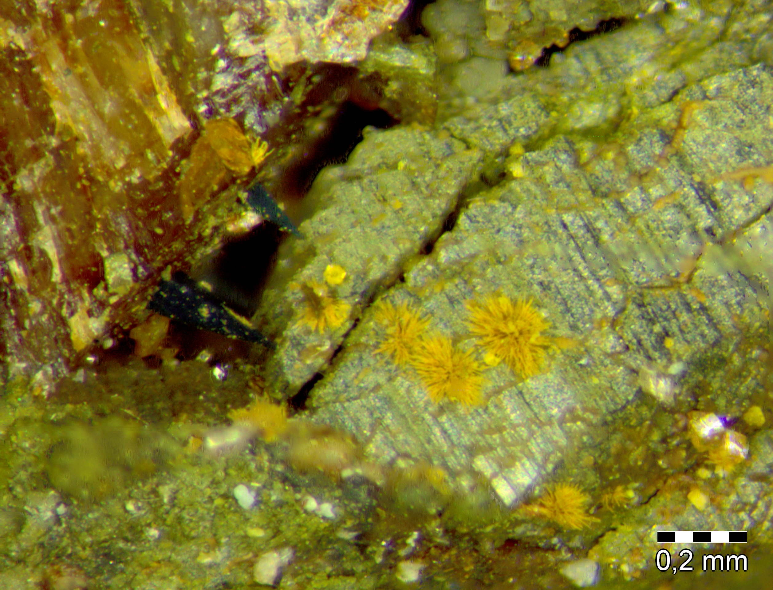 Kakoxen wäre als einziges Sekundärphosphat schon sehr ungewöhnlich und da das Material untersucht ist, wird es auch kein Karibibit sein.