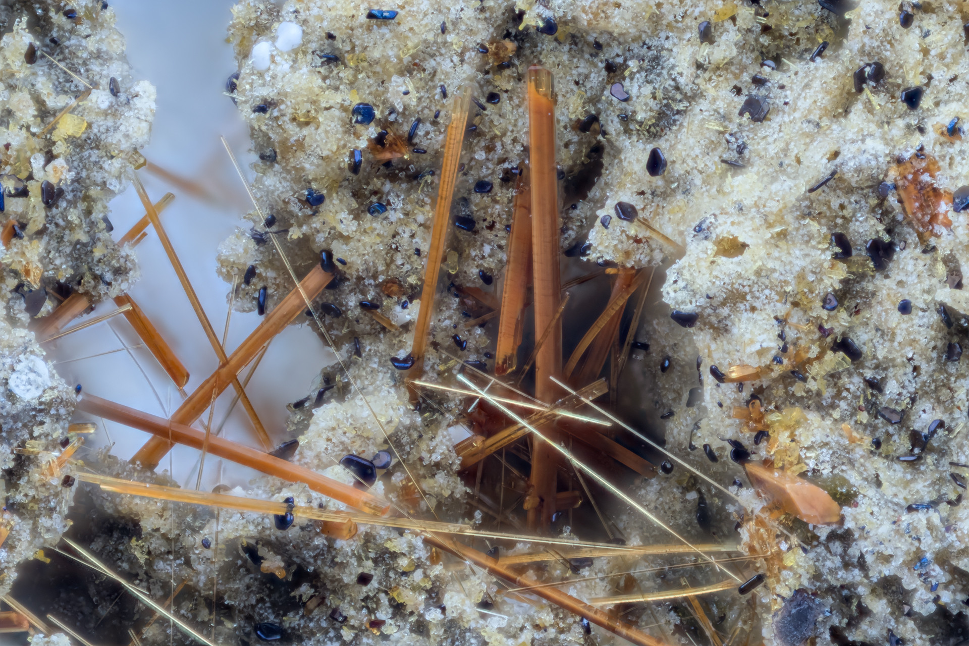 Ich hätte hierzu folgende Frage: Könntet Ihr mir an Hand der beigefügten Fotos (die Bildbreite beträgt jeweils 4,5 mm)Hinweise geben welche Mineralien es sein könnten, und um welchen Fundort es sich handeln könnte.