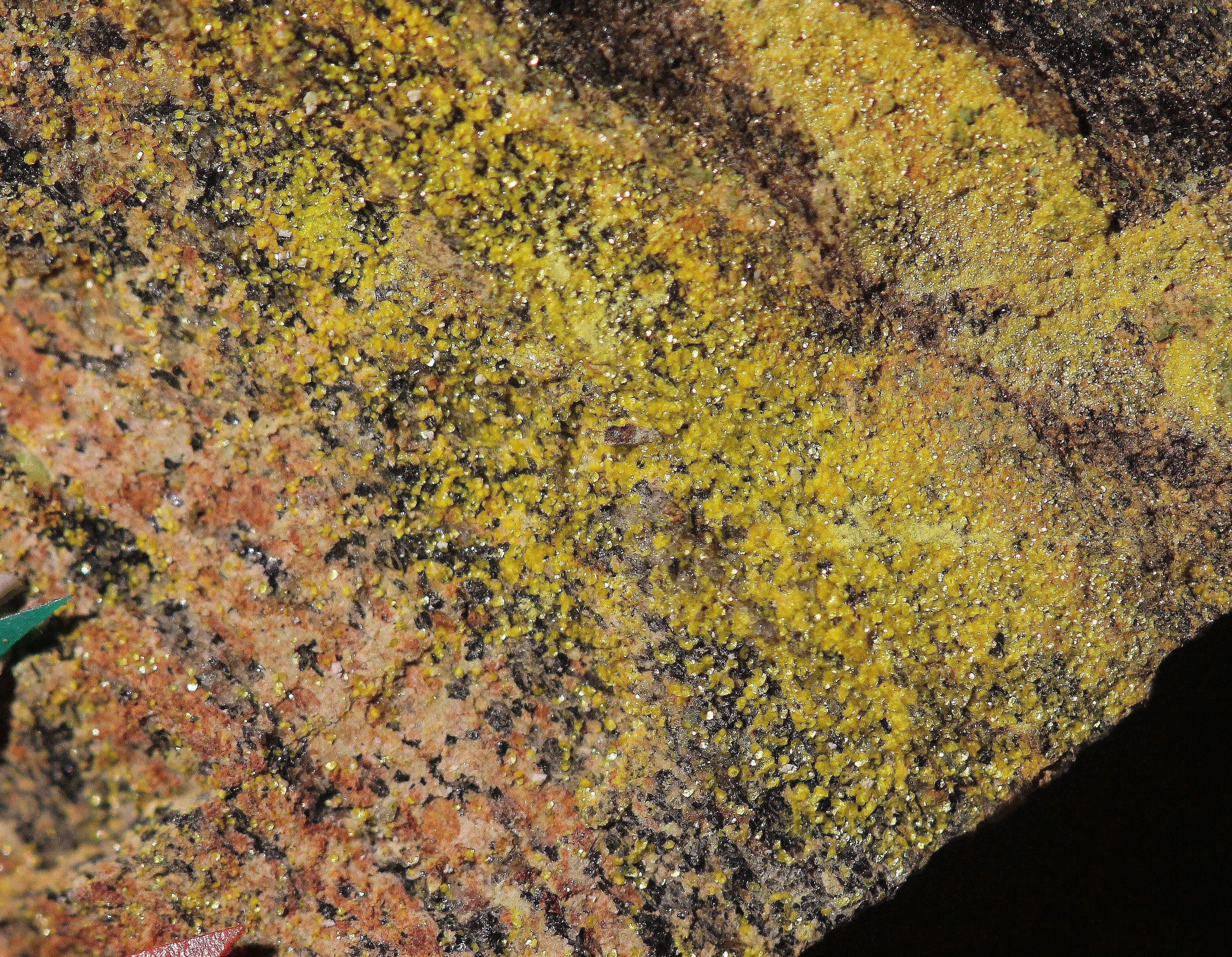 Wie gesagt, ich zweifle nicht an, dass auf dem Stück irgendwo Phosphuranylit gemessen wurde. Ich zweifle sehr wohl an, dass der Punkt auf dem nämlichen Bild liegt. Die Kristallform passt nicht und ist überdies identisch mit dem Bild zum Meta-Ankoleit (dazu passt es auch besser). Letztlich kann auch beides den dort häufigen Metavanmeersscheit zeigen.