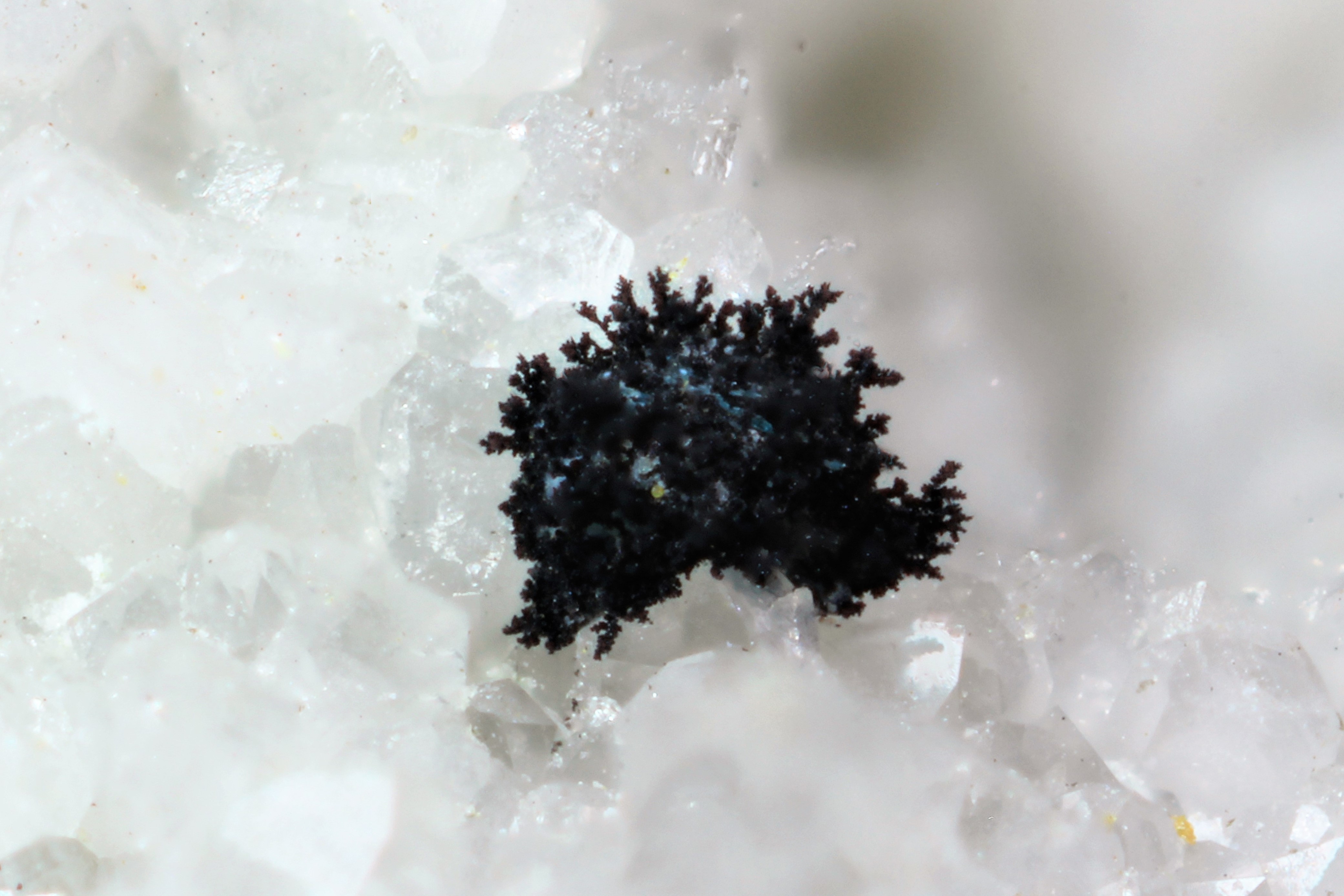 Dies ist an sich das einzige Bild in der Galerie, welches in mir größere Zweifel hervorruft. Man erahnt einen zersetzen Kupferkies (?) unter den Aggregaten. So ist auch hier vermutlich ein Kupfersulfid vorliegend.