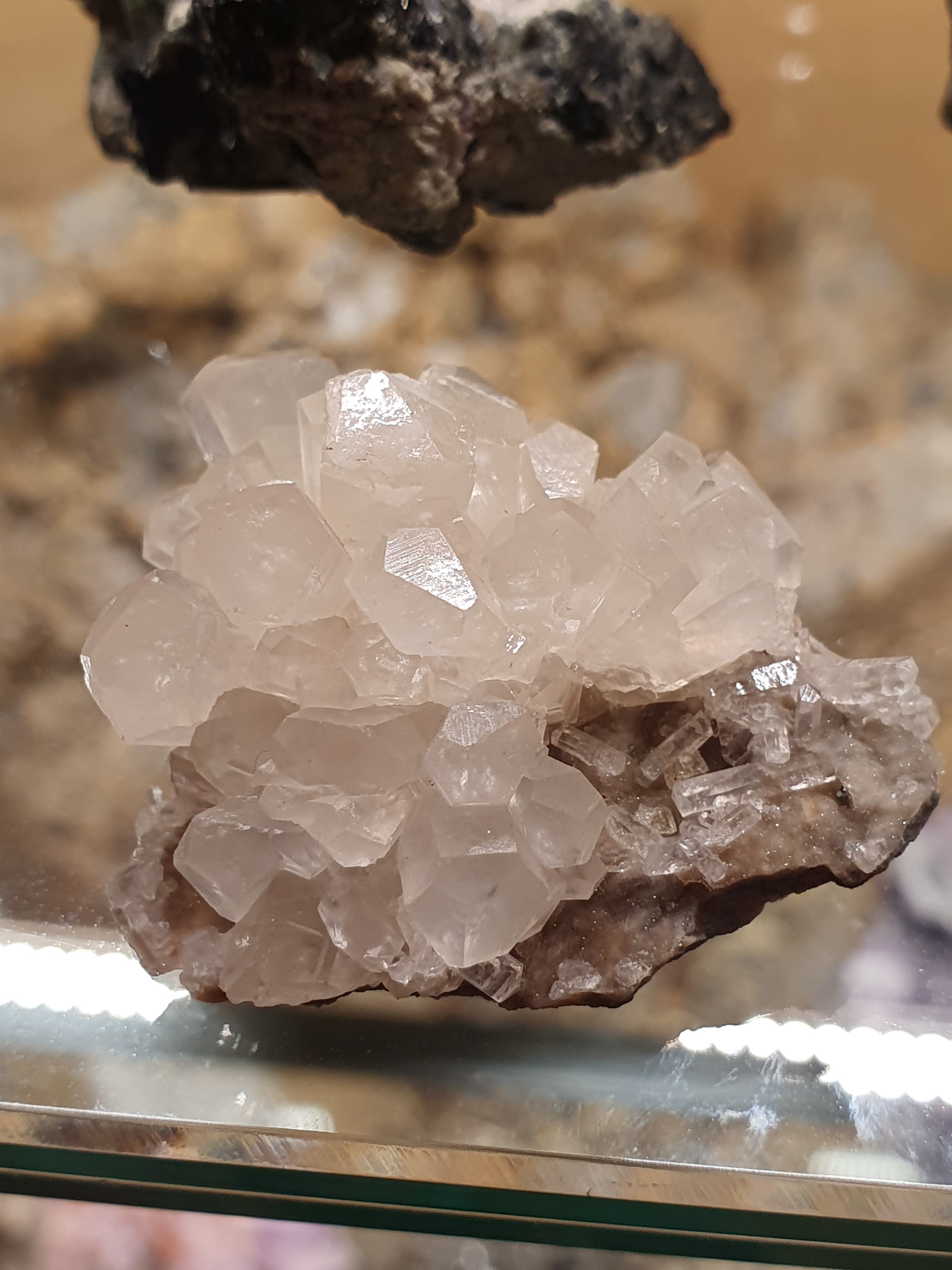 Die Interpretation zum Kanonenspat hingegen sehe ich aufgrund der Ermangelung dafür für mich eindeutiger Merkmale mit Vorbehalt. Meiner Ansicht nach dominieren hier die Rhomboederflächen den Habitus der Calcite. Eventuell könnten die kleinen langgestreckten Kristalle im unteren rechten Quadranten des Abbilds der Stufe den Anforderungen für einen Kanonenspat genügen.