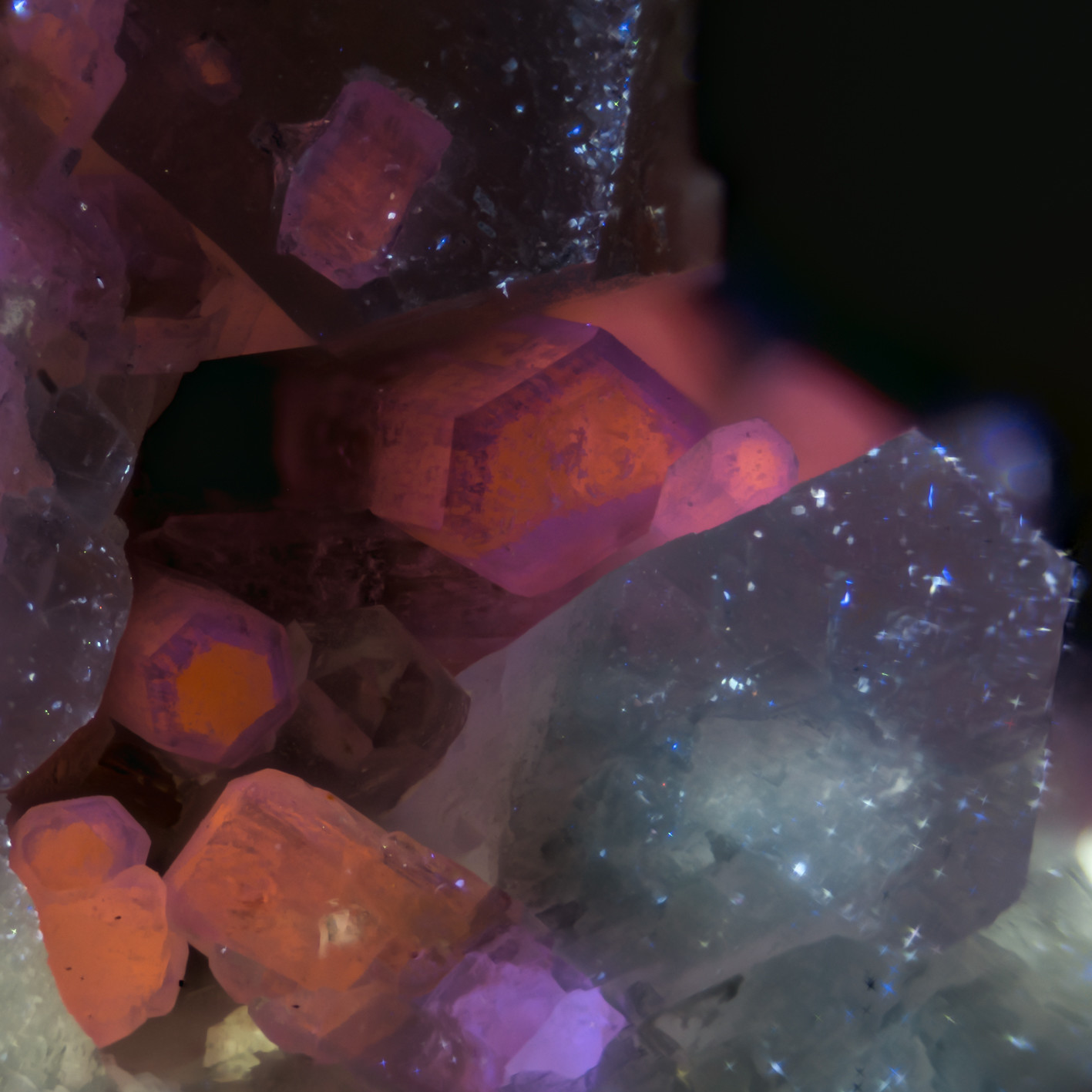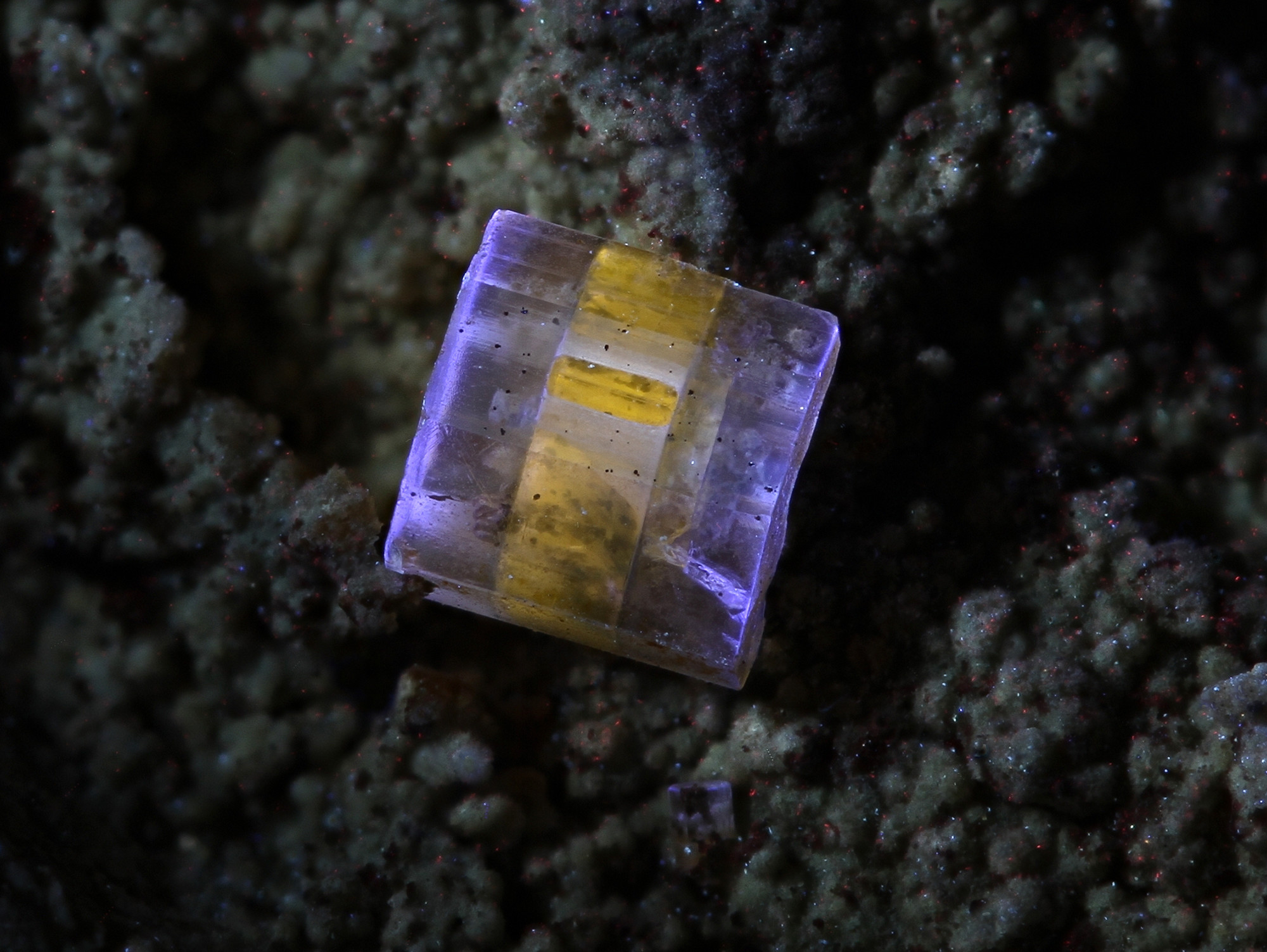 Zum Geschmack anregen eine Gruppe zoniert leuchtender Fluorapatite von den Steinbrüchen in Grub. Die Farben sind deutlich anders. Mehr dazu später.