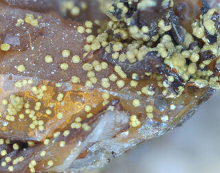 Dieses gelbe Mineral bildet Krusten auf Calzit und Quarz. Der Quarzkristall dürfte 1mm groß sein.
