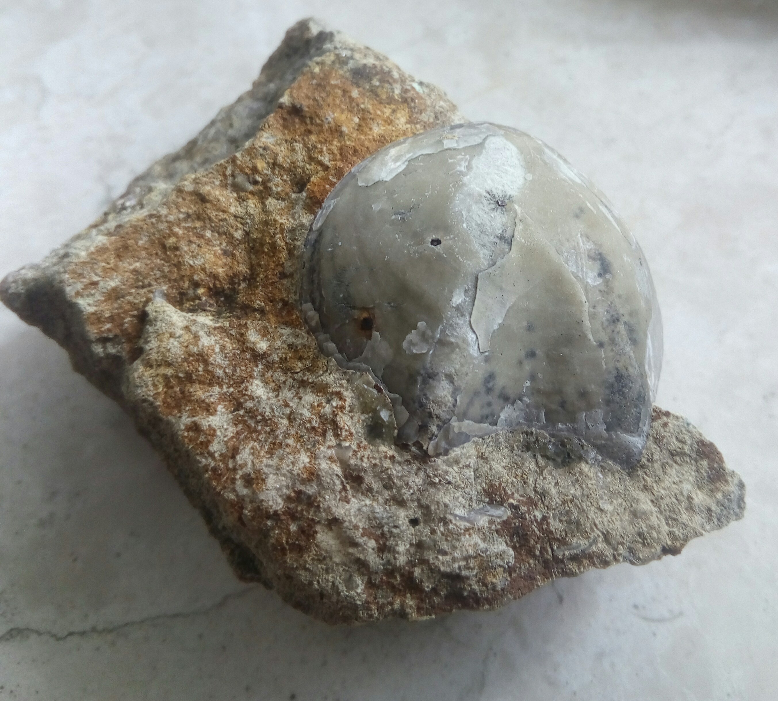 Das erste ist eine kleiner Calcit auf Matrix, der vorher mit Eisenoxid oder Limonit überkrustet war. Das zweite ist ein Fossil im Monzonit, dass ich vorsichtig frei präpariert habe. Vielleicht kann mir Steinfried oder wer noch, sagen, was das für ein Fossil ist.