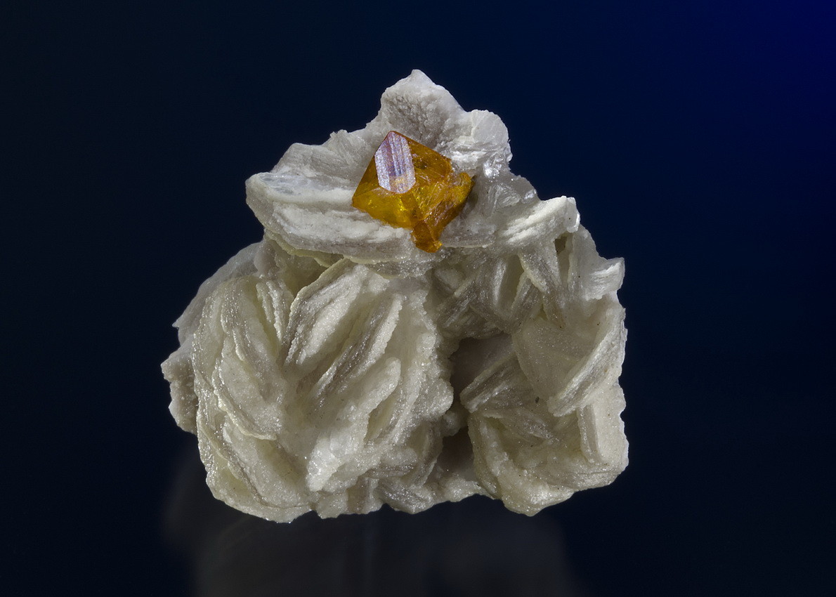 Soweit ich die Fundstelle kenne, würde ich dieses weiße, mir blättrig aufgebaut und hexagonal kristallisierte Mineral als Hellglimmer (Muskowit?) ansprechen. In meiner Sammlung finden sich Granate (Spessartinmischkristalle) in eben dieser Paragenese zusammen mit säulig ausgebildeten und schiefwinklig begrenzten Feldspäten.