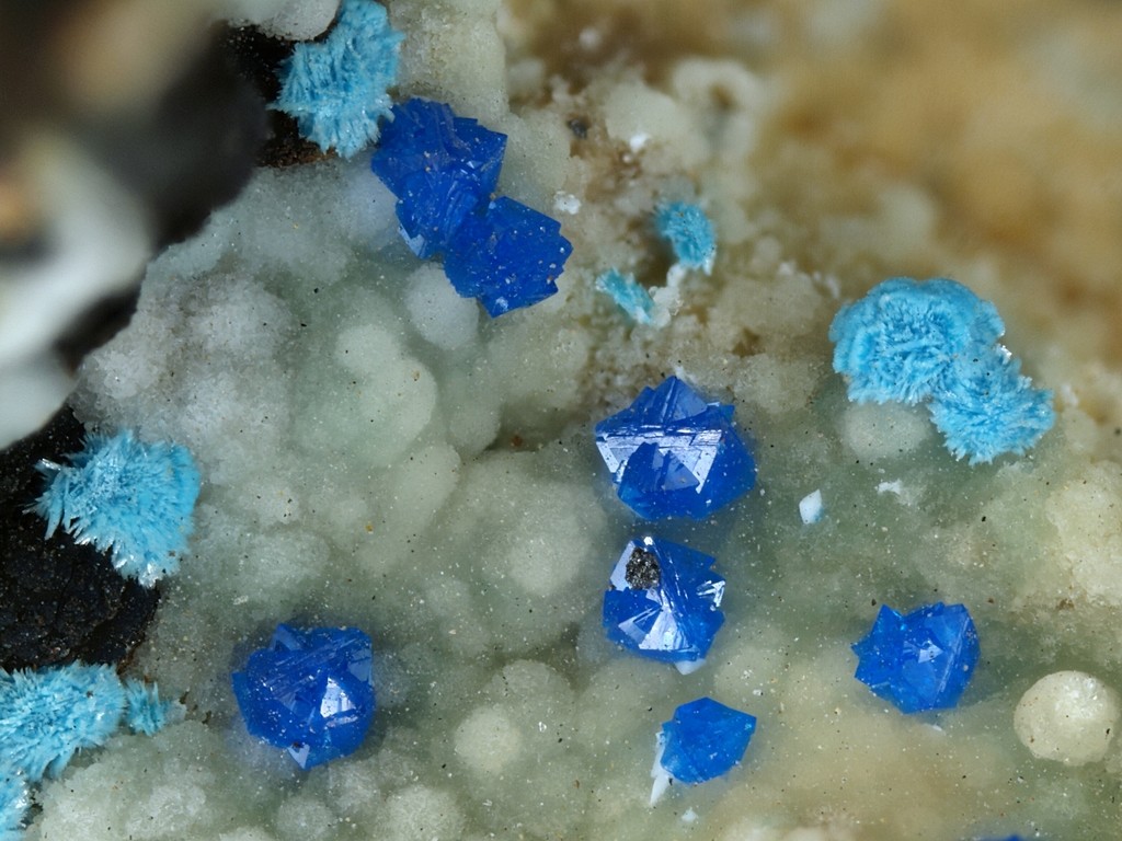 Das Bild zeigt einige schöne blaue Kristalle, bzw. Kristallaggregate, die der Beschriftung nach wohl Cumengeit sind. Besonders die Kristallaggregate in der Bildmitte werfen bei mir einige Fragen auf, letztlich auch, ob es tatsächlich Cumengeit ist.