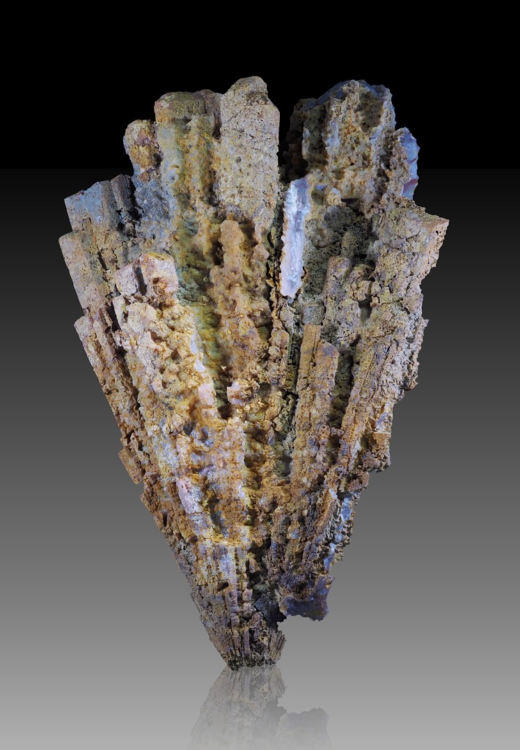 Mein erster Fund für dieses Jahr stammt aus Hoppstädten-Weiersbach. Es handelte sich um eine vom Trecker angebrochene große Mandel (etwa 22 cm Durchmesser) aus massivem Quarz. Nach einem enttäuschten Fusstritt gegen die unnütze Kugel zerbrach sie entgültig und offenbarte diese schöne Pseudomorphose von Achat nach verzwillingtem Aragonit.