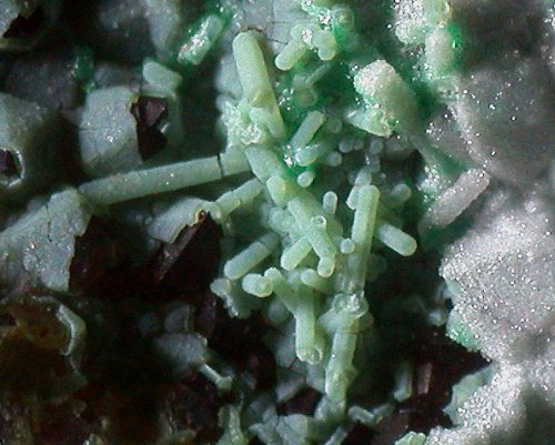 Es wirkt eher so, dass der Chrysokoll Nadeln eines anderen Minerals überzieht. Die Nadeln können noch da sein und in der Mitte von diesen Stangen stecken.
