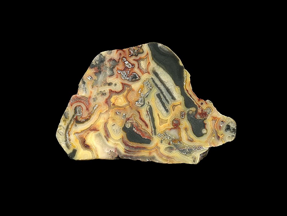 vom Aussehen her würde ich ja eine Beteiligung einer Pseudmorphisierung oder Perimorphisierung vermuten, wodurch die abgetrennten Kammern entstanden sind. Es sind keine scharfen Begrenzungslinien zu sehen, was erst einmal nicht viel bedeuten muss. Es ist gut möglich, dass die räumliche Fixierung der Kristallgeometrie oder Bruchstücke erst einsetzte, als schon einiges an Mineralsubstanz weggelöst wurde. Es sind einige große Trendlinien in dem Stück zu sehen. Dass lässt die ehemalige Anwesenheit einiger großer Kristalle vermuten. Baryt, Fluorit, Calcit sind Minerale, die häufig große Kristalle bilden und auch häufig in der Parageneseabfolge zeitlich vor einer Achatbildung entstehen.