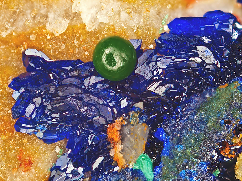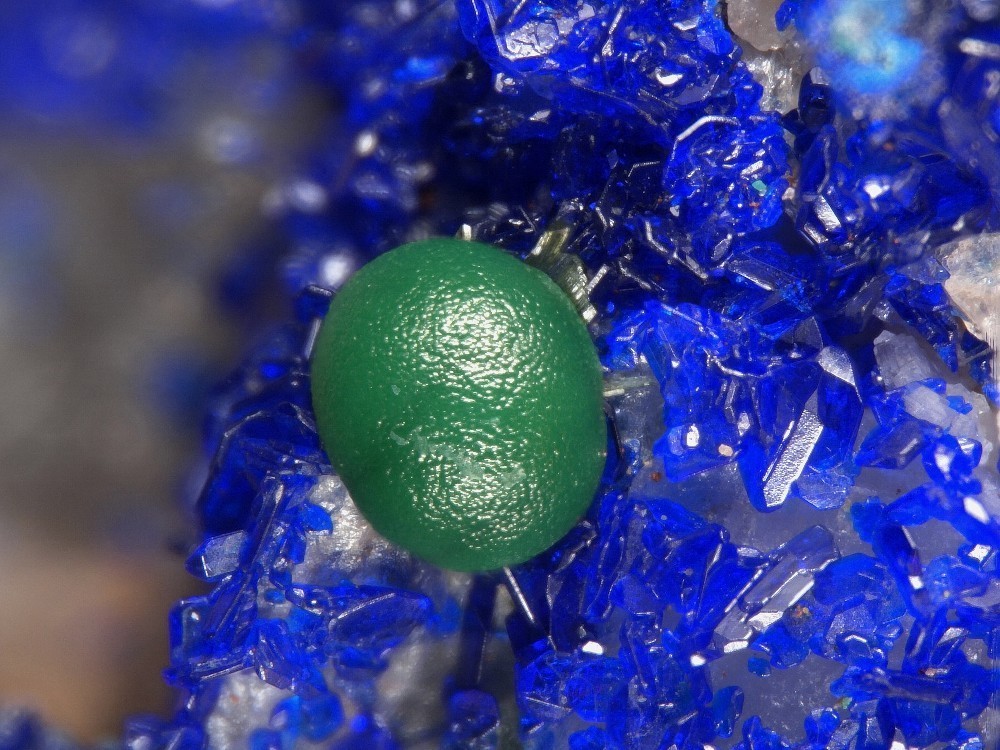Ein wunderschönes Bild, aber was ist denn das für eine auffällig grüne Murmel in dem Azuritnest? Es gibt ein anderes Bild mit einer ähnlichen Konstellation aus grüner Murmel auf Azrit: