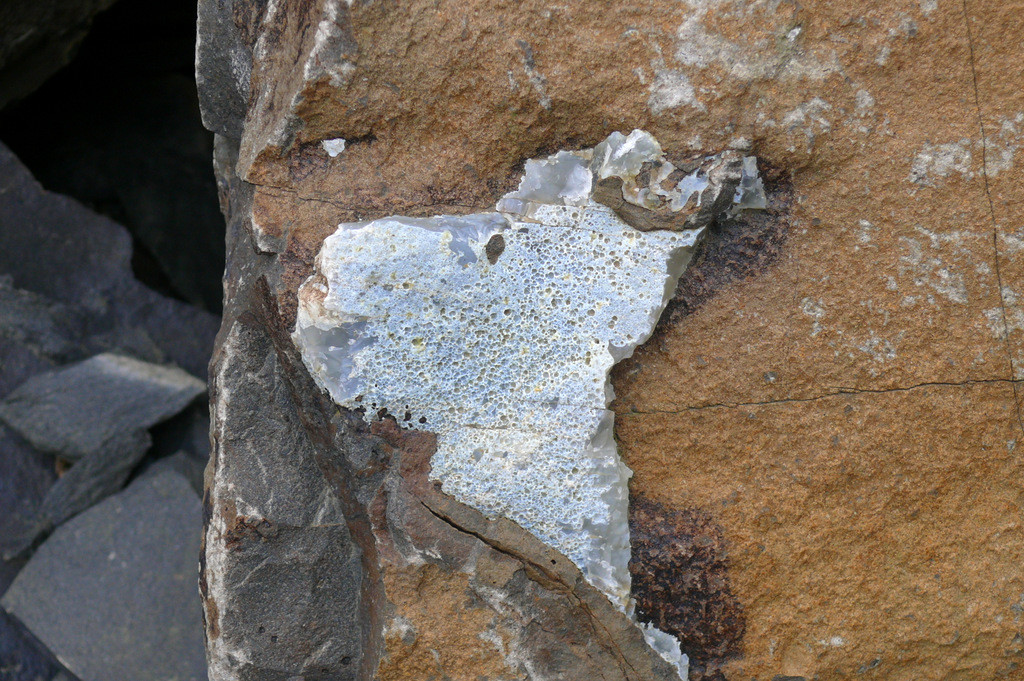 Bild a bis d: Ja, eindeutig eine Murmel in einem basischen Ergussgestein (Mutmaßung). Diabas, Melaphyr/Mandelstein, Basalt, Andesit sind so übliche Gesteine, in denen man solche Murmeln finden kann. Sie können mm klein bis m groß sein. Vorkommen mit guten Aufschlüssen und nicht ganz so weit weg sind bei Idar-Oberstein in Deutschland, Turnov in Tschechien und Swierzawa in Polen, aber darüber hinaus weltweit zu finden. Einige Beispiele sind hier: