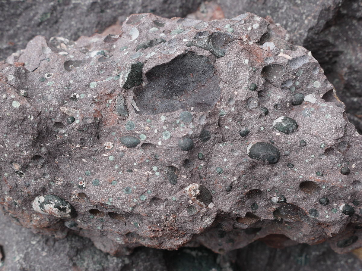 Die Form kann dabei von kugelrund, belemnitenförmig gelängt bis flatschig flach variieren. Inhalte sind häufig Calcit, Quarz und Chalcedon, Zeolithe und weniger häufig dann eine Vielzahl weiterer Minerale. An vielen Vorkommen sind die Mandeln durch eine mechanisch schwache Mineralschicht vom Gesteine getrennt, was die Bergung begünstigt. Der grüne Delessit ist dabei eines der häufigen Minerale. Eine gute Trennung von Gesteinsbestandteilen aus der Gesteinsmatrix ist kein Unterscheidungsmerkmal für Fossilien und Minerale.