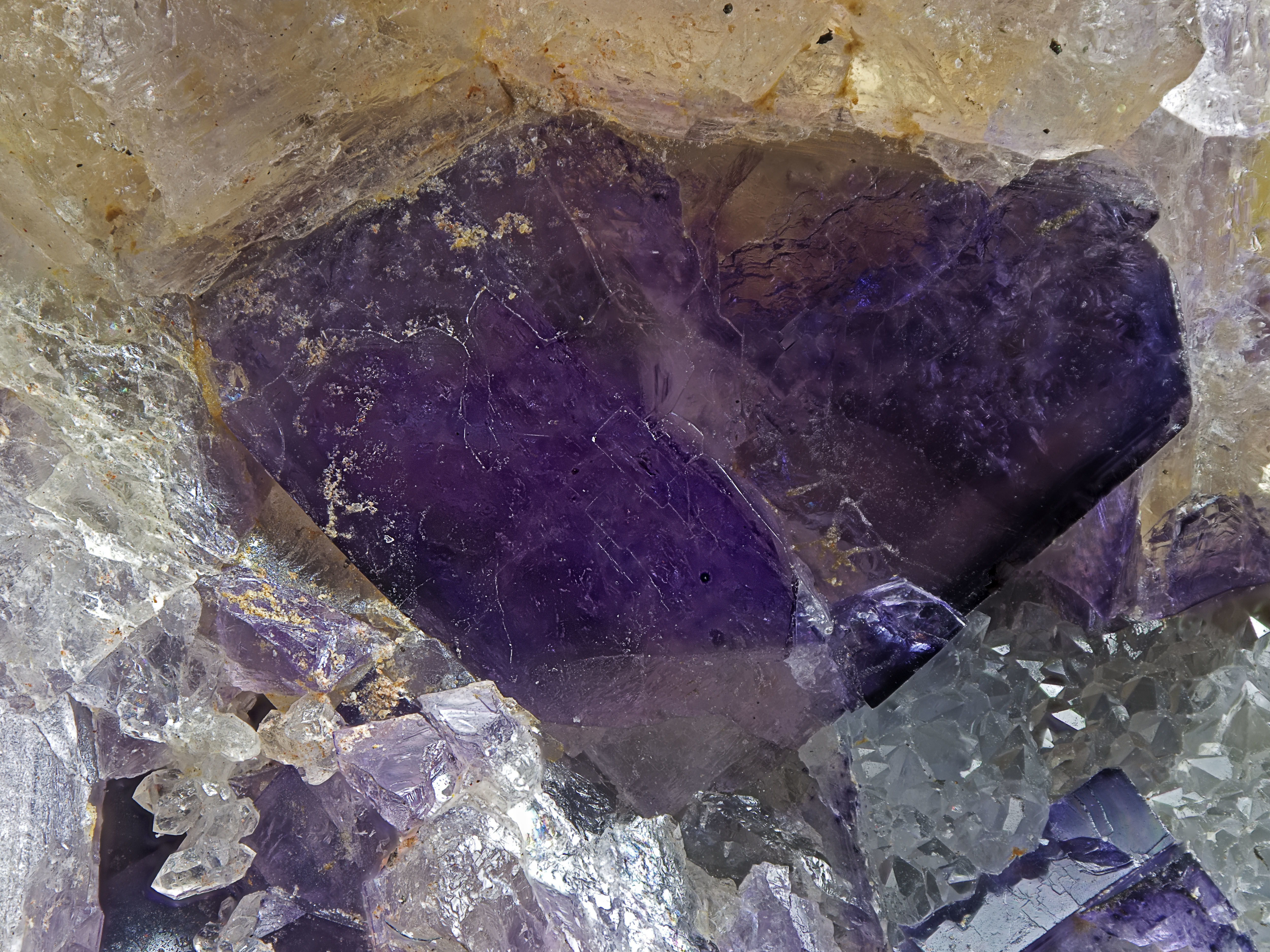 Es dürfte sich um violetten Flußspat (beschädigter Kristall) handeln, dafür sprechen auch die Wachstumslinien auf den Flächen. Apatit von Naundorf sitzt nie auf hydrothermalem Quarz, sondern stets in Pegmatitdrusen und kommt entweder in Form (grau-)grünlicher säuliger oder farbloser flächenreicher Kristalle vor.