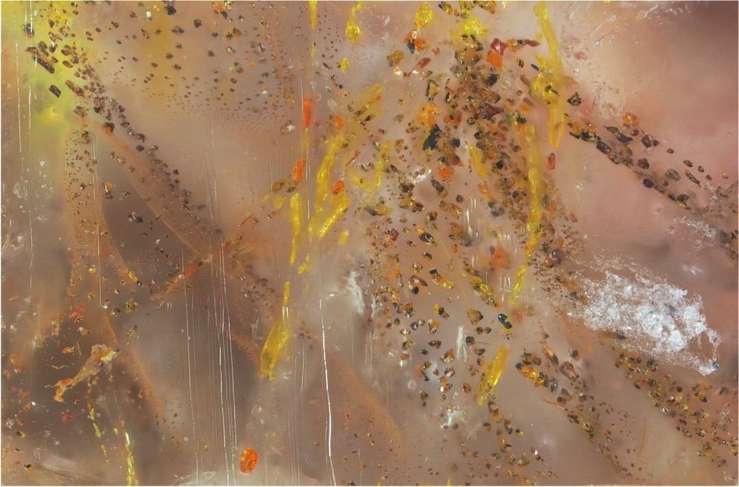 3. In Quarzkristallen von der Grube Lengenbach bleibt Realgar als Einschlussmineral unverändert erhalten. Die gelben Phasen im Quarz sind amorphe Arsensulfidgläser.
