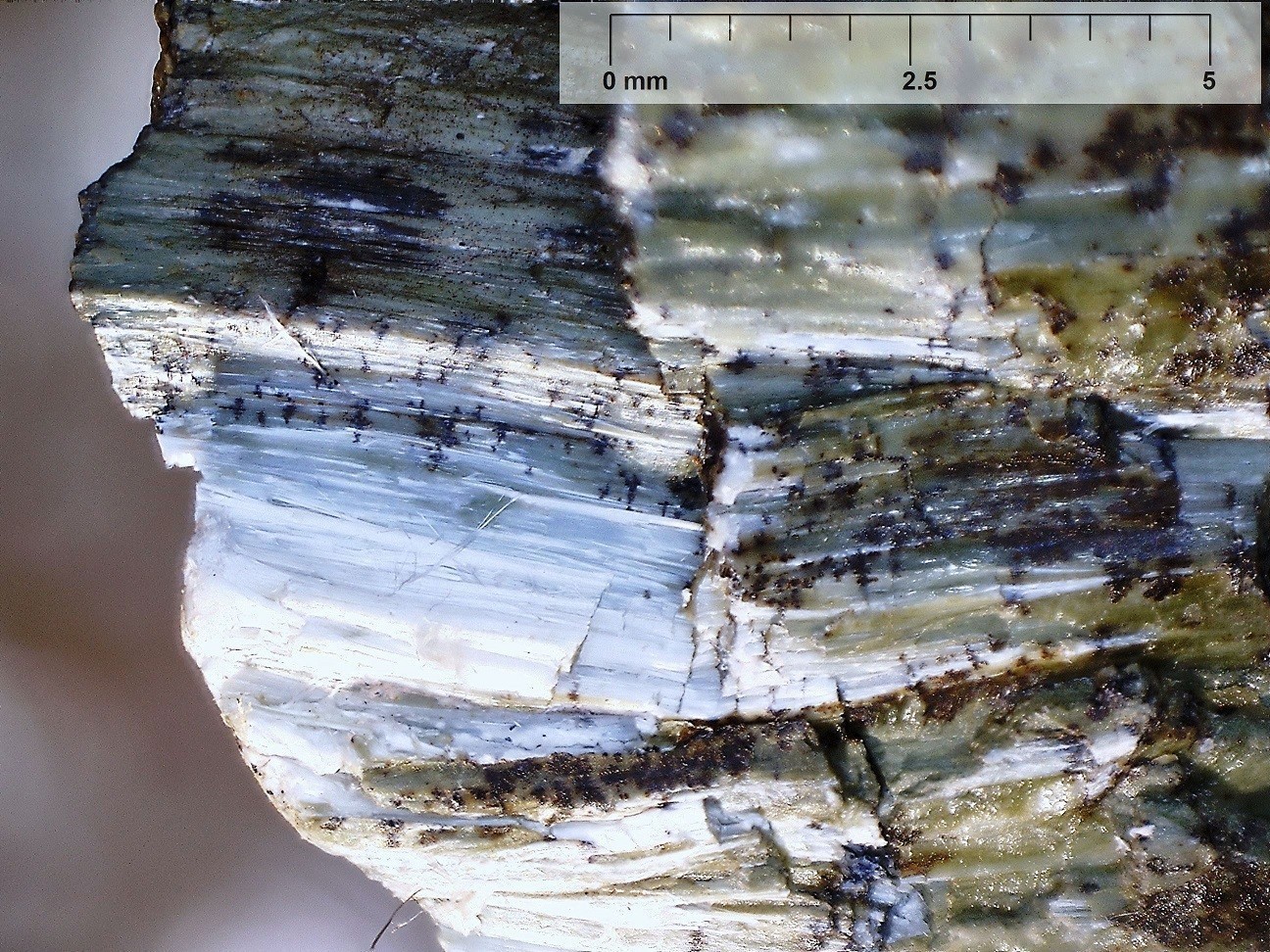 Serpentinitgestein bsteht aus einem maschenartigen Gefüge von Antigorit und Chrysotil, das ehemaligen Olivin ersetzt, neben Anteilen von +/- zersetztem Enstatit und Chromspinell (Chromit, Picotit). Chrysotil bildet sich gern in Scherklüften als Asbest.