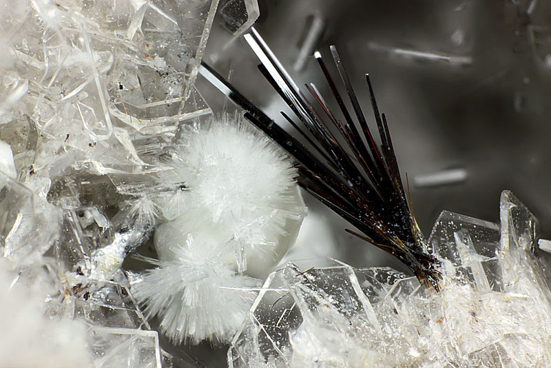 Die farblosen, tafeligen Kristalle dürften Sanidin sein. Was sind die auffälligen weißen Igel?