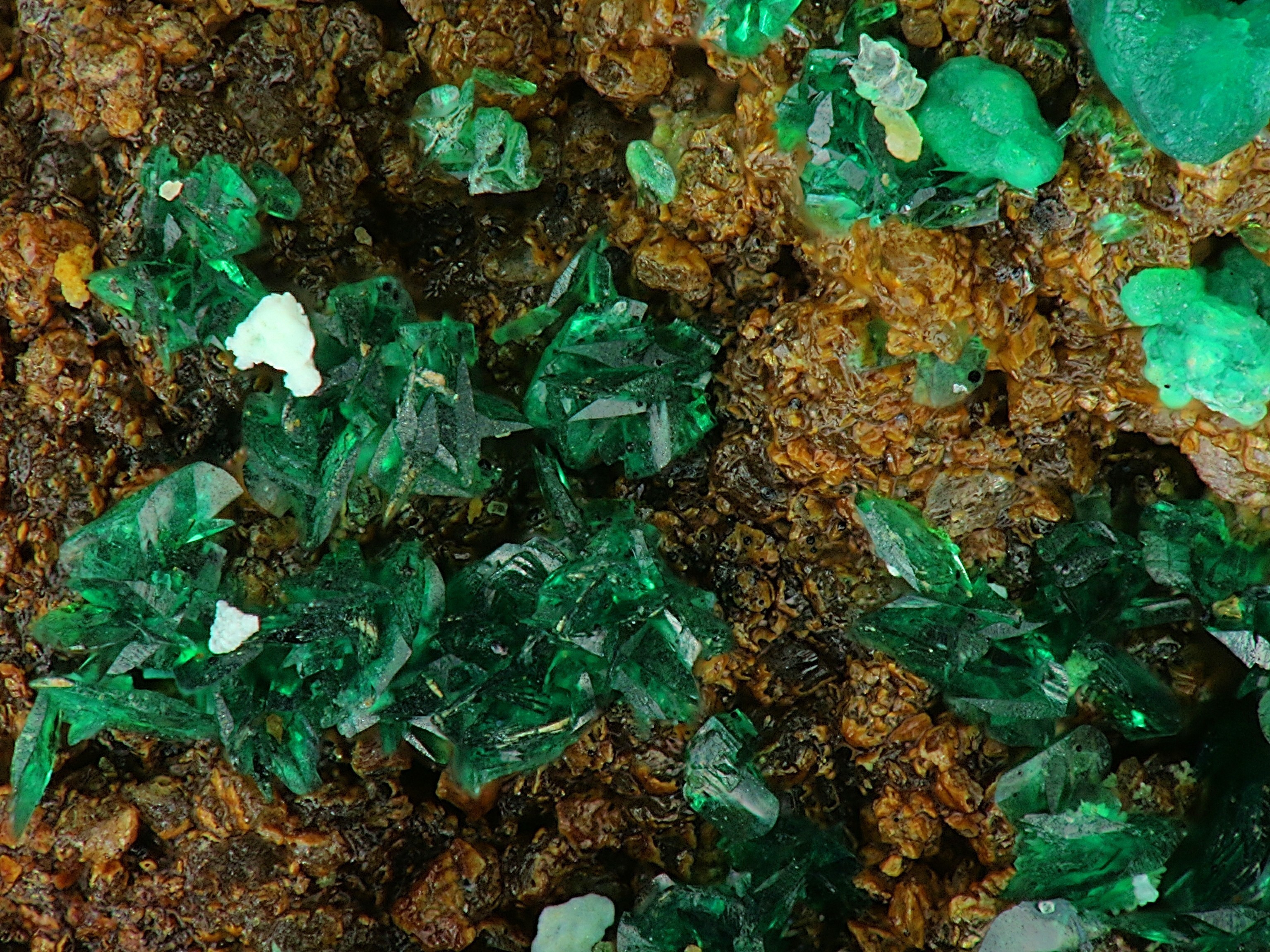 Da Malachit und Strashimirit beides grüne Minerale sind, möchte ich fragen, wo sich diese auf dem Bild befinden. Ich vermute mal die grünen traubigen Aggreate oben rechts als Malachit und die hellgrünen kleinen Aggregate links im Bild auf dem Brochantit als Strashimirit. Wo ist der im Text erwähnte Azurit?