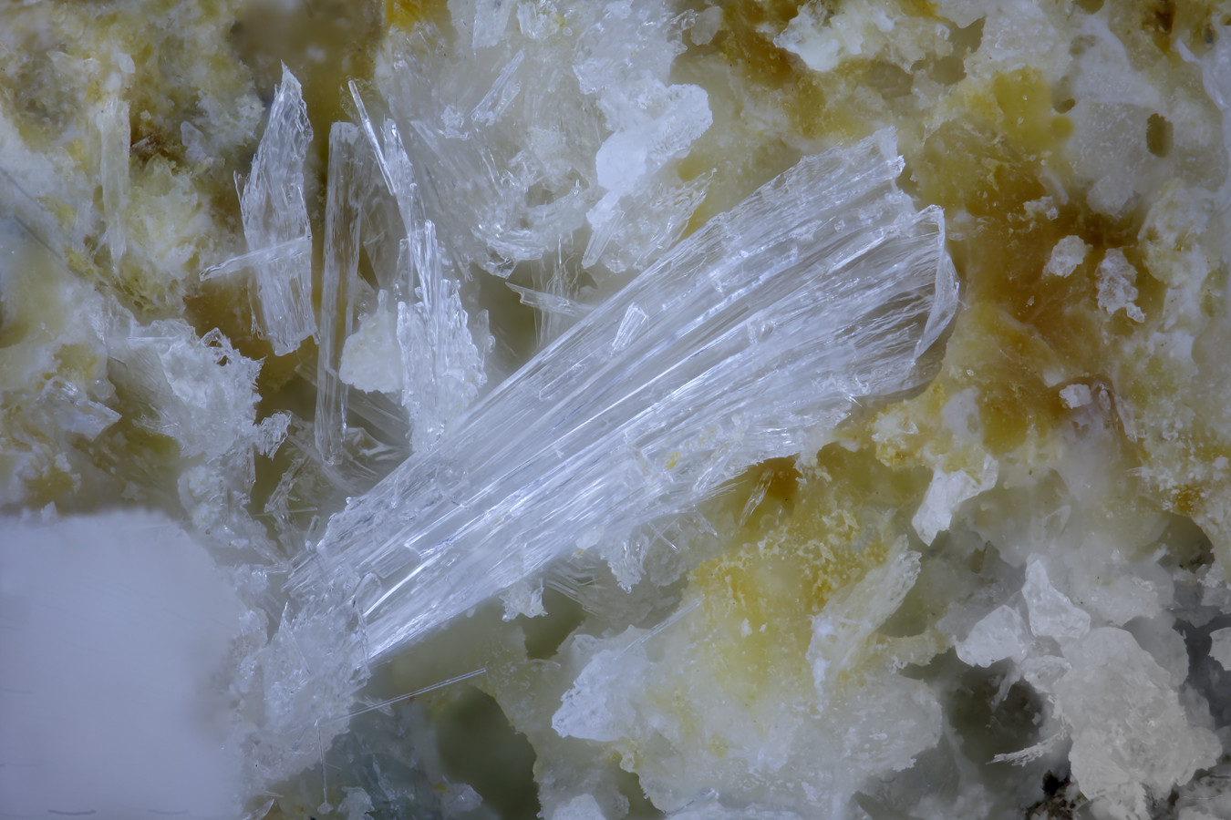 ich bin mir auch nicht sicher aber Gips passt für mich nicht so gut in die Kalksilikat-Paragenese vom Wimhof. Könnte es ein Tremolit-Fragment sein?