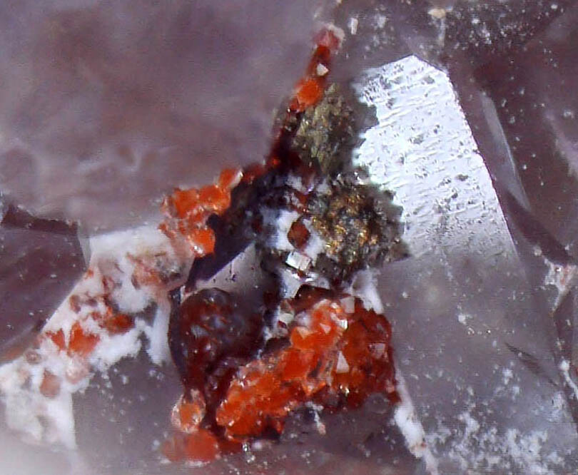Die Kristallform der intensiv roten Phase passt nicht zu Zinnober. Ich erkenne eigentlich typische Quarzflächen - also wären es wohl kleine Eisenkiesel. Paragenetisch würde sich hier Quarz auch besser einfügen als Quecksilbersulfid.